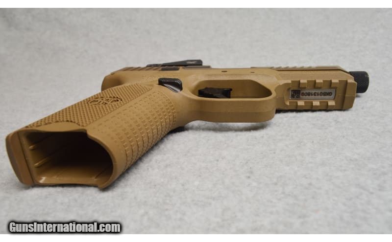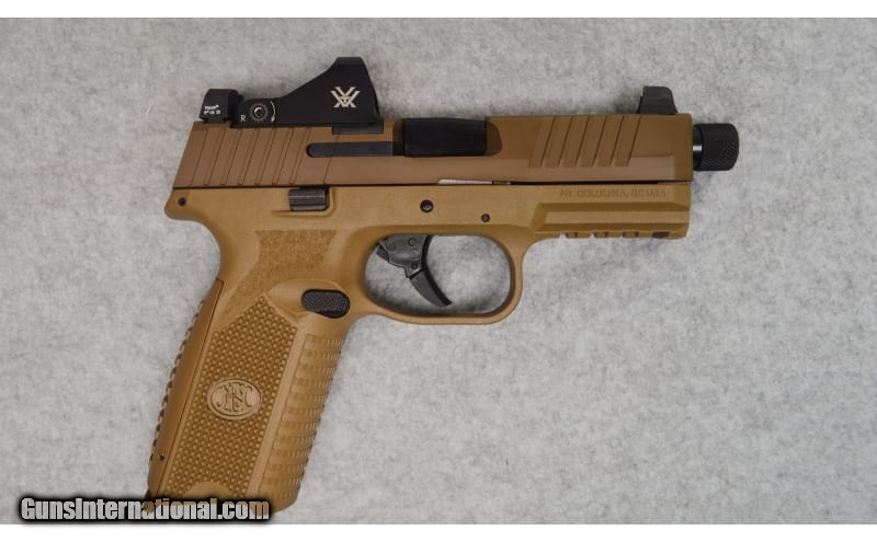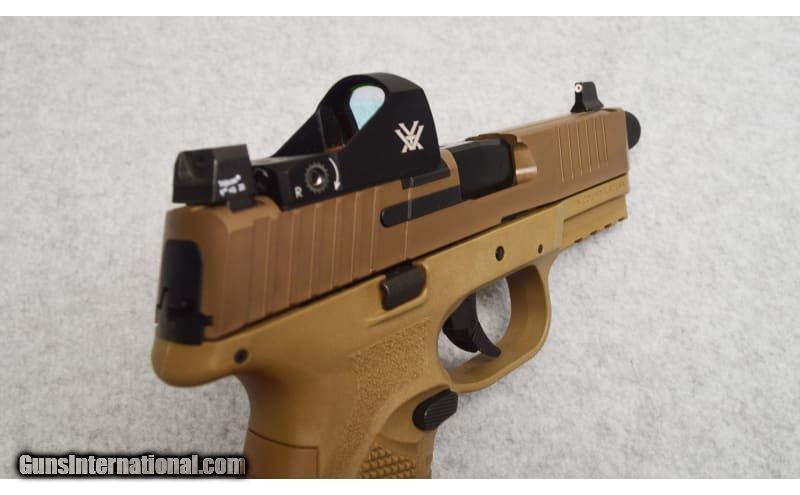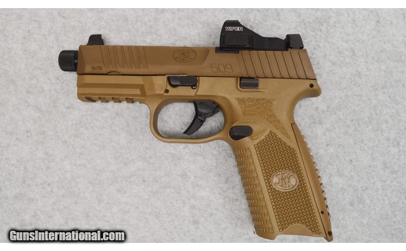 Description: This FN Model 509 is a right hand semi-auto pistol in 9 mm Cal. It has a 4.25 inch threaded end barrel with a front and rear serrated slide. A blade front sight and notch rear sight with 3 luminous sight dots. It is outfitted with a Vortex Viper red dot sight. The grip is a deep-checkered dark tan polymer. It has a lower accessory rail. 9mm Luger SOLD Barrels: 4.5 in Weight: 5 lb Item Location: Avon, OH |