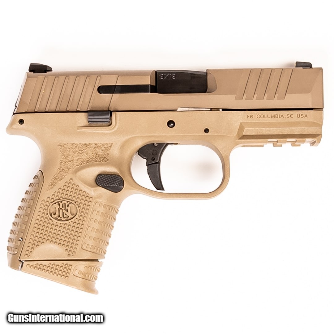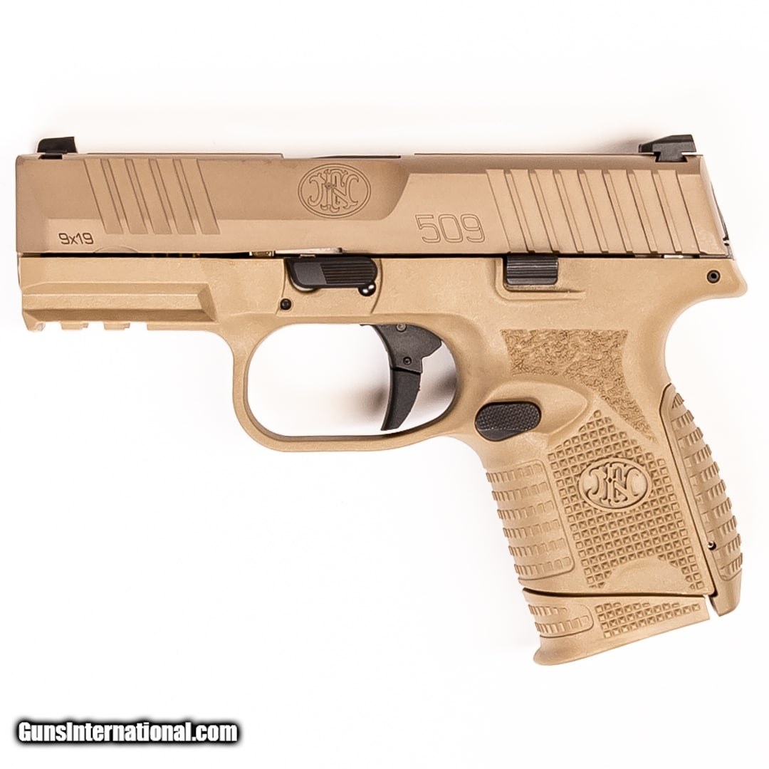 Description: Guns Listing ID: 408819 The FN 509 Compact is a semi-automatic handgun well-equipped for personal protection, duty use, and tactical applications. If you‚‚re in the market for a dependable pistol that‚‚s accurate, built to last, and loaded with features, this FN 509 Compact is a great choice! This model includes the original box, soft case, manual, two 10-round magazines, and two sizes of backstrap SOLD Manufacturer: FN Model: 509 COMPACT Caliber Info: 9MM LUGER Condition: Used - Certified Barrels: 3.7 BARREL Finish: FDE |