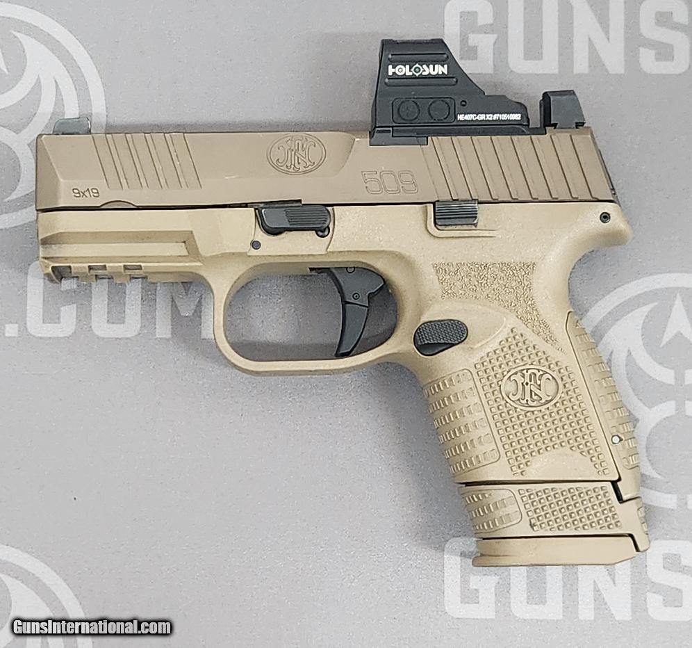 Description: Guns Listing ID: 401608 Inventory Number: FCN024565 FN HERSTAL 509 MRD, SEMI-AUTO, 9MM, FLAT DARK EARTH, 3.7\" Barrel Length OPEN TO OFFERS Very Good Condition Handgun Comes with One OEM Magazine HOLOSUN HE407C-GR X2 Comes Attached No Additional Optics Plates or Backstraps Included Specific Details: NRA Modern Gun Condition Rating Standards: VERY GOOD: In perfect working condition, no appreciable wear on working surfaces, no corrosion or pitting, only minor surface dents or scratches. Finish / Color: Flat Dark Earth Case & Box: No - Not Included Magazine: Yes - and includes 1 extra magazine Optic: Yes - Red Dot Sight Holster: No - Not Included SOLD Manufacturer: FN Model: 509 MRD Caliber Info: 9MM LUGER (9X19 PARA) Condition: Used - Non-Certified Barrels: 3.7 BARREL Action: SEMI AUTOMATIC Finish: FDE Weight: not specified |
