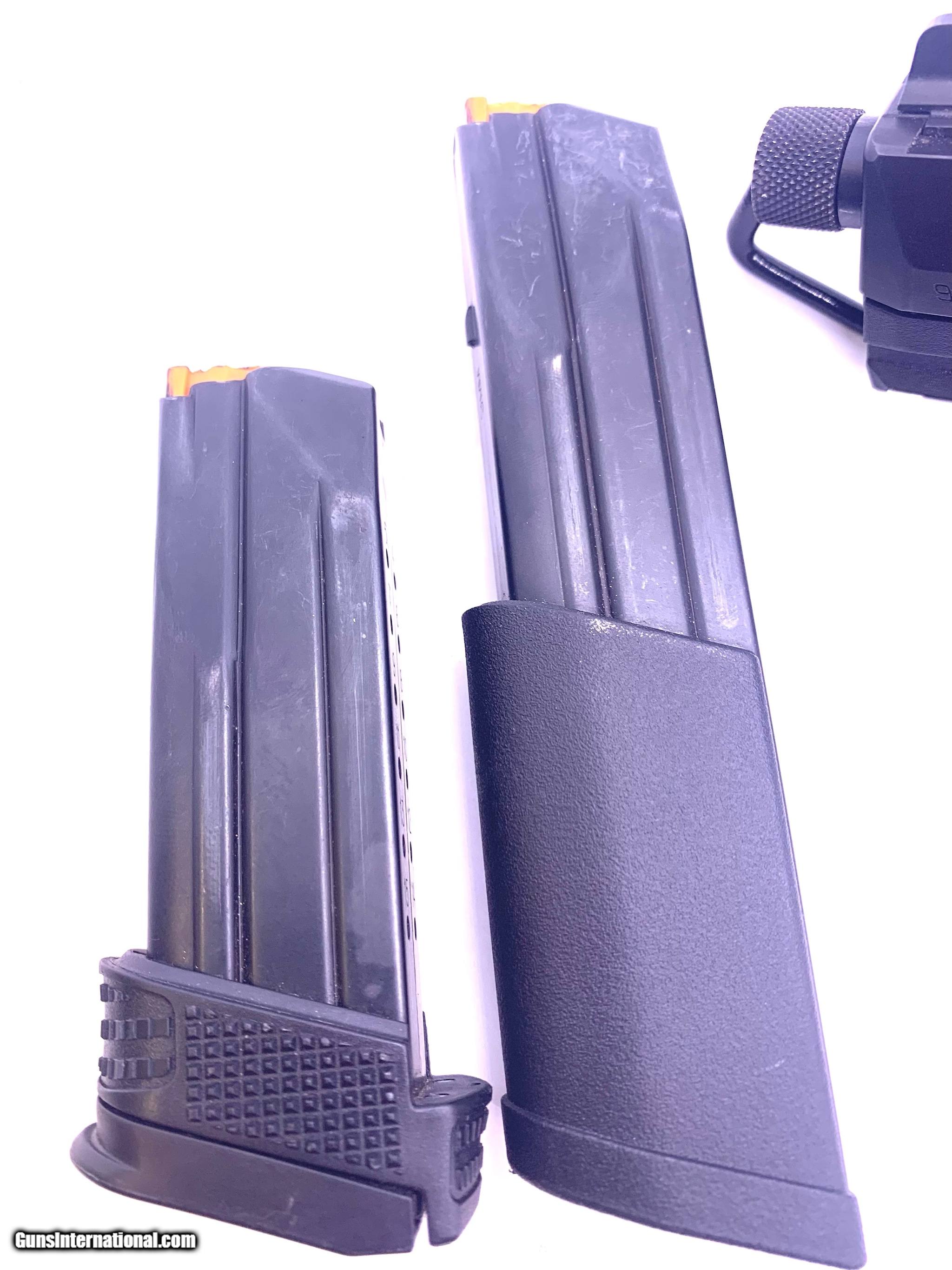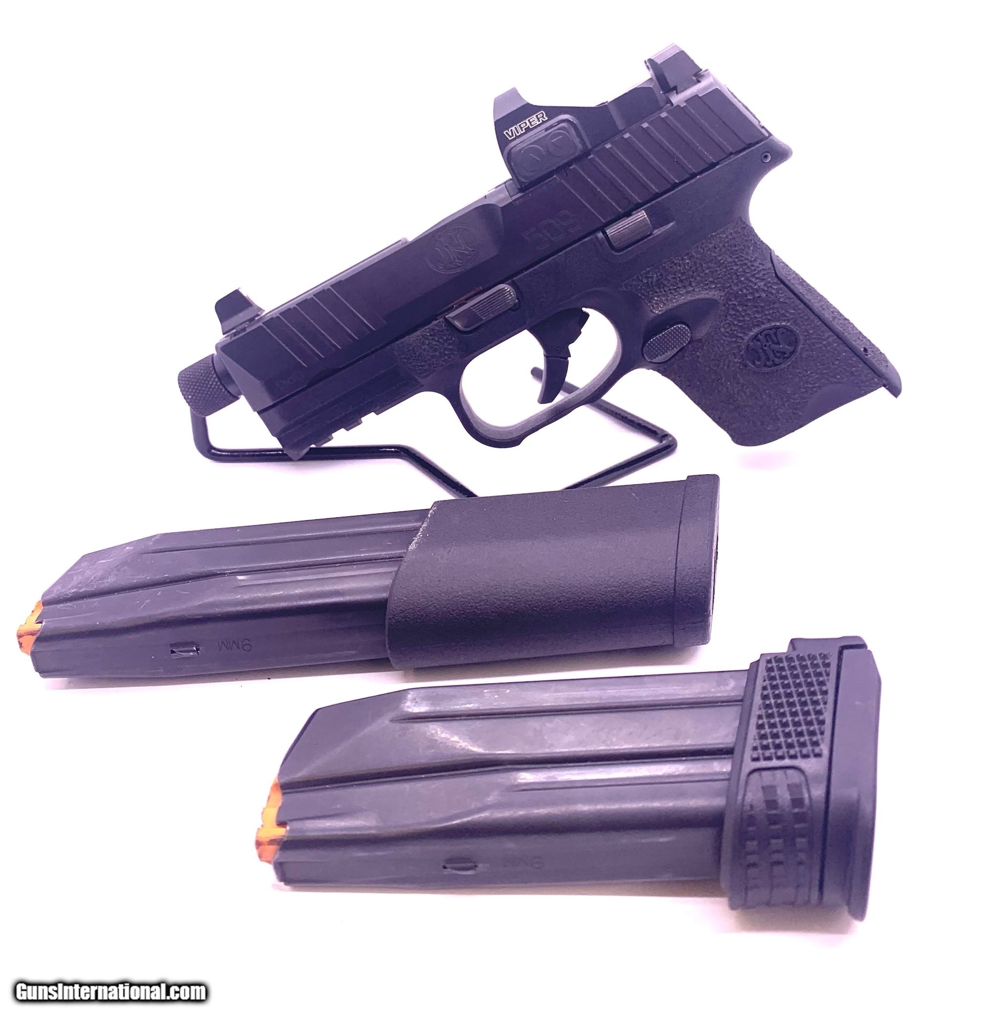 Description: Guns Listing ID: 927827 The FN® 509™ Tactical Semi-Auto Pistol with Vortex® Viper Micro Red Dot Sight Package delivers superior reliability, impeccable accuracy, and maximum firepower with extended magazines and a full-size frame. Featuring a 4.5\" cold hammer-forged stainless steel barrel with a recessed crown, and a polished feed ramp and chamber, this pistol promises optimal accuracy and ultrareliable performance. The FN Low Profile Optics Mounting System, coupled with the Vortex Viper red dot (included), easily co-witnesses with the all black co-witness iron sights for enhanced point-and-shoot accuracy. The 1/2x28\"-threaded barrel readily accepts a variety of aftermarket muzzle devices and suppressors, while the integrated accessory rail readily accepts a variety of aftermarket lights, lasers, and other accessories. Plus, this pistol features an ambidextrous slide stop lever and magazine release, and sports an aggressively texturized grip for a reliable non-slip grip. For a highly reliable, optics-ready package, the FN 509 Tactical Semi-Auto Pistol with Vortex Viper Micro Red Dot Sight is the ideal choice. Includes 2 magazines. Full-size frame Cold hammer-forged stainless steel barrel Polished Chamber and feed ramp Threaded barrel Aggressive grip texturing Accessory rail (MIL-STD-1913) Ambidextrous slide stop and magazine release FN Low Profile Optics Mounting System SOLD Manufacturer: FN Model: 509 TACTICAL Caliber Info: 9MM LUGER (9X19 PARA) Condition: Used - Non-Certified Barrels: 4.5 BARREL |