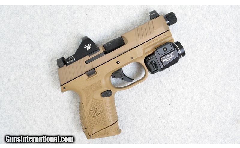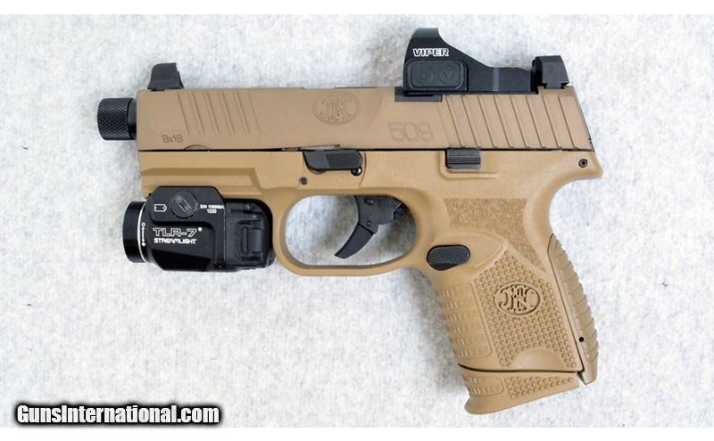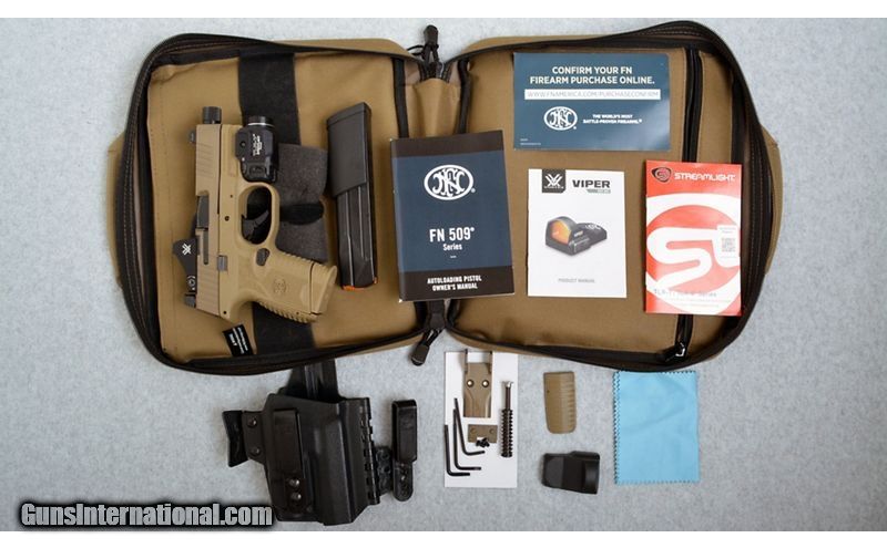 Description: This FN 509 Tactical FDE is a Striker-fired autoloader carrying a ton of features, including: FN Low Profile Optics Mounting System™, Threaded Barrel, Suppressor Height Trijicon 3-Dot Green Tritium Night Sights, External extractor-loaded chamber indicator, ambidextrous slide stop lever and magazine release. A cold hammer-forged stainless steel barrel with recessed target crown, polished chamber/feed ramp, and a 1/2" x 28 threaded muzzle w/ o-ring retention threaded cap. Comes with: Vortex Viper Red Dot w/ cover, a T.Rex Side Car holster accommodating the Streamlight TLR-7 picatinny mounted light, 2 recoil spring assemblies, 2 interchangeable backstraps, One 12-round and one 24-round magazine, 509 and Vortex Viper owner's manuals, FN logo soft pistol case. Won't Last Long! 9mm Luger SOLD Chambers: 9MM Luger Bore Condition: Excellent condition Barrels: "4.5"" Cold Hammer Forged Stainless Steel, 1/2"" x 28 threaded muzzle Triggers: DA Weight: 28 oz Sights: Vortex Viper Red Dot / Suppressor Height Trijicon 3-Dot Green Tritium Night Sight Item Location: Green Bay |