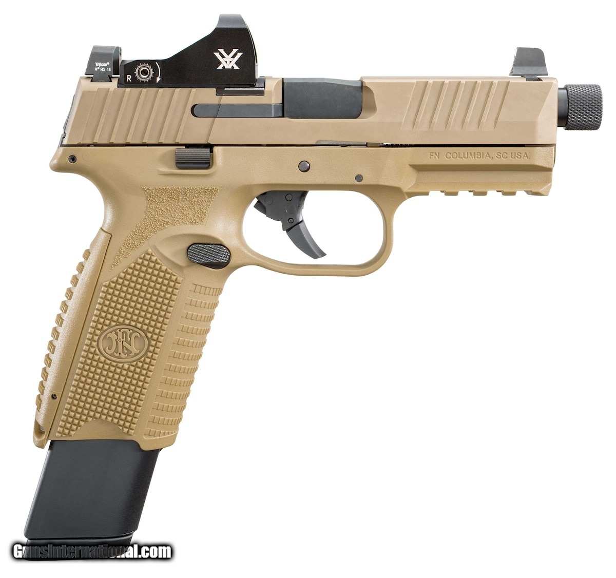 Description: Guns Listing ID: 485793 FN‚‚s 509 pistol is built on the proven architecture of the FNS Compact. It features a cold hammer-forged stainless-steel barrel with a recessed target crown and polished chamber and feed ramp. The polymer frame has an enhanced grip texture for faster follow-up shots in all conditions, a MIL-STD-1913 accessory rail, and interchangeable backstraps. This striker-fired double action pistol has an external extractor, loaded chamber indicator, and no manual safety. It is equipped with a fully ambidextrous slide stop lever and magazine release. This FN 509 Tactical model has a Flat Dark Earth slide with an FDE polymer grip/frame, two FDE interchangeable backstraps, and suppressor height night sights. This model comes with one (1) 17-round magazine, two (2) 24-round magazines, and a FN logo soft pistol case SOLD Manufacturer: FN Model: 509 Tactical Caliber Info: 9MM LUGER (9X19 PARA) Condition: new Barrels: 4.5" barrel Finish: FLAT DARK EARTH |