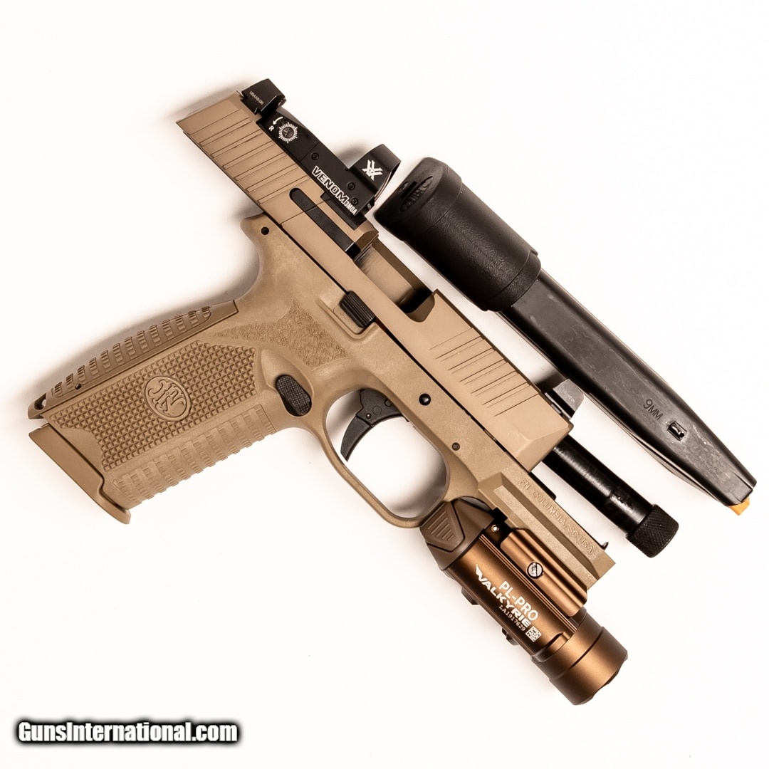 Description: Guns Listing ID: 554070 Rugged and dependable, the FNH FN 509 is a semi-automatic pistol well equipped for self-defense and tactical applications. This FN 509 has co-witness night sights, an Olight PL-Pro Valkyrie light, and a Vortex Venom red dot. It also includes the original box, soft case, manual, one 17-round magazine, one 24-round magazine, two sizes of backstraps, three RMR plate covers, and two recoil springs. SOLD Manufacturer: FN Model: 509 Caliber Info: 9MM LUGER (9X19 PARA) Condition: Used - Certified Barrels: 4.4 BARREL Finish: FDE |