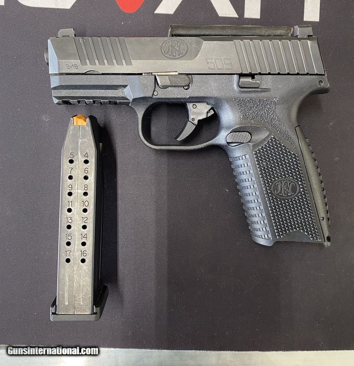 Description: Guns Listing ID: 646107 *** PRE-OWNED / IN VERY GOOD CONDITION *** . FN 509 9X19mm, SEMI-AUTO PISTOL -ALL BLACK COMES WITH ONE- 17-ROUND MAGAZINE . PISTOL IS IN GOOD CONDITION, SEE ALL PHOTOS. . \" ALL FIREARMS ARE INSPECTED BY A CERTIFIED GUNS-SMITH & NRA INSTRUCTOR \ SOLD Manufacturer: FN Model: 509 Caliber Info: 9MM (9X19 PARA) Condition: Used - Non-Certified Barrels: 4 BARREL Finish: BLACK ANODIZED |