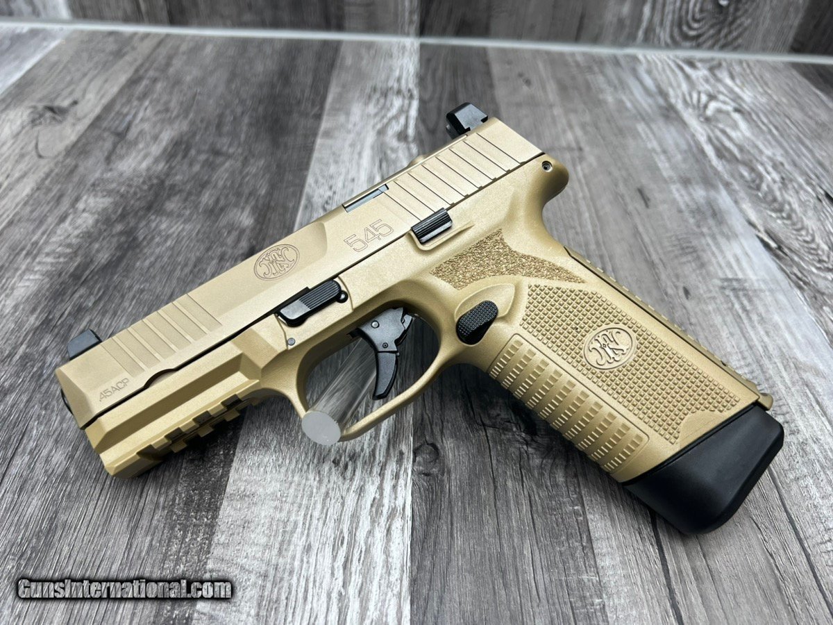 Description: Guns Listing ID: 530390 PISTOL: FN HERSTAL FIREARMS MODEL 545 MRD, SERIAL NUMBER BBP0047347, FLAT DARK EARTH, YES - INCLUDES ORIGINAL BOX, 4.1, 45 ACP (45 AUTO), SEMI - AUTOMATIC SOLD Manufacturer: FN Model: 545 MRD Caliber Info: .45 ACP Condition: Used - Non-Certified Barrels: 4.1 BARREL Action: STRIKER FIRED Finish: FDE Weight: 1.875 LBS. |