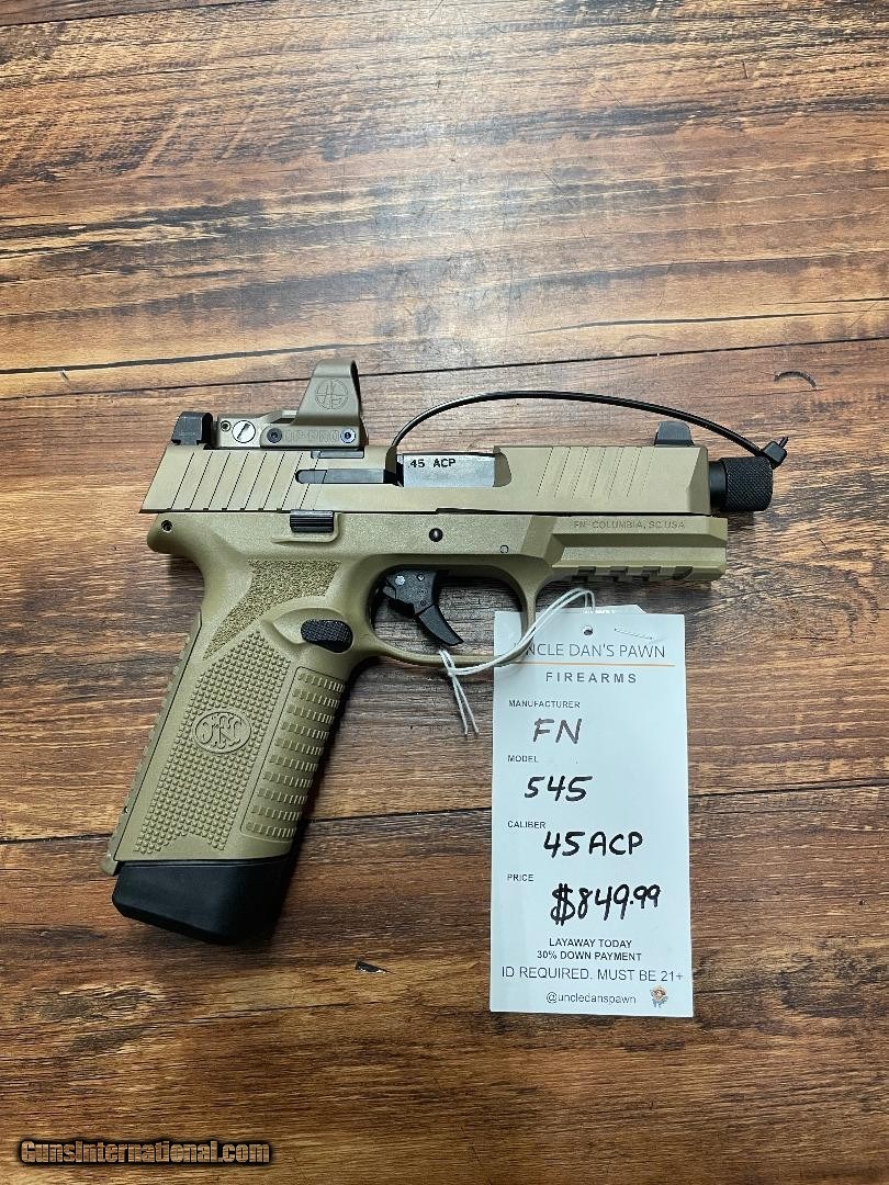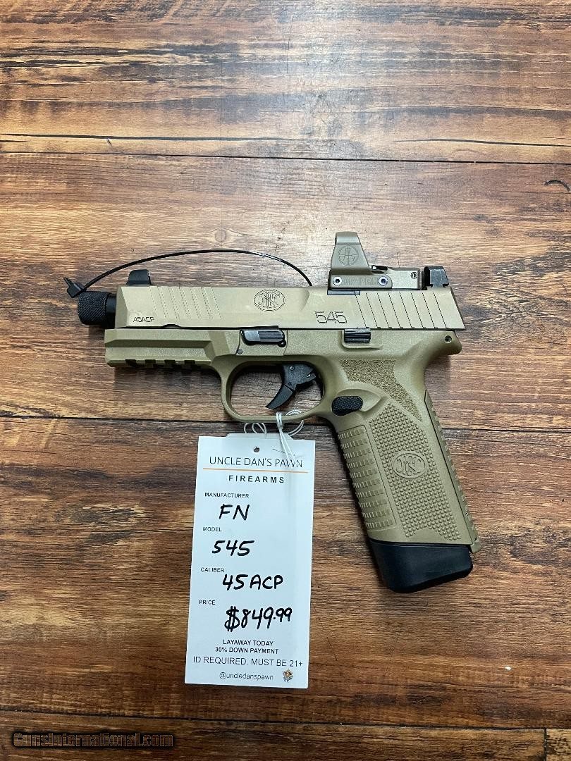 Description: Guns Listing ID: 571116 FN 545 .45 ACP COMES WITH CASE SOLD Manufacturer: FN Model: 545 TACTICAL Caliber Info: .45 ACP Condition: Used - Non-Certified Barrels: 4" BARREL Action: SEMI AUTOMATIC Finish: tan |