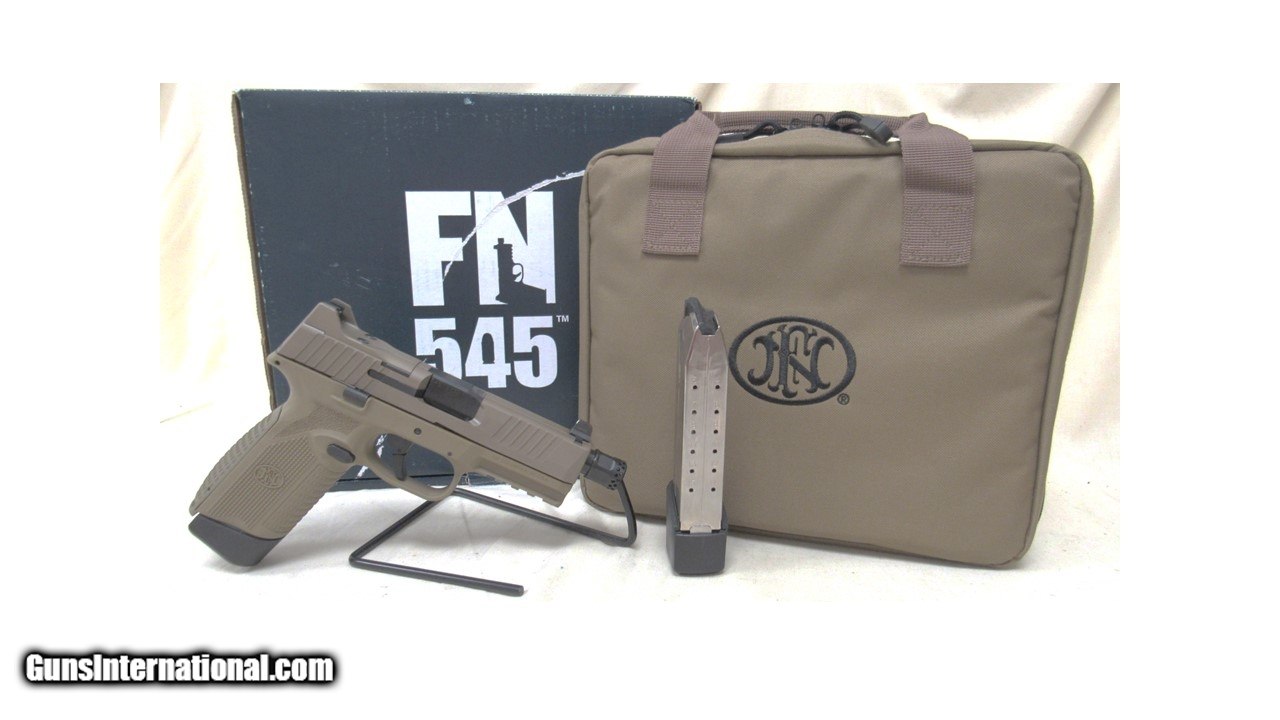 Description: Guns Listing ID: 487273 The FN America FN 545 Tactical is a full-size, semi-automatic pistol designed for versatility and performance in .45 ACP. Featuring a 4.5\" threaded barrel with a .578x28 thread pattern, it comes equipped with suppressor height night sights and a low-profile optics mounting system for enhanced accuracy. The durable FDE slide and polymer frame ensure reliability, while interchangeable backstraps allow for a customizable grip. Additional features include a loaded chamber indicator, ambidextrous slide stop lever and magazine release, a 1913 accessory rail, and two magazines (18-round and 15-round). This package includes a premium zippered case, original box, and accessories, making it an excellent choice for tactical enthusiasts. SOLD Manufacturer: FN Model: 545T Condition: Used - Non-Certified Barrels: 4.5 Gauge Info: .45 ACP Finish: fde |