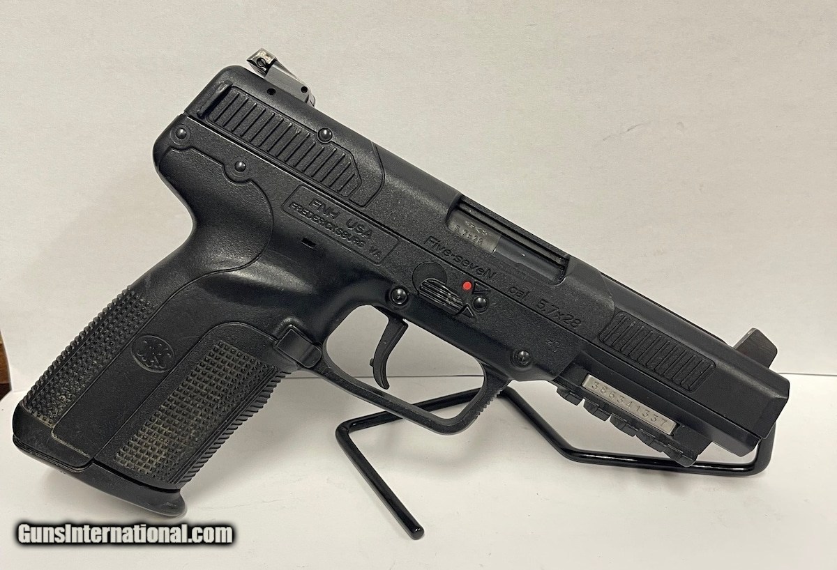 Description: Guns Listing ID: 510876 Used FN Five Seven w/ 1 Magazine CALIBER: 5.7x28mm OPERATION: Single-action MAG CAPACITY: 10 or 20 Rd. WEIGHT: 21 oz. (without mag) BARREL LENGTH: 4.8? OVERALL LENGTH: 8.2? TWIST RATE: 1:9\" RH HEIGHT: 5.7\" WIDTH: 1.4\" TRIGGER PULL: 4.4 - 7.87 lb. SIGHT RADIUS: 7.0\ SOLD Manufacturer: FN America Model: FIVE-SEVEN Caliber Info: 5.7 X 28MM Condition: Used - Non-Certified Barrels: 4.8 BARREL Finish: BLACK |
