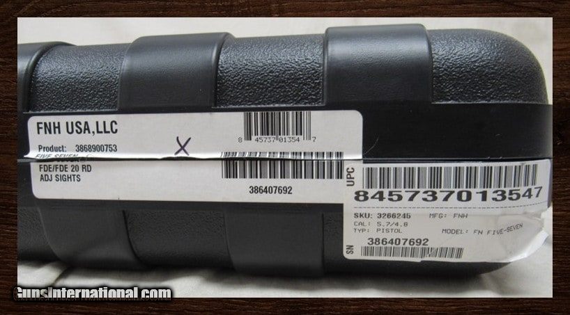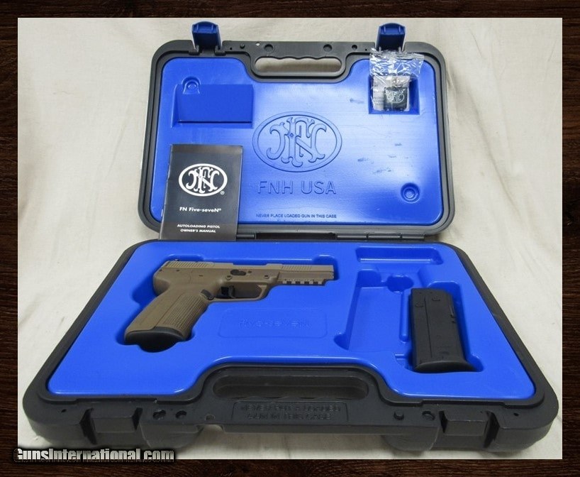 Description: Guns Listing ID: 624550 FN AMERICA FIVE-SEVEN 5.7x28MM 20-ROUND MAG 4.8\" BARREL HAMMER-FIRED SINGLE-ACTION SEMI-AUTO PISTOL INCLUDES FN HARDCASE W/ OWNER‚‚S MANUAL + 1 ADDITIONAL MAGAZINE The original FN Five-seveN, often imitated but hardly duplicated, has two decades of trusted service with allied armies, global law enforcement and civilians. With improved range and accuracy over common pistol cartridges, the NATO standardized 5.7x28mm developed by FN Herstal is fired from the chrome-lined cold hammer-forged barrel. Pinpoint accuracy and minimal felt recoil is standard issue. Equipped with an internal hammer, the smooth trigger with a predictable break further enhances accuracy SOLD Manufacturer: FN America Model: FIVE-SEVEN Caliber Info: 5.7X28MM Condition: Used - Non-Certified Barrels: 4.8 BARREL Finish: FDE |