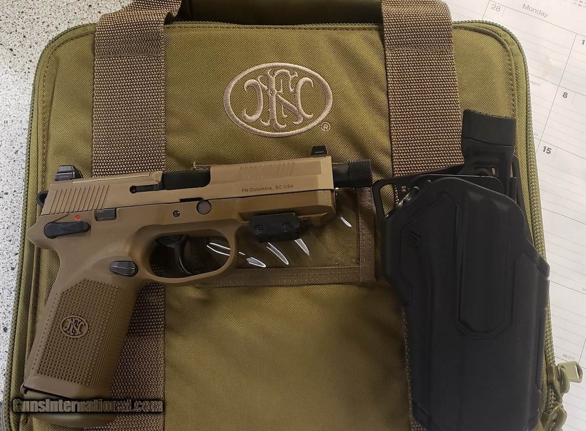 Description: Guns Listing ID: 465396 Used as a carry gun for a few months. Functions well and looks good. Has some slight wear, but considered \"good\" condition. Comes with all items (2 15-Round Magazines, Backstraps, a Blackhawk Omnivore Holster, and Gun Lock) all inside the FN Cloth Bag (pictured). Support small independent family owned gun stores like ours, to keep our hobby alive and educated! SOLD Manufacturer: FN America Model: FNX-45 TACTICAL Caliber Info: .45 ACP Condition: Used - Non-Certified Barrels: 5.3" barrel |