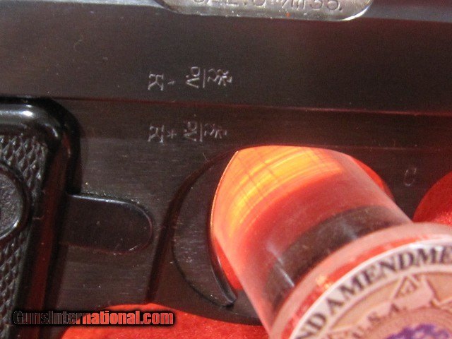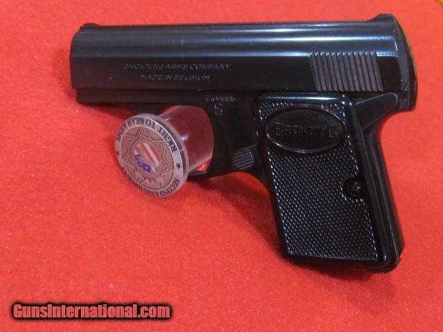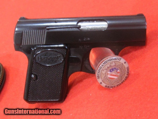 Description: Excellent condition Baby Browning .25 ACP pre-68. Bright shiny bore, tight action, clean gun. Striated sight rib a great help with these small sights. If you can hold it still, it's in the black at 7 ydses with original mag and Browning pouch. $795. $25 shipping to lower 48 except CA. Not for sale where illegal to own or posess. Please email mikenellpacbell. SOLD Curio/Relic: Yes Handgun Caliber: .25 ACP (6.35mm Browning, 6.35×16mmSR) Manufacturer: Browning Model: Baby Serial Number: 236605 Barrel Length: 2 Condition: excellent Metal Condition: excellent Bore Condition: Excellent |