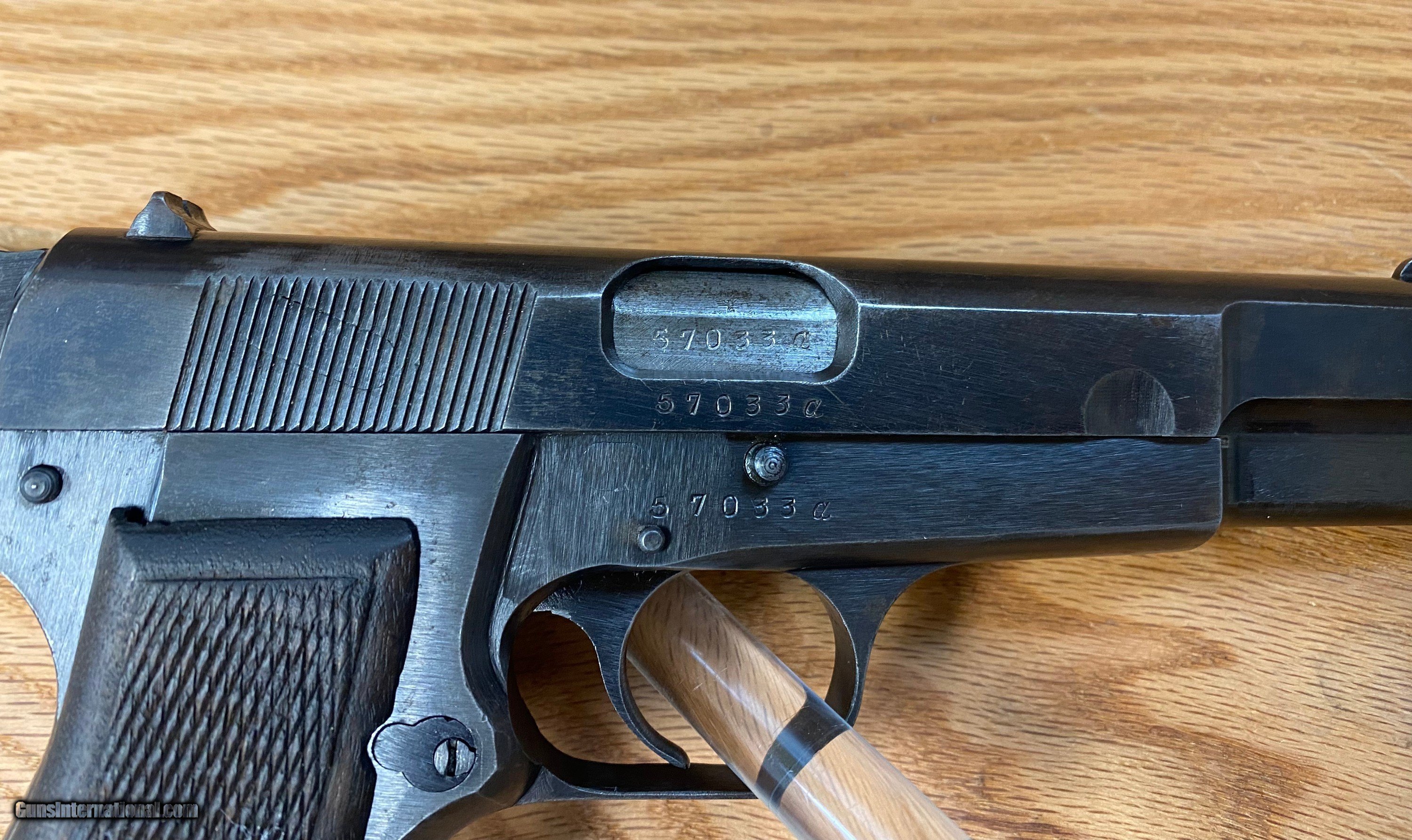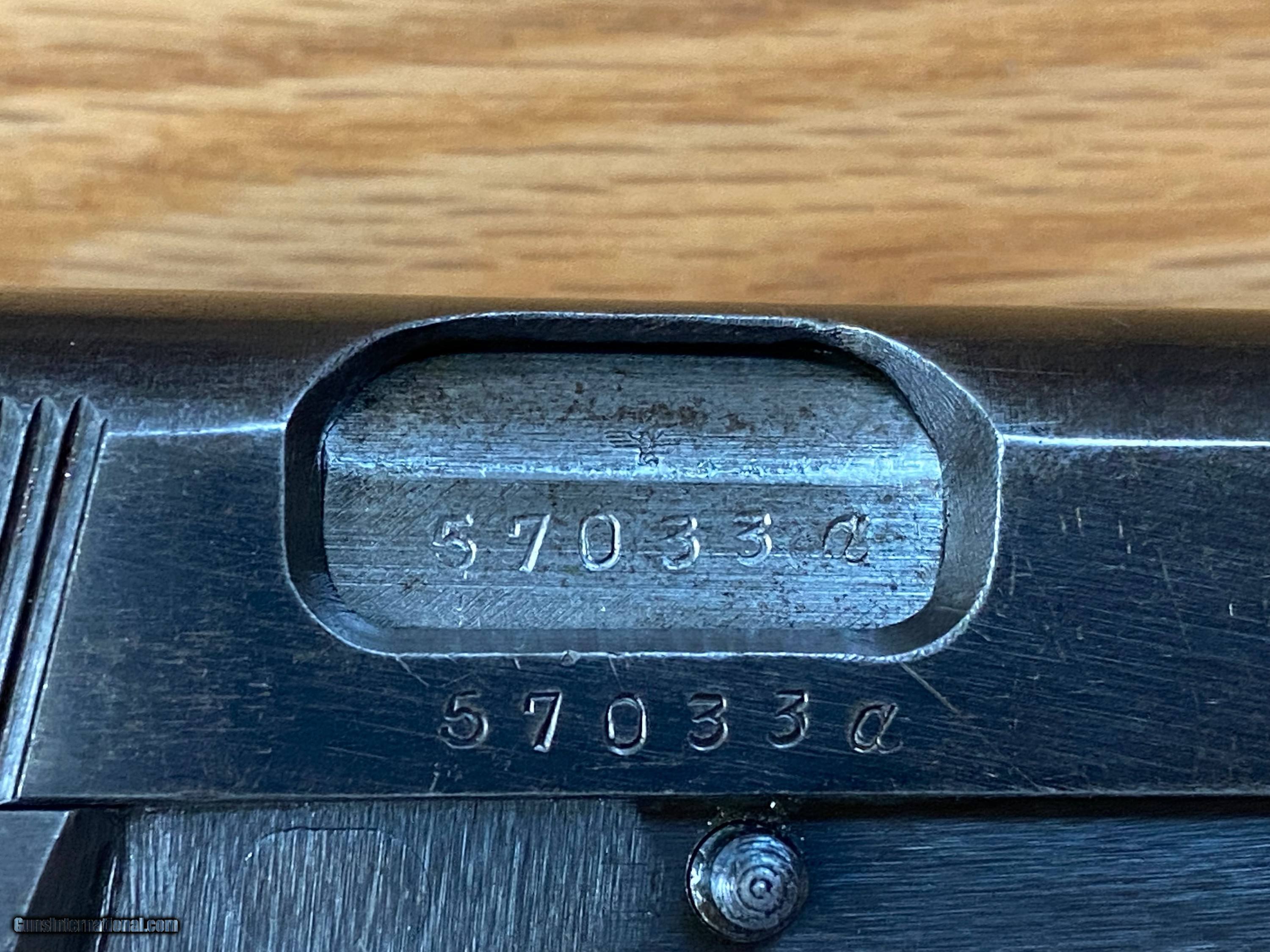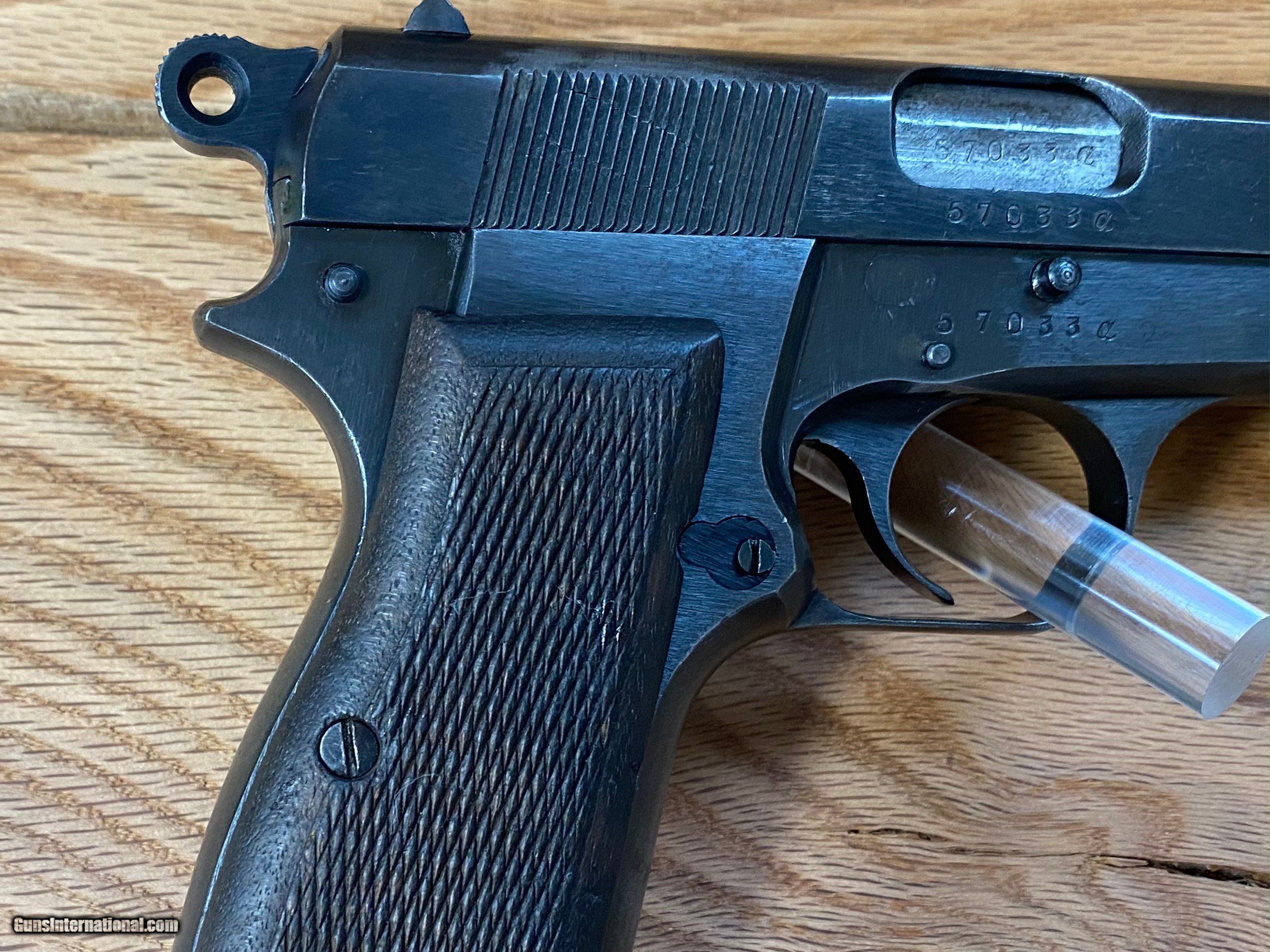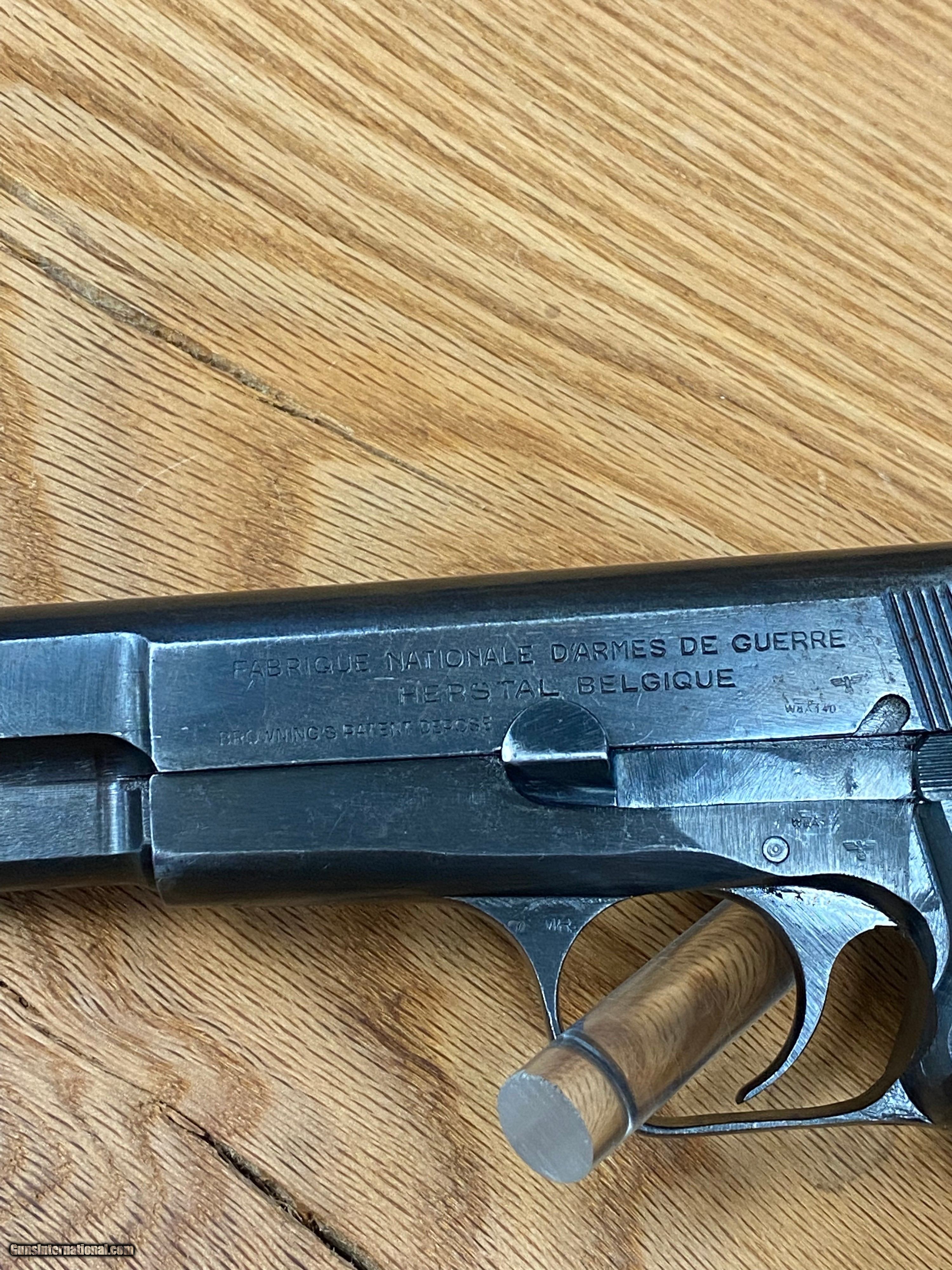 Description: This is a beautiful FN Browning Hi-Power that is all matching and has the WaA140 Waffenampt and the flying eagle stamped into it. This pistol is dated to the year 1943 being on the first line of manufacturing and having an "A" suffix on the serial number. This one is roughly dated to the month of July being a part of the "A" suffix serial number group because roughly about 8K Hi-powers were made a month when the Germans took over the factory in 1940. SOLD Handgun Caliber: 9x19mm Parabellum (9mm Luger, 9x19mm NATO) Manufacturer: Fabrique National Model: Hi-Power Serial Number: 57033A |