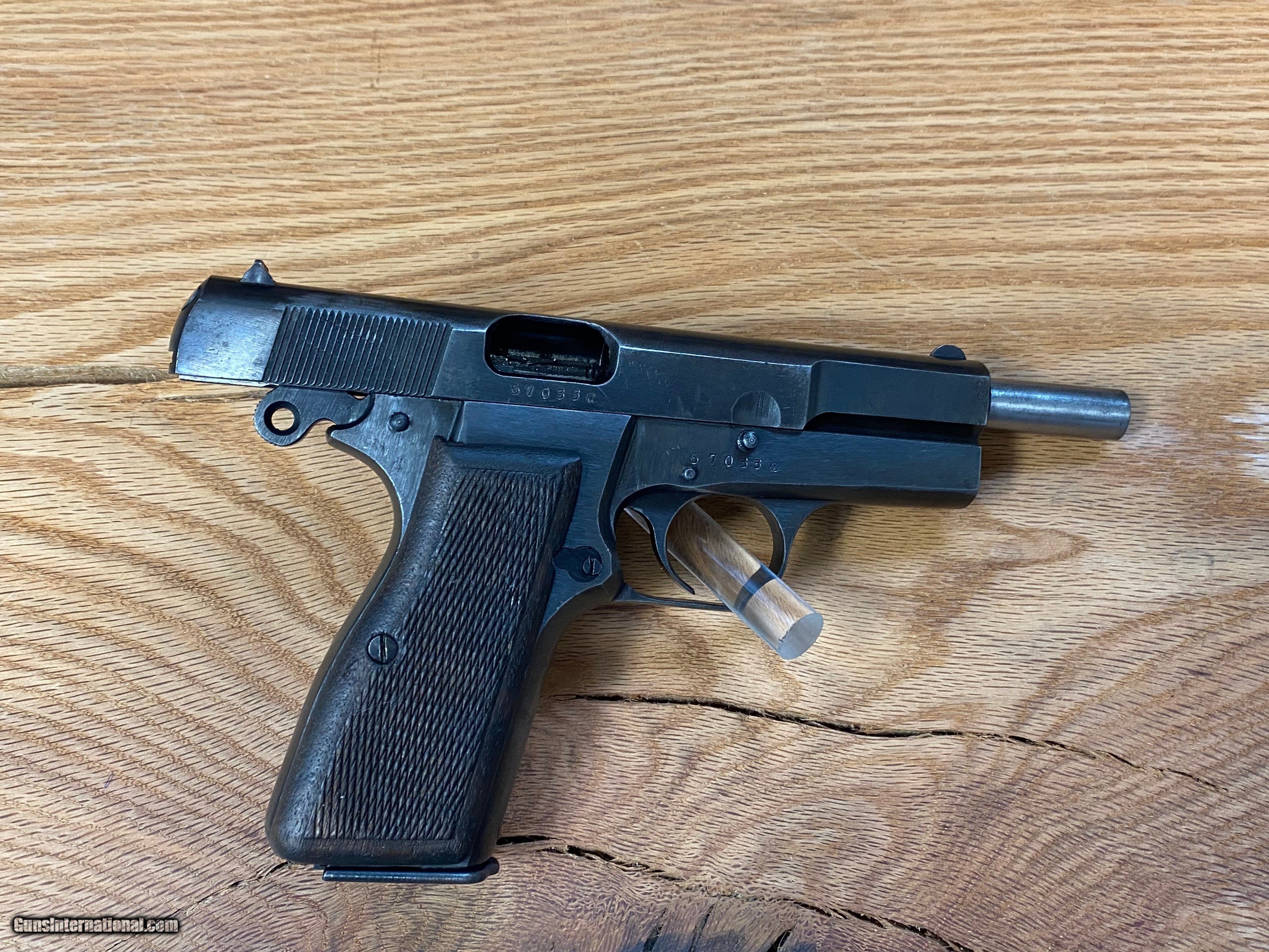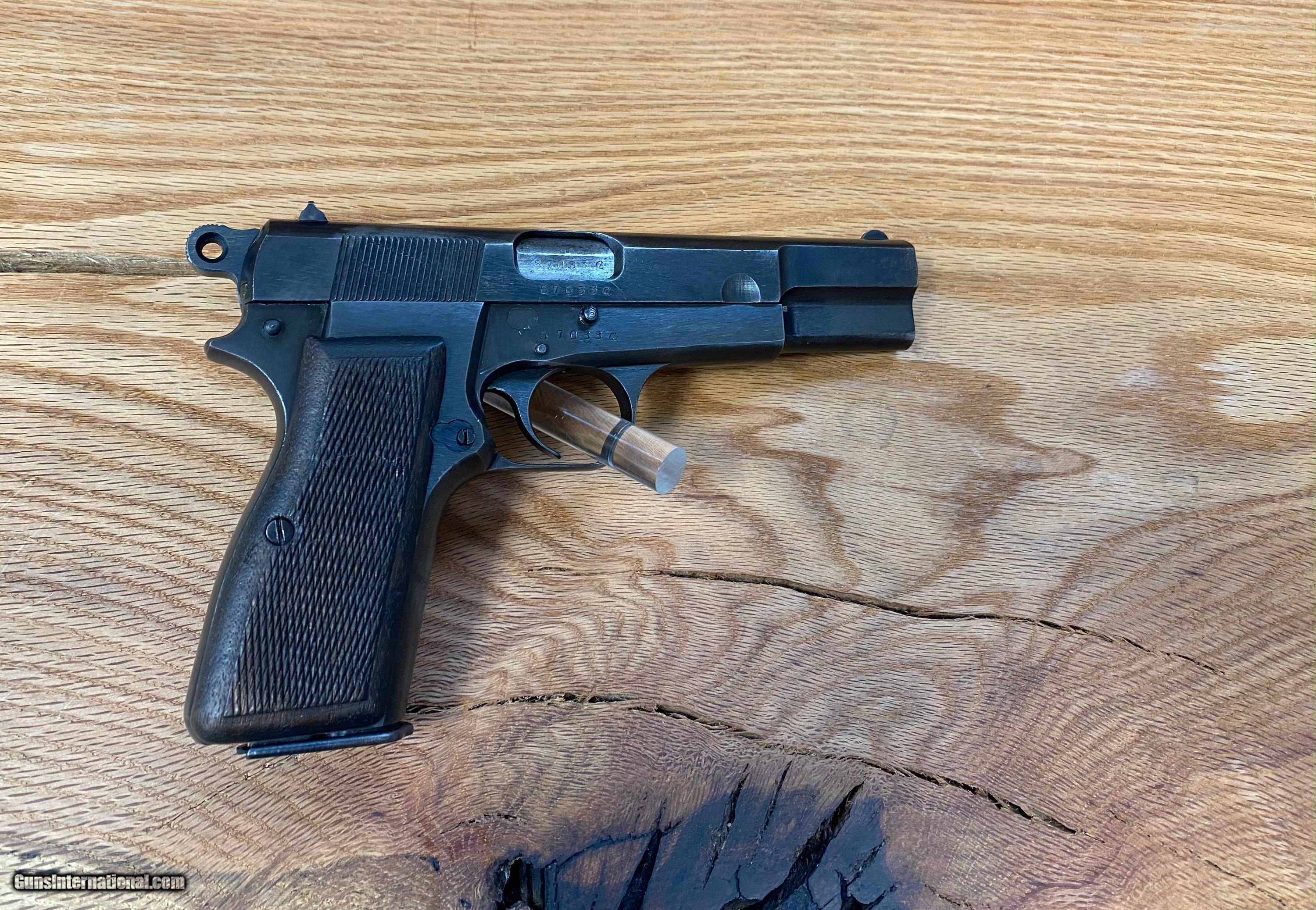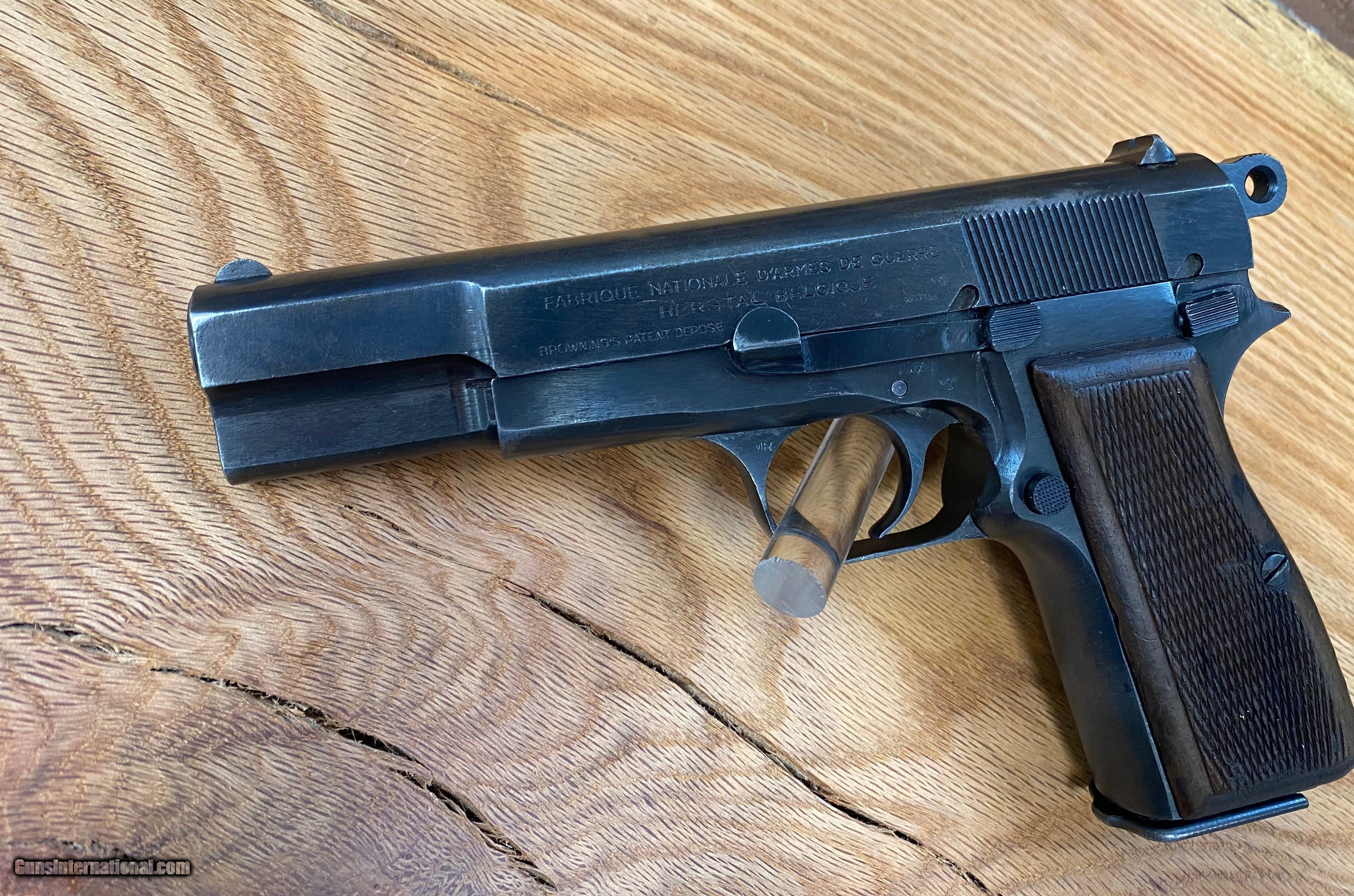 Description: This is a beautiful FN Browning Hi-Power that is all matching and has the WaA140 Waffenampt and the flying eagle stamped into it. This pistol is dated to the year 1943 being on the first line of manufacturing and having an "A" suffix on the serial number. This one is roughly dated to the month of July being a part of the "A" suffix serial number group because roughly about 8K Hi-powers were made a month when the Germans took over the factory in 1940. SOLD Handgun Caliber: 9x19mm Parabellum (9mm Luger, 9x19mm NATO) Manufacturer: Fabrique National Model: Hi-Power Serial Number: 57033A |