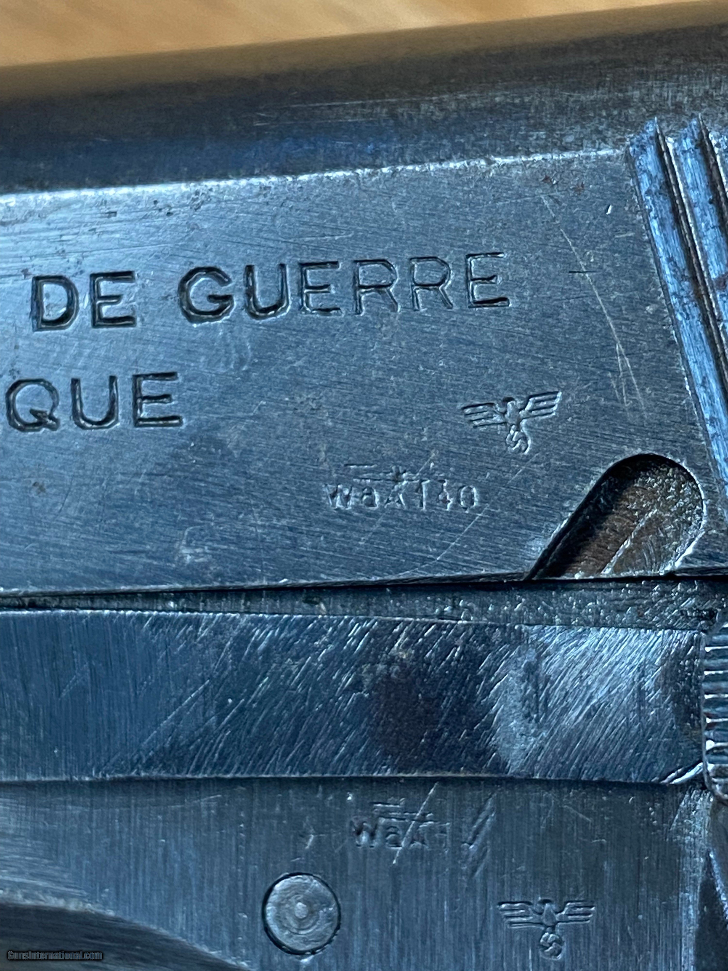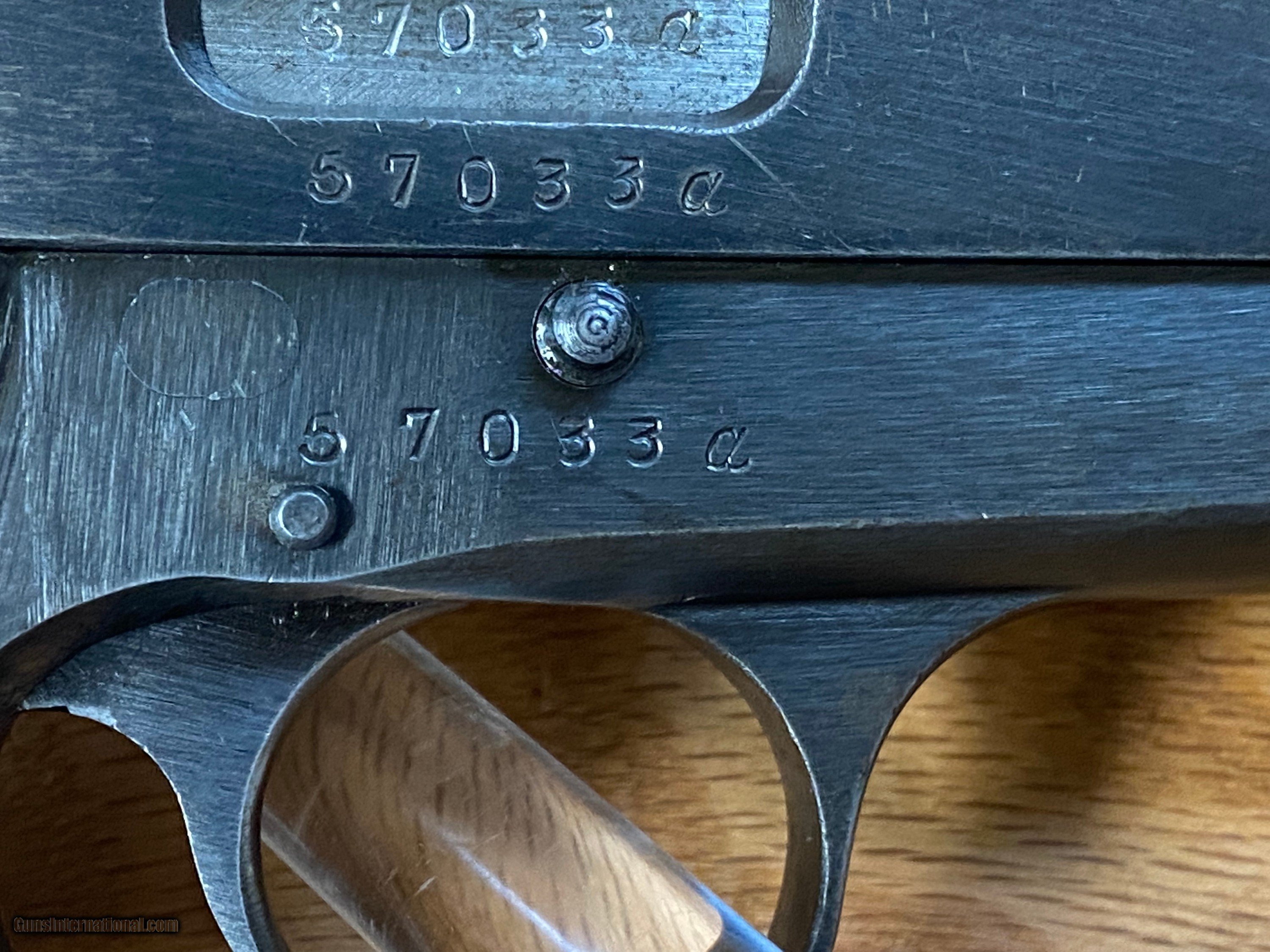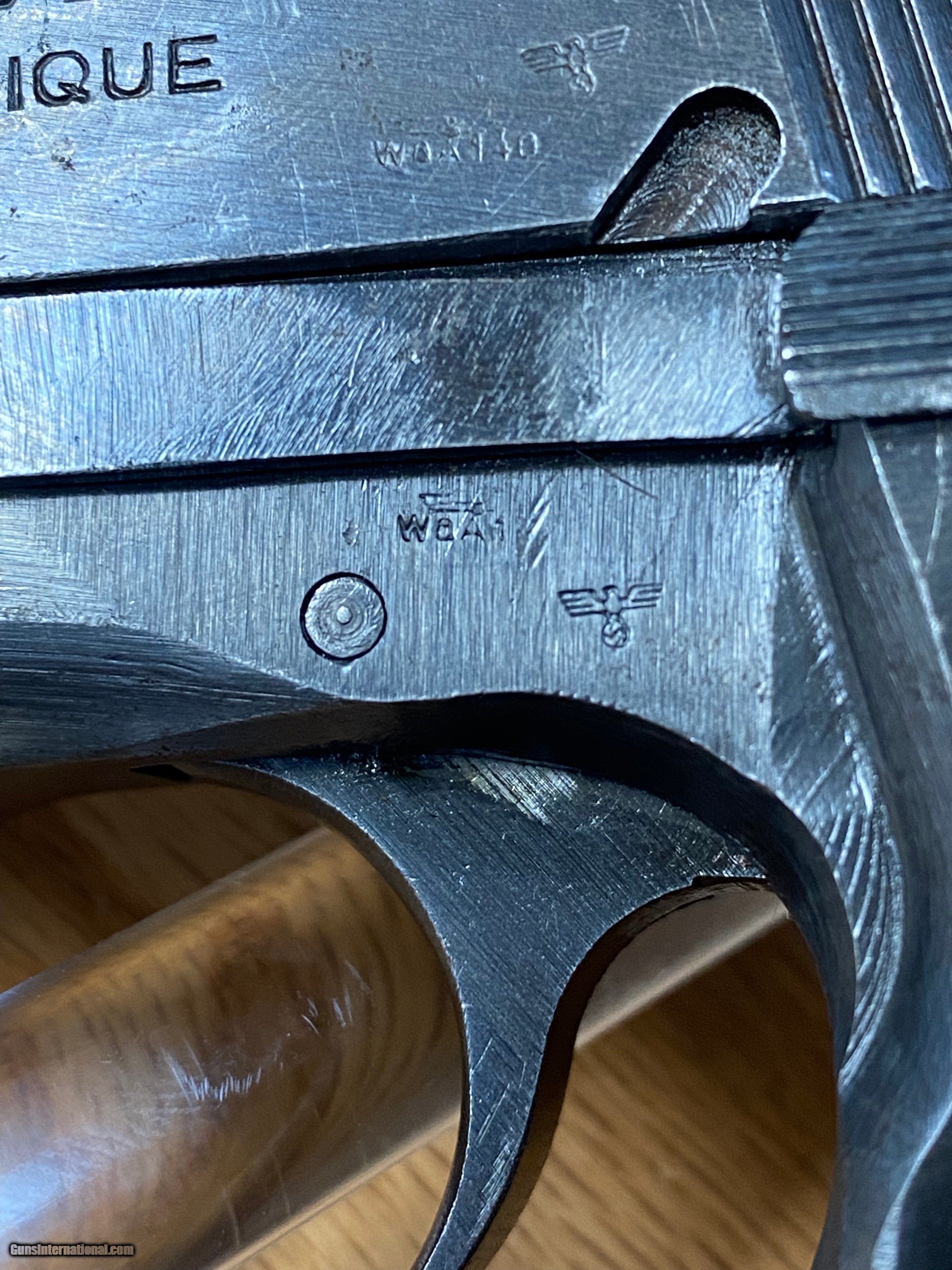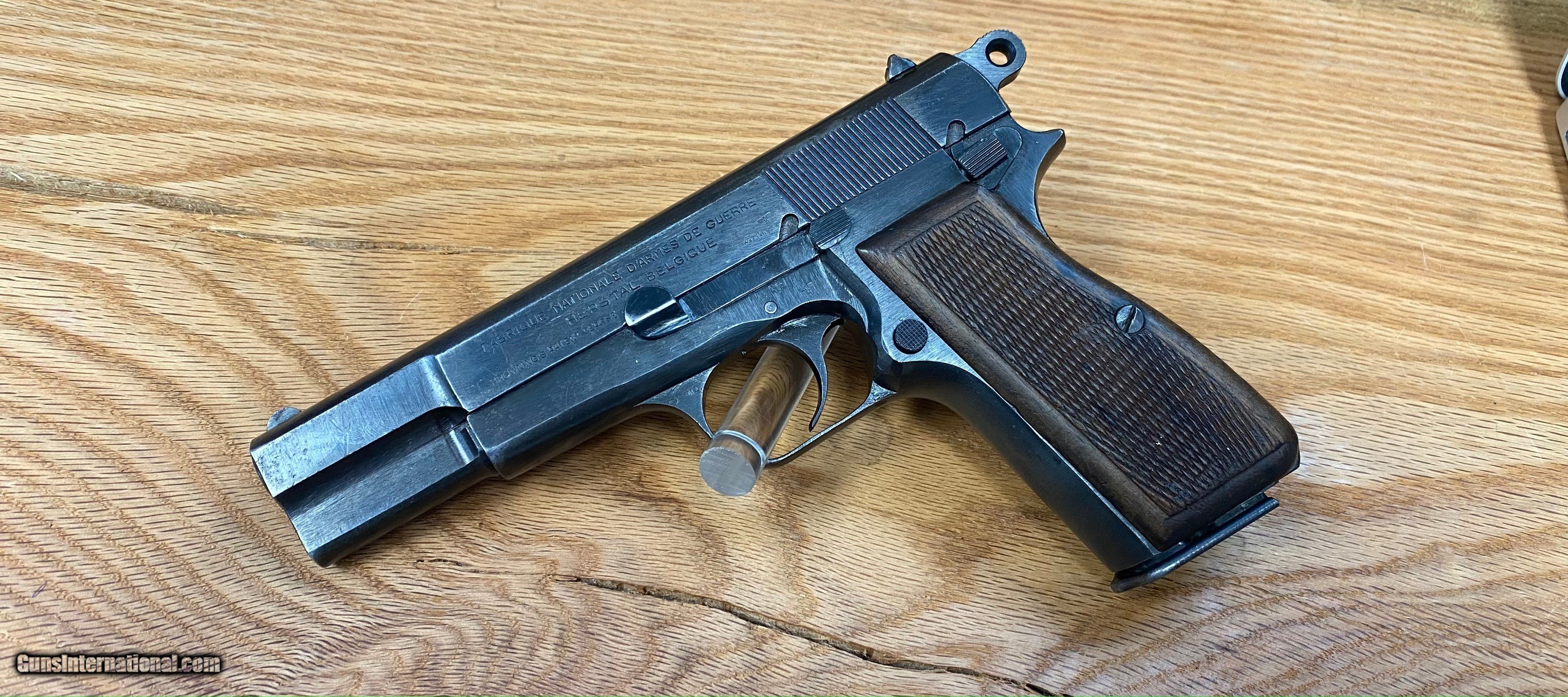 Description: This is a beautiful FN Browning Hi-Power that is all matching and has the WaA140 Waffenampt and the flying eagle stamped into it. This pistol is dated to the year 1943 being on the first line of manufacturing and having an "A" suffix on the serial number. This one is roughly dated to the month of July being a part of the "A" suffix serial number group because roughly about 8K Hi-powers were made a month when the Germans took over the factory in 1940. SOLD Handgun Caliber: 9x19mm Parabellum (9mm Luger, 9x19mm NATO) Manufacturer: Fabrique National Model: Hi-Power Serial Number: 57033A |