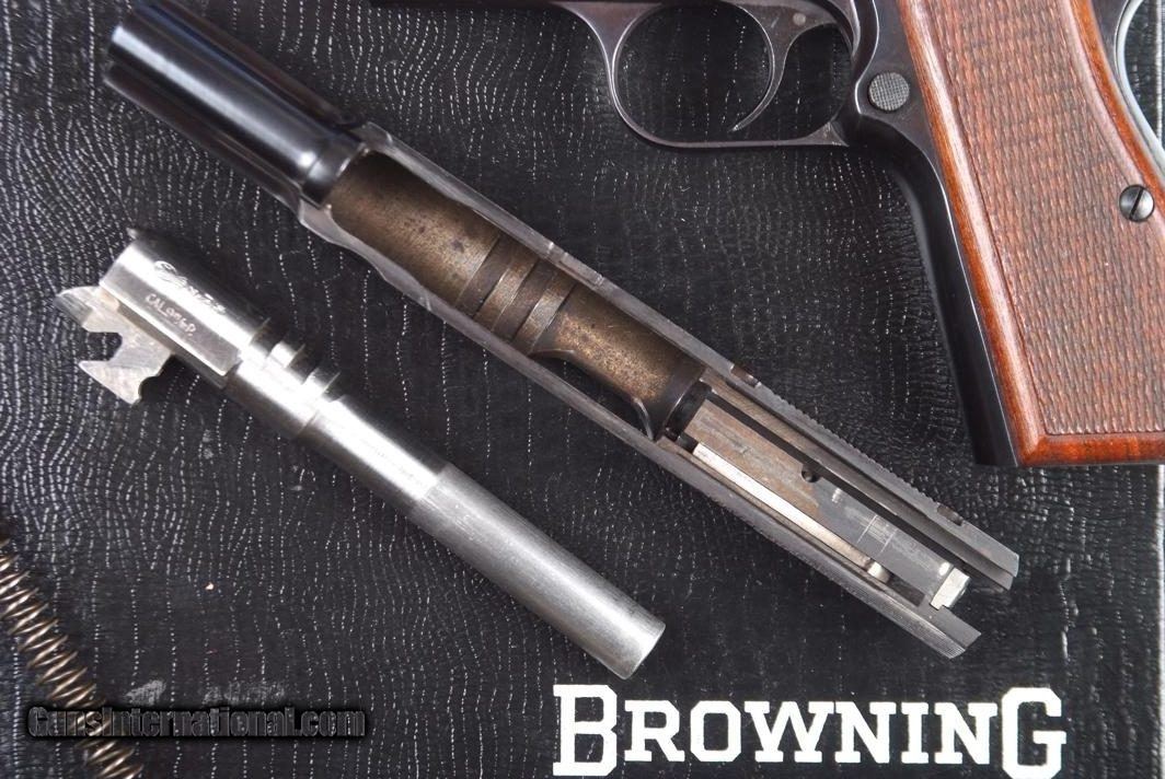 FN High Power marked for BAC, early original features including round hammer, thumb print slide, and rust blued finish in factory faux alligator Browning marked case. Standard configuration pistol with fixed front sight and drift adjustable rear sight. BAC address on left side of slide. Unnumbered barrel with commercial proofs. Matching serial numbers on slide and frame. Magazine safety. Checkered walnut grips. Early post war style magazine with aluminum follower and button release floorplate. Browning marked alligator case with red liner, compartmentalized for pistol, with inner label.