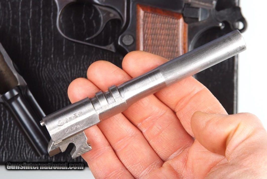 The pistol is AS NEW with no wear scratches, or discernable thinning. Mirror bore. Perfect manual mechanics. Box with some external scuffs, as pictured, and internal stains where in contact under pistol. An absolutely fantastic early rust blued BAC-marked HP that would be impossible to upgrade short of getting a slightly better box.