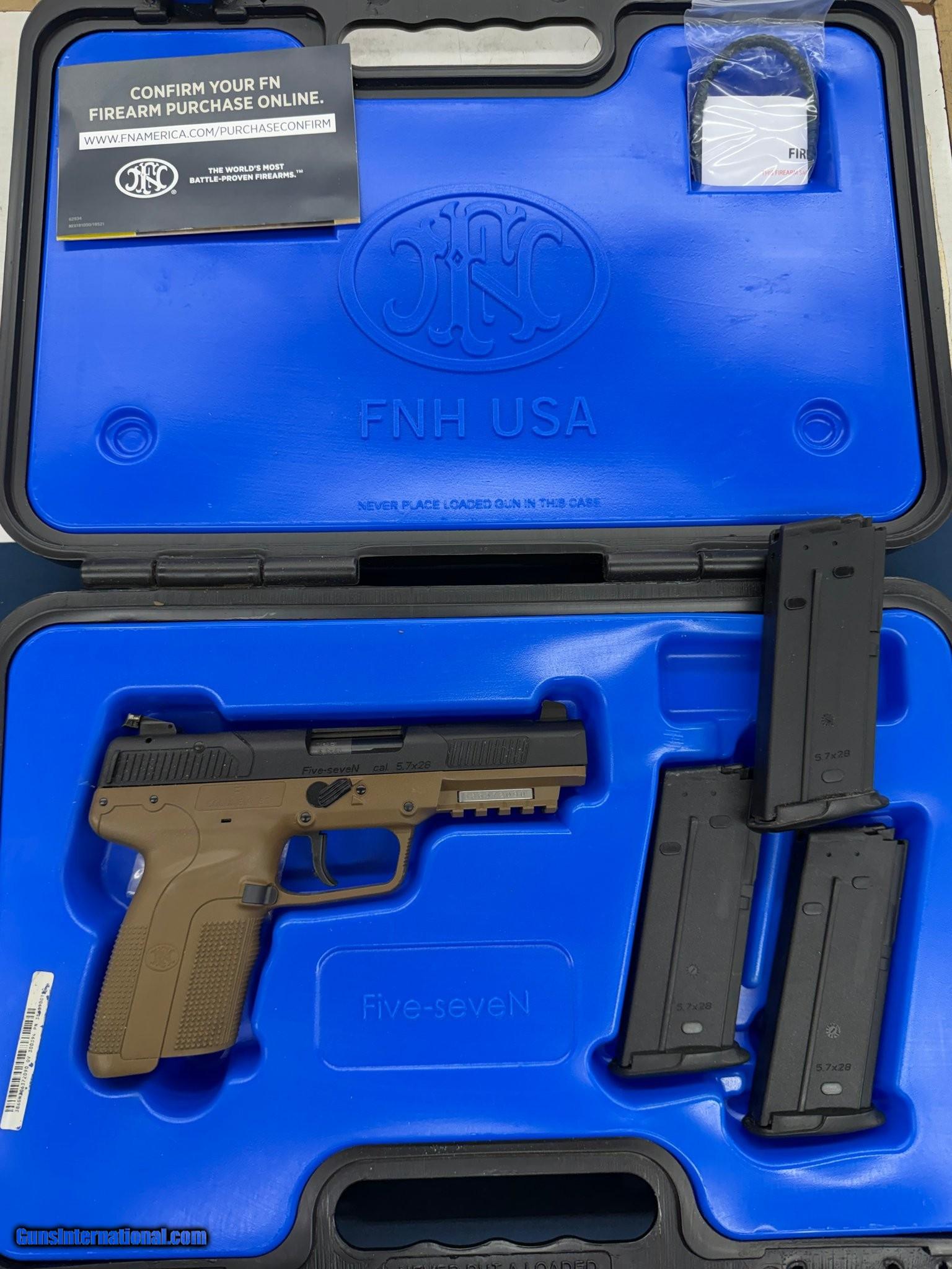 Description: Guns Listing ID: 619154 FN FIVE-SEVEN 5.7x28 FDE and black pistol in great condition!! Comes with 3 factory 20 round mags and original case. Manufacturer: FN Model: FIVE-SEVEN Caliber Info: 5.7X28MM Condition: Used - Non-Certified Barrels: 4.8" BARREL Action: SINGLE SHOT Weight: 1.6 lbs. Price: $1,000.99 Contact Seller |