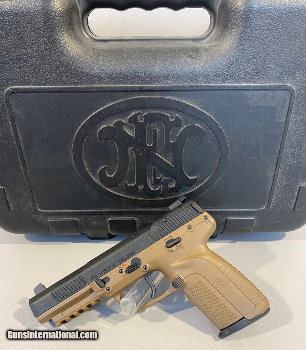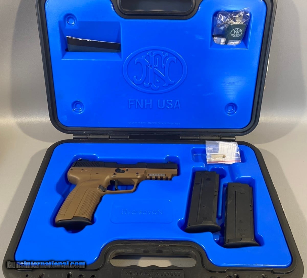 Description: Guns Listing ID: 570138 LIKE NEW PISTOL: FN HERSTAL FIREARMS MODEL FIVE-SEVEN, FDE, INCLUDES ORIGINAL BOX AND PAPERS, 4.75\" BARREL, SEMI - AUTOMATIC, 5.7X28MM, BOX W/ 2 EXTRA MAGS. 2018 DOM DEALER DESCRIPTION/SPECS: The FN Five-seveN single-action autoloading pistol fires the low-recoil 5.7x28mm cartridge making it ideal for personal protection, target shooting or NRA Tactical Police Competition. It features a textured, ergonomic polymer frame with checkered panels for enhanced grip. The polymer slide cover helps reduce weight and the operating controls allow for easy access with a reversible magazine release and ambidextrous manual safety levers. The barrel is hammer-forged and chrome-lined for enhanced accuracy and extended service life. Pistols ship with 3 magazines and a lockable hard case. SPECIFICATIONS Type: Pistol Action: Single Action Caliber: 5.7x28mm Barrel Length: 4.8 Capacity: 20+1 Safety: Ambidextrous Grips: Flat Dark Earth Polymer Sight Configuration: Adjustable Frame Material: Polymer Barrel Type: Chrome-Lined Cold Hammer-Forged Slide: Black Hard Case SKU: HGN-FN-3868929350 Manufacturer: FN Mfg. Part Number: 3868929350 UPC: 845737003364 SOLD Manufacturer: FN Model: FIVE-SEVEN FDE Caliber Info: 5.7X28MM Condition: Used - Non-Certified Barrels: 4.75 BARREL Finish: FDE/BLACK |