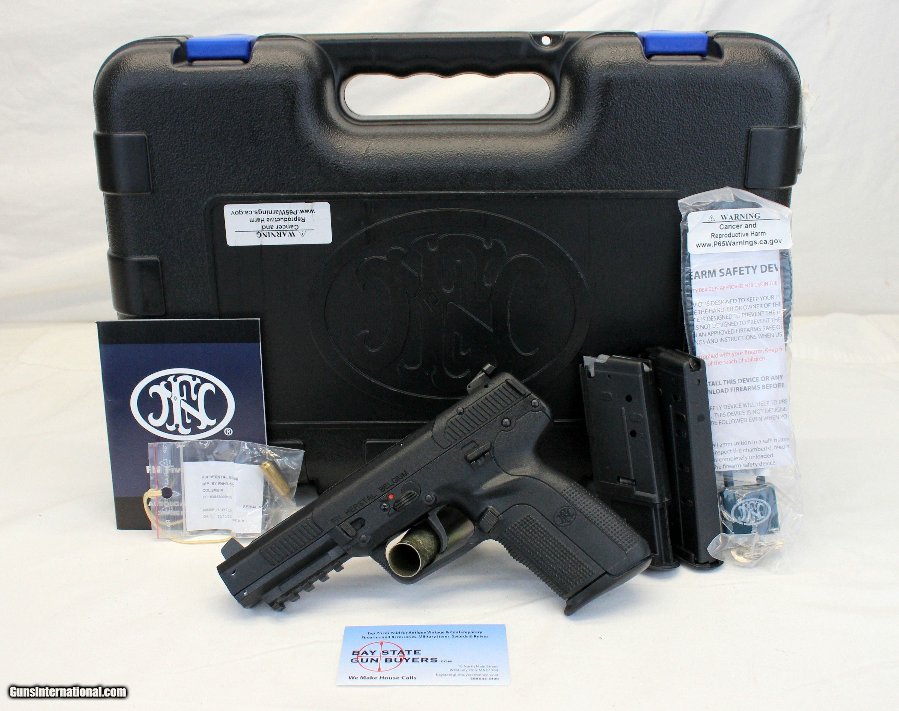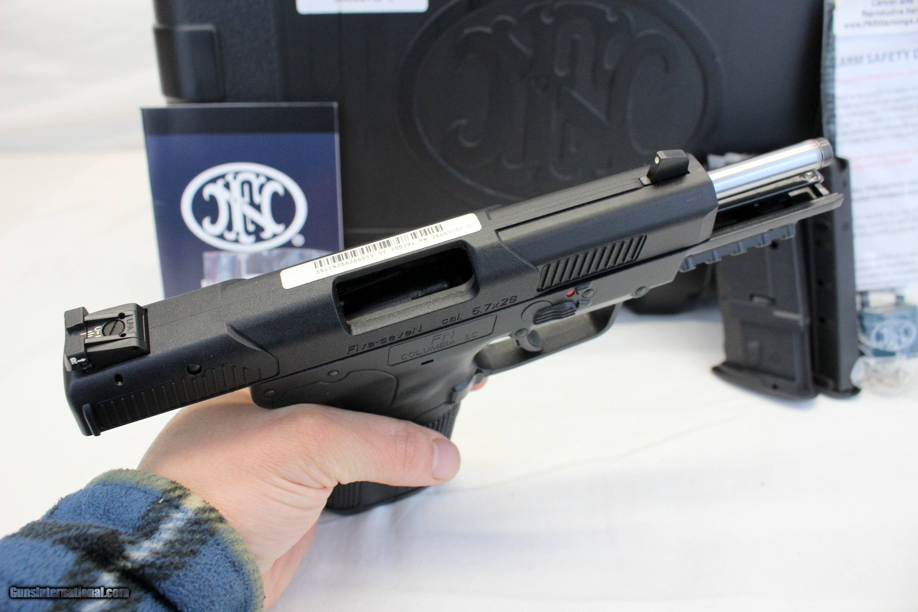 Description: We are offering for sale an FN Five-Seven semi-automatic pistol chambered in 5.7x28mm caliber. This gun is UNFIRED other than test firing at the factory. Gun is MINTY in original case with (1) 10rd, (2) 20rd magazines, manual and lock. SEE PICTURES FOR DETAILS. GREAT FOR RANGE OR HOME DEFENSE! NO MASS SALES. **** PLEASE NOTE: WE ONLY ACCEPT MASTERCARD AND VISA AS PAYMENT OPTIONS (please note we charge a non-negotiable 3% CC fee) **** **** WE TAKE CREDIT CARD PAYMENT OVER THE PHONE. WE DO NOT TAKE PAYMENT THROUGH THIS **** PLEASE LOOK AT ALL PHOTOGRAPHS FOR CONDITION Please know the legality of any weapon in your state before . If a gun can’t be transferred to you we will charge a 15% re-stocking fee. We are in the shop MODAY, WEDNESDAY, THURSDAY, FRIDAY and SATURDAY 8am-4pm EST. We will be in touch within 24 hours of your purchase. Please be ready to provide CC information. Please have your FFL email a copy of their license to: . No Face To Face Transfers! Please note: Clicking "buy" does not guarantee that this gun is yours, However clicking “Buy” will reserve this gun for you, if it hasn’t been sold in store. We will try to do our best to remove the posts as efficiently as possible, but sometimes delays may ensue. “Buy” is your safest bet to reserve a gun. Also please add 6.25% MA state sales tax (if from MA) and 3% credit card shop courtesy fee for all out of state buyers Before calling with concerns read these conditions and meet them accordingly. SOLD |