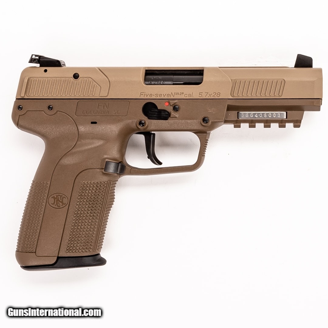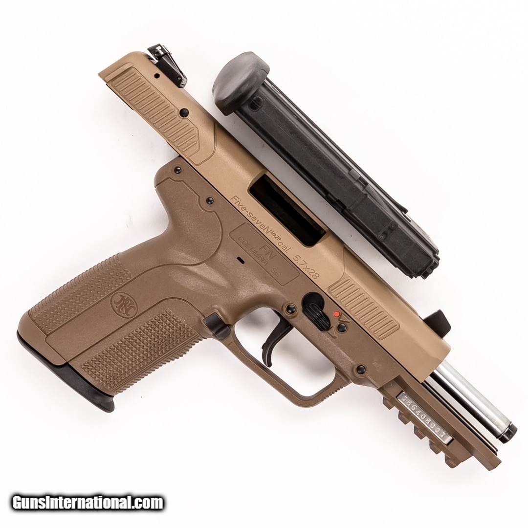 Description: Guns Listing ID: 369544 The FNH Five-seveN is a semi-auto handgun named for the caliber in which it is chambered 5.7x28mm. Suitable for concealed carry and home defense, the delayed blowback action aids in reduced recoil. It offers predominately polymer construction, as well as a concealed hammer and special safety to prevent firing without a magazine. The grips are stippled to ensure a firm grasp, while the integral rail makes for easy mounting of accessories. This Five-SeveN is in excellent condition! It has a magazine disconnect and comes with the original case, manual, and two 20-round magazines. SOLD Manufacturer: FN Model: FIVE-SEVEN Caliber Info: 5.7X28MM Condition: Used - Certified Barrels: 4.8 BARREL Finish: FDE |