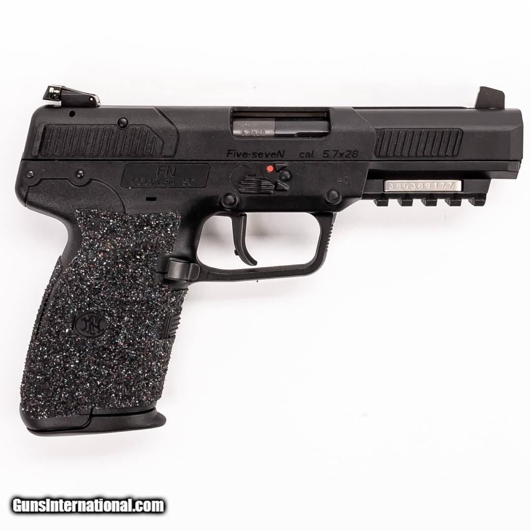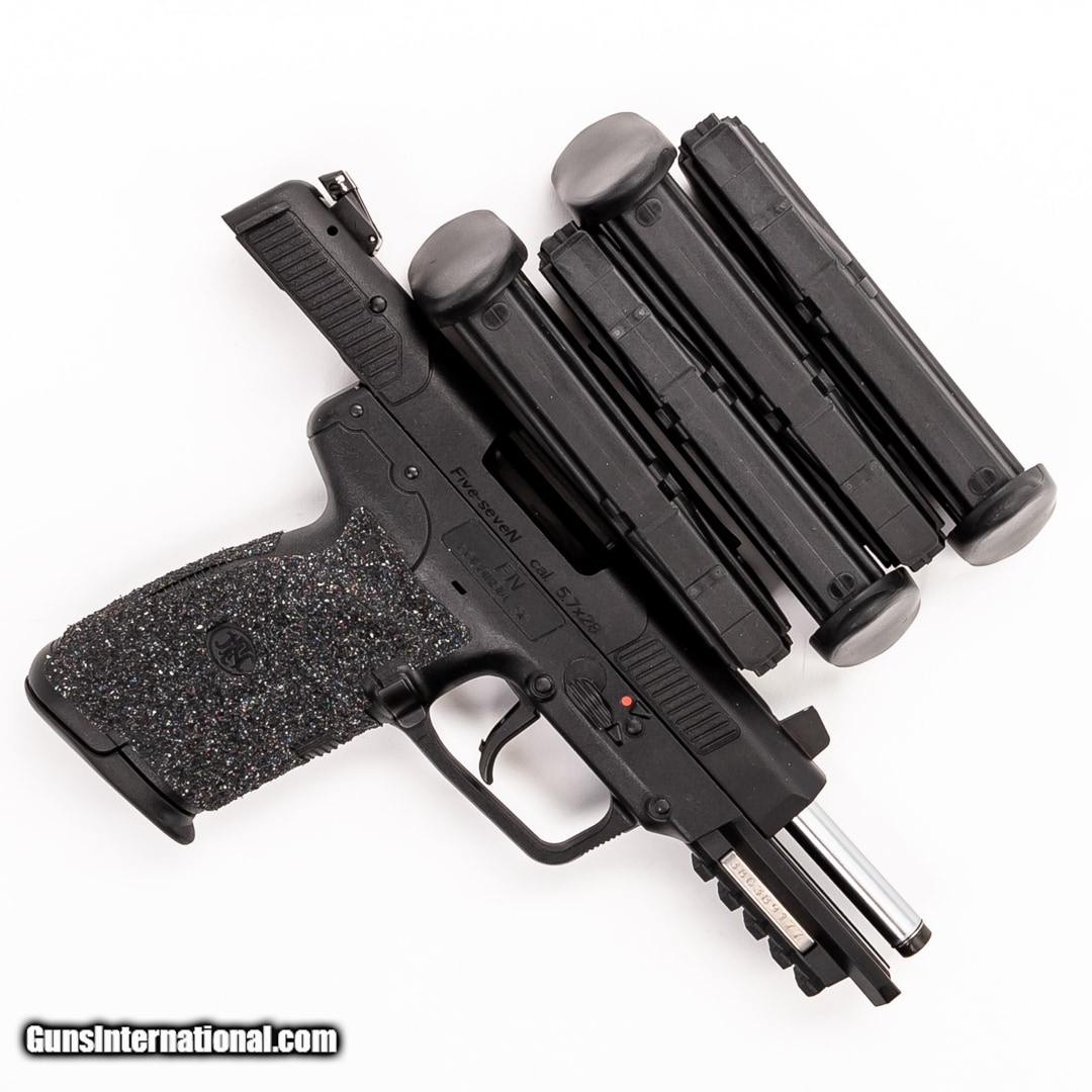 Description: Guns Listing ID: 394105 The FNH Five-seveN is a high-performance handgun that revolutionizes self-defense sidearms. Chambered in 5.7X28mm, this handgun boasts blistering velocity, tac driving accuracy, and surprisingly mild recoil. The sights are easy to pick up and the standard magazine capacity is 20 rounds, giving you the tactical edge in a dire situation. This handgun features Talon grip tape. The purchase includes five 20-round magazines and the original case with the manual. SOLD Manufacturer: FN Model: FIVE-SEVEN Caliber Info: 5.7X28MM Condition: Used - Certified Barrels: 4.8 BARREL Finish: BLACK |