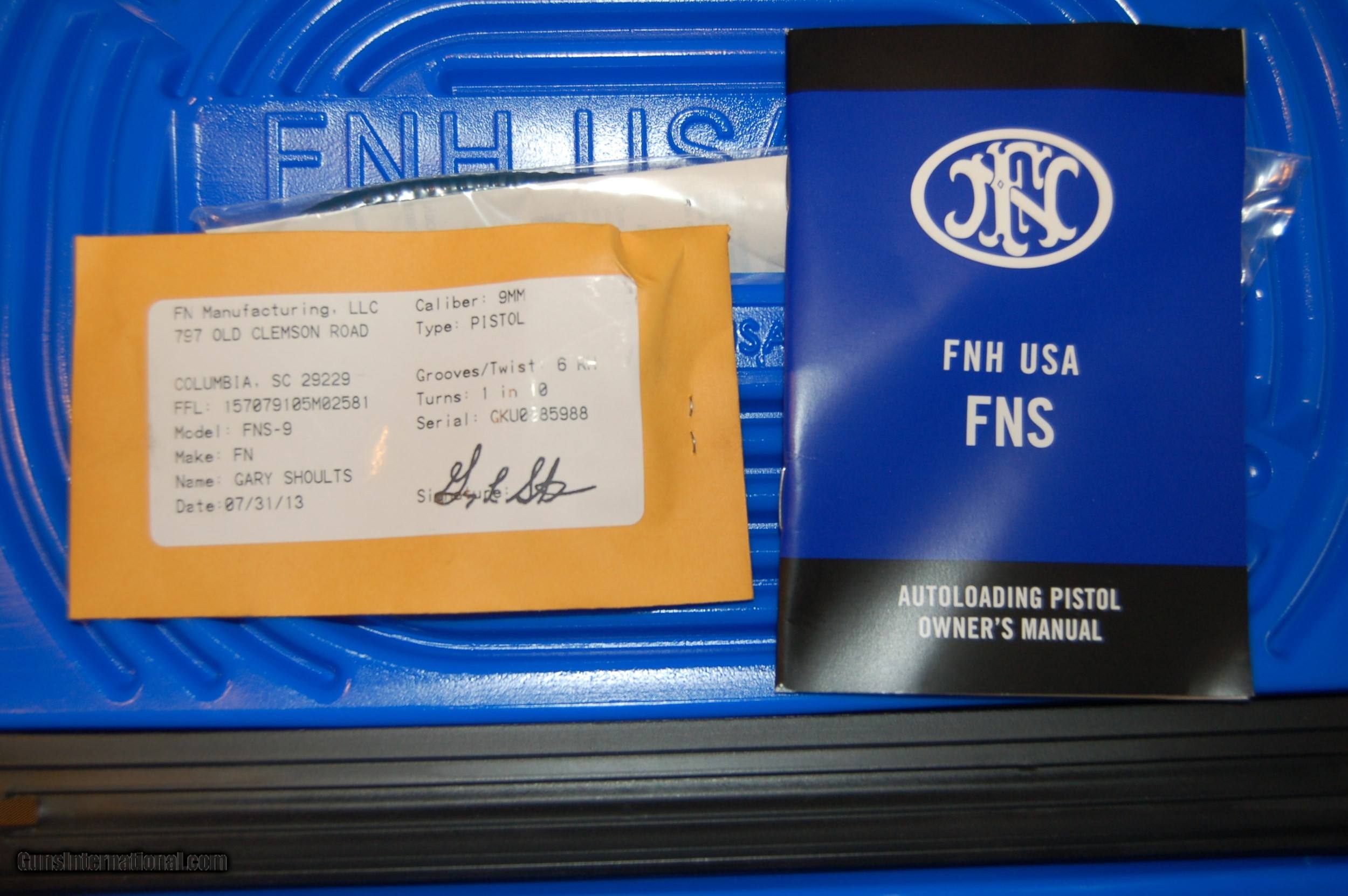 This FNS-9 has never been fired since purchased new. Like new in box. Capacity, accuracy and reliability makes this a great weapon. Extra grips, 3 9x17 mags, owners manual and case are included.