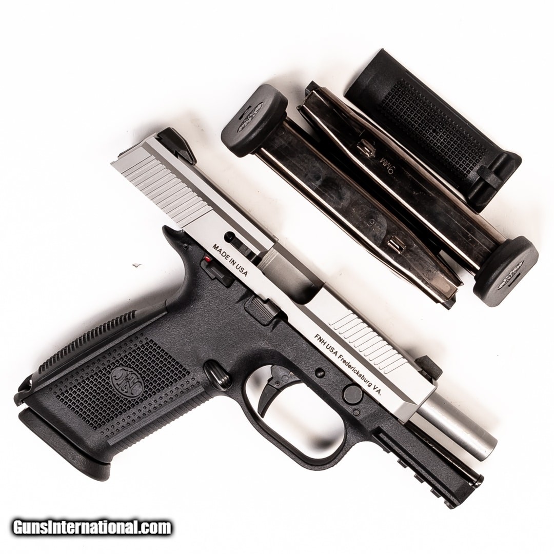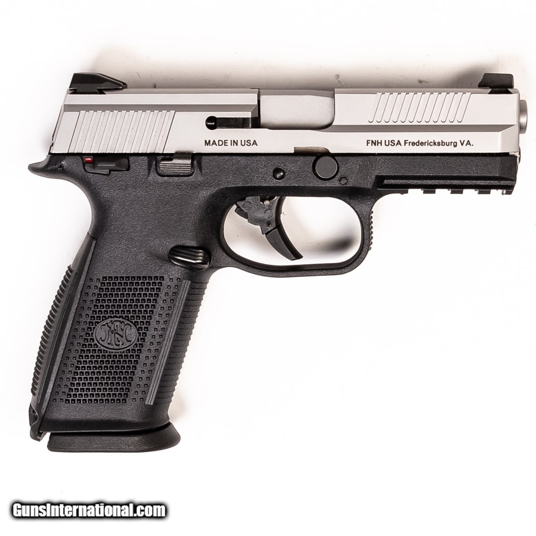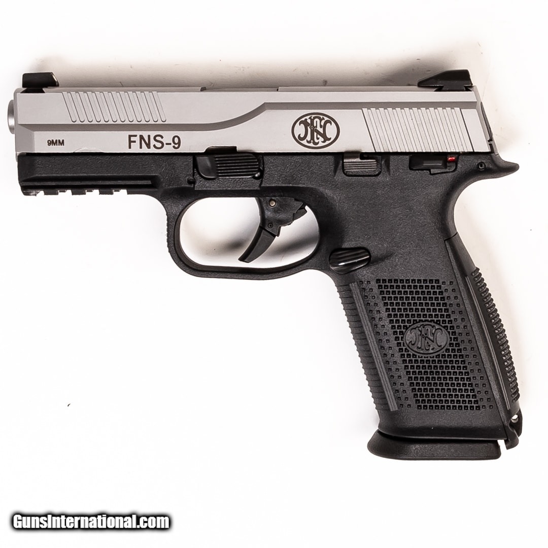 Description: Guns Listing ID: 482946 The FN FNS-9 is a simple striker fired handgun that boasts ambidextrous controls, an external safety, high texture grips, comfortable ergonomics, and second to none reliability. This pistol will make an excellent self-defense sidearm whether you‚‚re at home protecting your loved ones or on the job. This handgun includes backstraps, three 17-round magazines, and the original case with the manual SOLD Manufacturer: FN Model: FNS-9 Caliber Info: 9MM LUGER Condition: Used - Certified Barrels: 4 BARREL Finish: TWO-TONE STAINLESS |