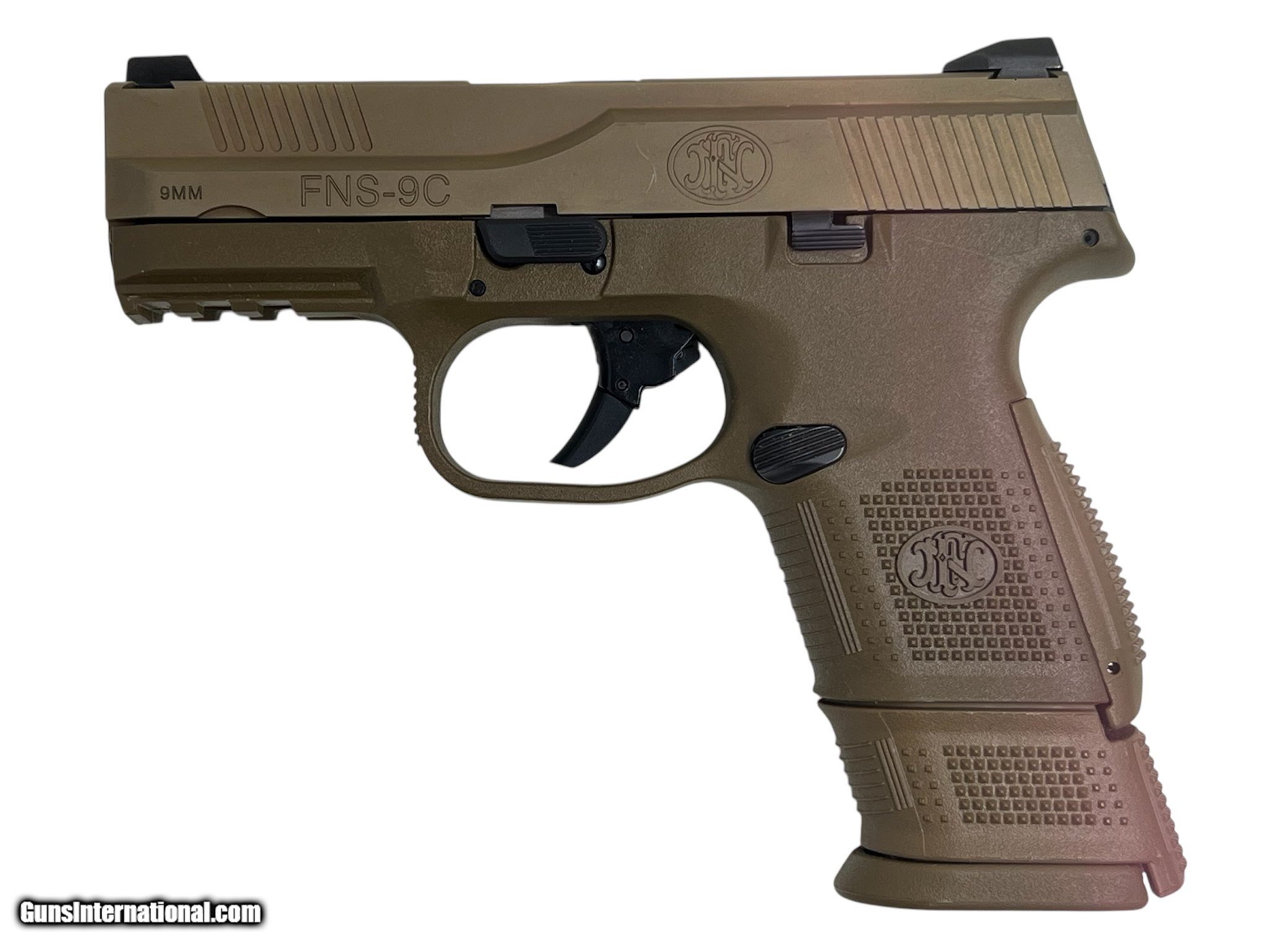 Description: Guns Listing ID: 485081 The FN FNS-9C is a compact, semi-automatic pistol chambered in 9mm, designed for concealed carry and personal defense. Manufactured by FN Herstal, this pistol combines reliability, durability, and modern features in a user-friendly package. Here‚‚s a detailed description: Key Features: Frame and Slide: The FNS-9C features a polymer frame with aggressive texturing for a secure grip. The slide is constructed from stainless steel, available in black or natural stainless finishes. Serrations on the front and rear of the slide improve handling during chambering or press-checks. Size and Weight: The compact design of the FNS-9C makes it ideal for concealed carry. Its barrel length is approximately 3.6 inches, and the overall weight is around 23.4 ounces (unloaded). Trigger: It comes with a striker-fired action and a consistent trigger pull. The trigger has a built-in safety lever to prevent accidental discharges. Sights: The pistol typically includes low-profile, three-dot sights, which may be upgraded to night sights depending on the model. Magazine Capacity: The FNS-9C offers versatility with different magazine options. Standard configurations include 12-round and 17-round magazines, with the latter often featuring an extended grip sleeve for added control. Safety: Safety features include a loaded chamber indicator, trigger safety, and a manual safety (on some models). A drop safety and internal firing pin safety further enhance reliability. Controls: The pistol is fully ambidextrous, with slide stop levers and magazine release buttons accessible from either side. Accessory Rail: The integrated MIL-STD-1913 Picatinny rail on the frame allows for mounting lights, lasers, or other accessories. Performance: The FN FNS-9C is known for its accuracy, smooth recoil management, and ease of use. Its ergonomic design and modular backstraps ensure a comfortable fit for various hand sizes. This pistol is favored by both civilian and professional users for its compact size, reliability, and robust build quality SOLD Manufacturer: FN Model: FNS-9C Condition: Used - Non-Certified Barrels: 3.5 Gauge Info: 9MM LUGER (9x19 PARA) Finish: fde |