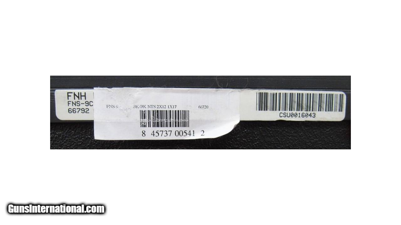 Description: Guns Listing ID: 553695 FN FNS-9C 9MM 12-ROUND MAG 3.5\" BARREL STRIKER-FIRED SEMI-AUTO PISTOL INCLUDES FACTORY CASE W/ OWNER‚‚S MANUAL + 1 ADDITIONAL 17-ROUND EXTENDED MAGAZINE The FN FNS-9C is a compact version of the standard FNS-9 pistol. This model has white 3-dot sights with no external safety, however it does have fully ambidextrous slide and magazine releases. It has an accessory mounting rail located beneath the barrel along with a serrated trigger guard to allow for a steady grip. This model includes 2 interchangeable backstraps to fit most hand sizes SOLD Manufacturer: FN Model: FNS-9C Caliber Info: 9MM LUGER (9X19 PARA) Condition: Used - Non-Certified Barrels: 3.6 BARREL Finish: BLACK |