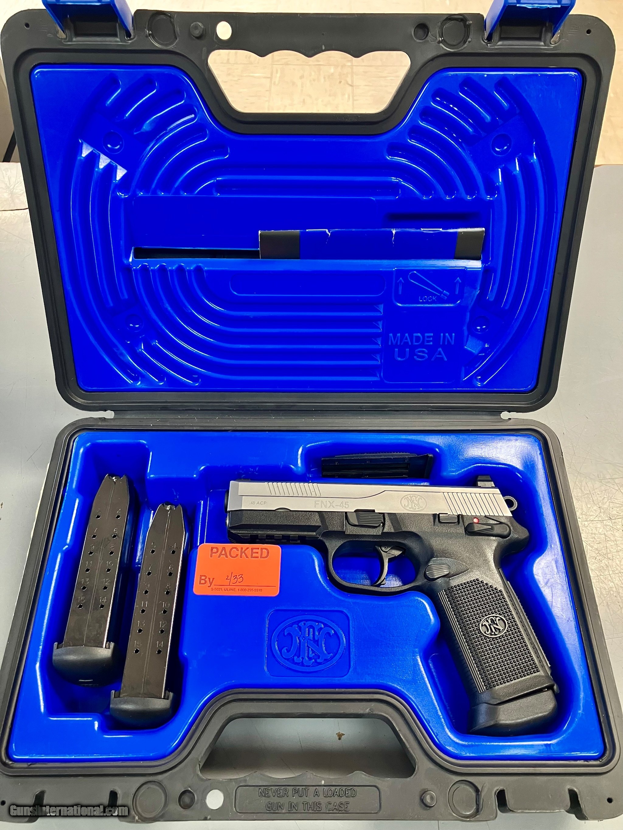 Description: Guns Listing ID: 1196388 FN FNX-45 45acp pistol in excellent condition. It has rear night sights. It comes with 3-15 round FN mags and the factory box with manual. (Top 1) SOLD Manufacturer: FN Model: FNX-45 Caliber Info: .45 ACP Condition: Used - Non-Certified Barrels: 4.75 BARREL Finish: STAINLESS & BLACK |