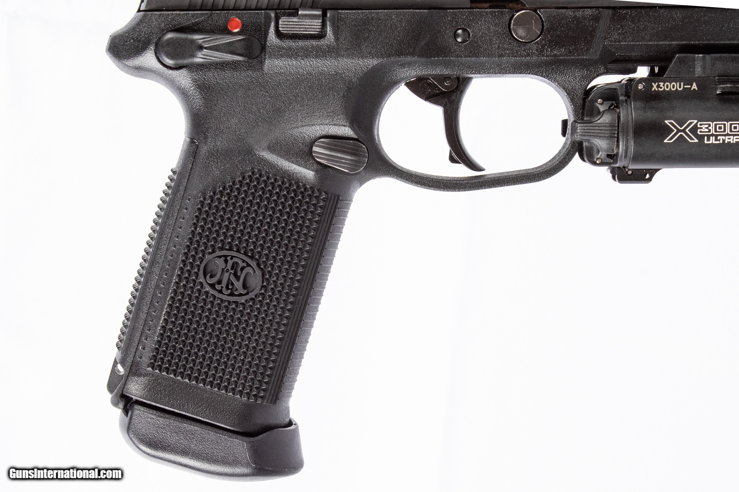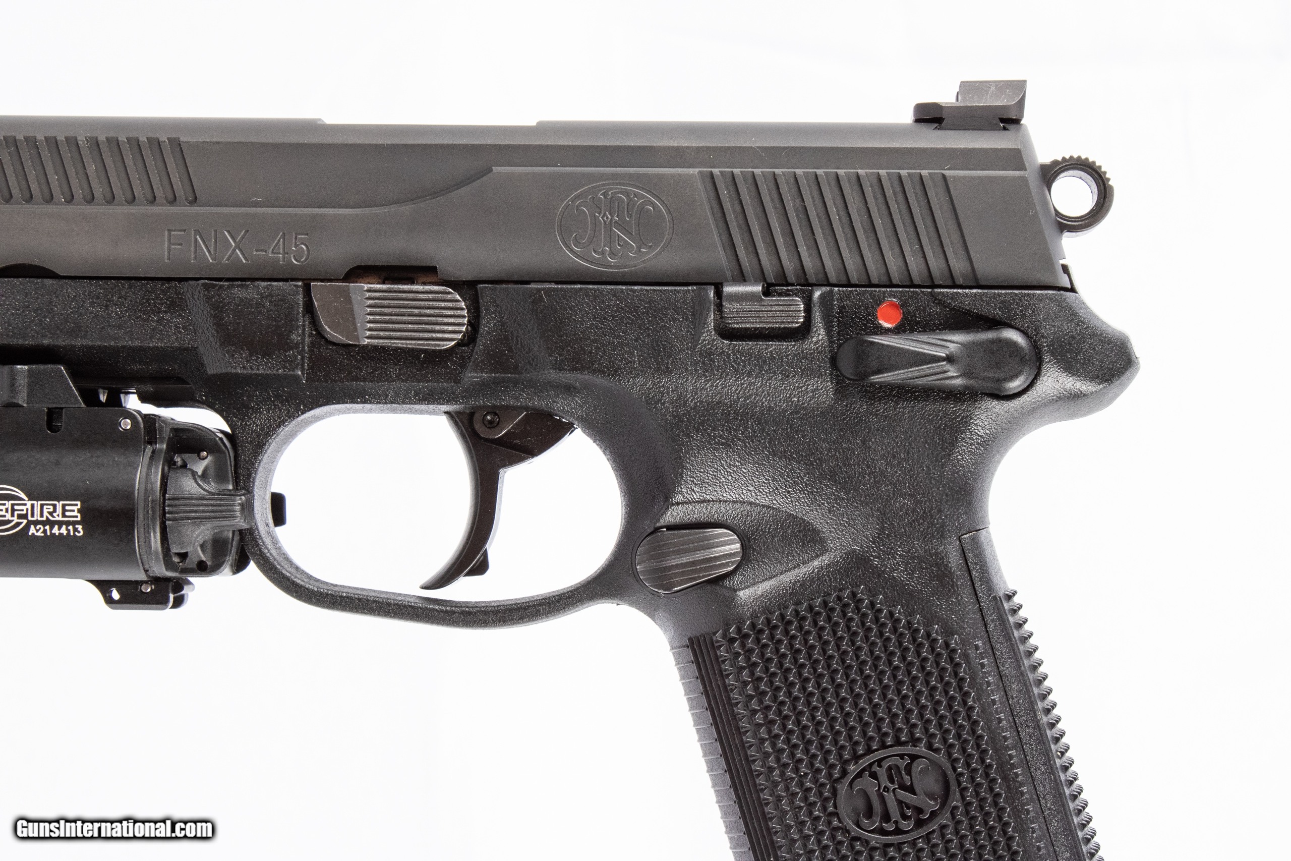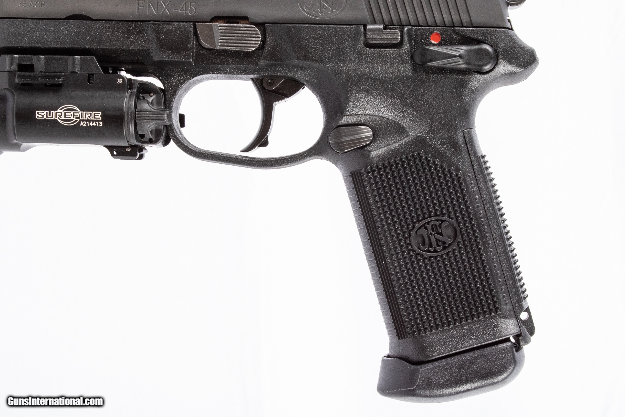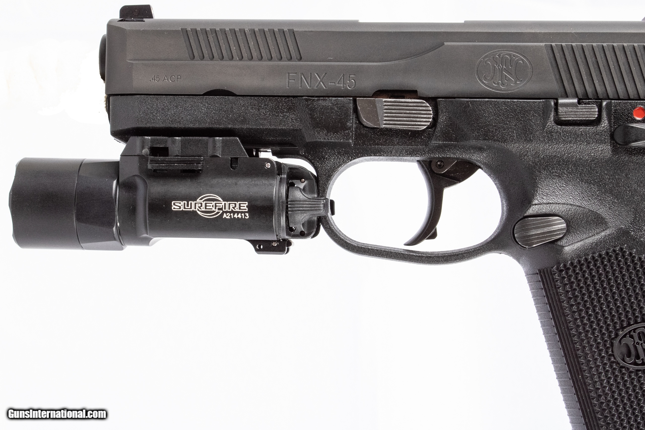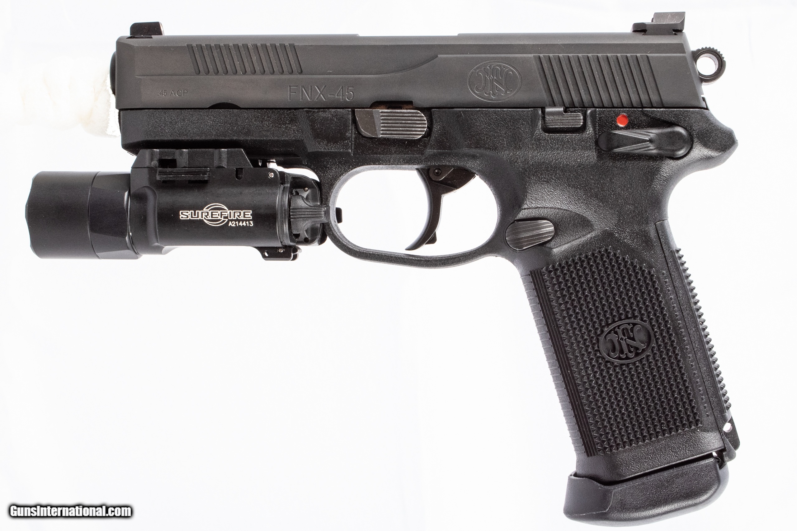Description: FN FNX-45 chambered in 45ACP with a 4 1/2 inch barrel, bright & shiny bore, 2 extra magazines and a Surefire X300 Ultra. The NRA grading condition for this USED firearm is Excellent. Dury's Lifetime Warranty: All firearms purchased from Dury’s Gun Shop, NEW or USED, are covered by a lifetime warranty. We will repair or replace, at our discretion, any firearm purchased from Dury’s Gun Shop, Inc. for as long as it is owned by the purchaser. This warranty is not transferable. WE BUY GUNS! NO COLLECTION TOO BIG OR SMALL FOR OUR GUNS INTERNATIONAL CUSTOMERS ALL OF OUR FIREARMS CAN BE PURCHASED DIRECTLY FROM OUR DURY'S GUNS ! SOLD Manufacturer: Fabrique Nationale Herstal Model: FNX-45 Caliber Info: 45 ACP Barrels: 4inches |