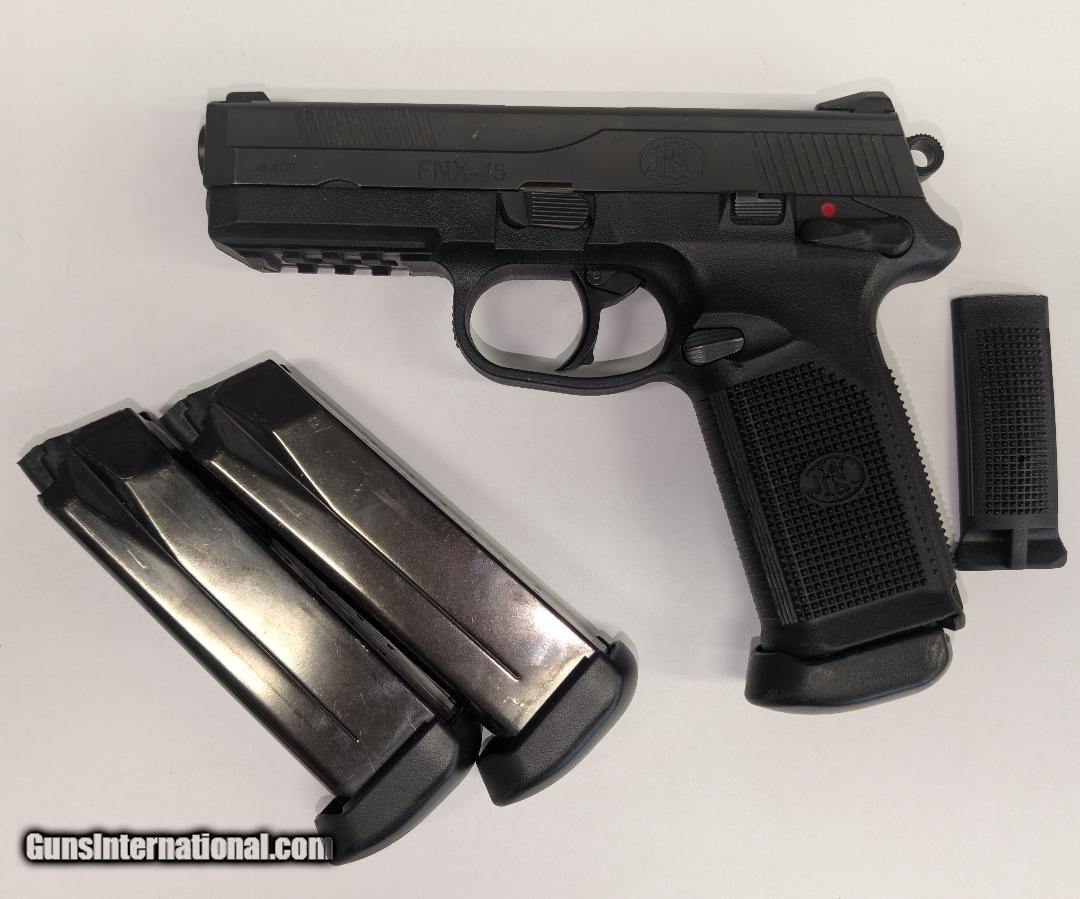 Description: Guns Listing ID: 525395 FN FNX-45 .45 ACP Pistol 4.5\", Black Manufacturer: FNH Weight: 33.2 oz Material: Polymer Hand Orientation: Right Color: Black TS Dimensions Length: 7.4\" Caliber Multi: .45 ACP Firearm Action: Single/Double Firearm Type: Pistol Magazine Capacity: 15 Firearm Barrel Length: 4-1/2\" Sights: 3-Dot Fixed Number of Magazines: 2 Twist Rate: 1:16\" RH Series/Collection: FNX-45 Grip Type: Interchangeable Backstrap Slide: Black Stainless Steel Safety: Manual, Decocker Barrel Type: Cold Hammer Forged Barrel Material: Forged Stainless Steel Includes: (2) 15-Rounds Magazines with Extended Base Pad, Owner‚‚s Manual, Locking Device, Lockable Fitted Hard Case Application: Commercial, Law Enforcement and Military TS Dimensions Height: 6.3\" TS Dimensions Width: 1.58\ SOLD Manufacturer: FN Model: FNX-45 Caliber Info: .45 ACP Condition: Used - Non-Certified Barrels: 4.5 BARREL Action: SINGLE/DOUBLE Finish: BLACK Weight: 2.1 lbs. |