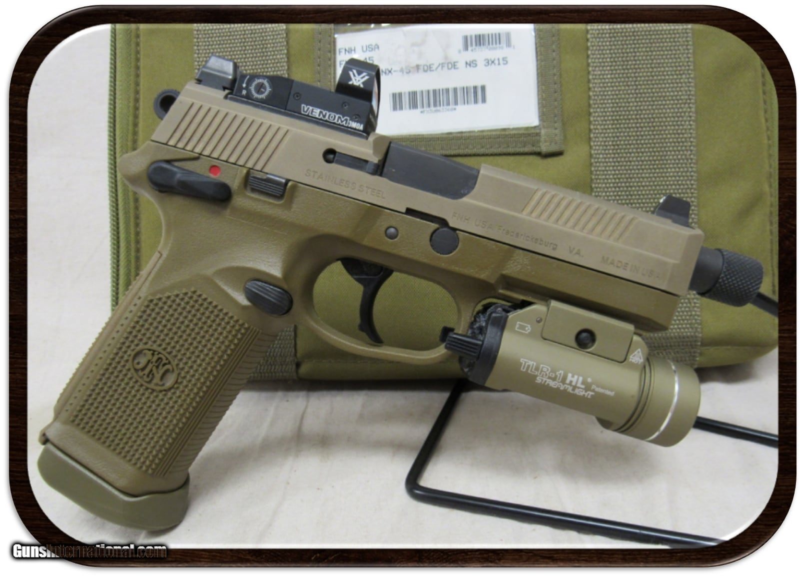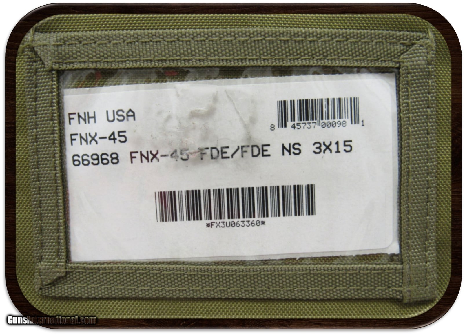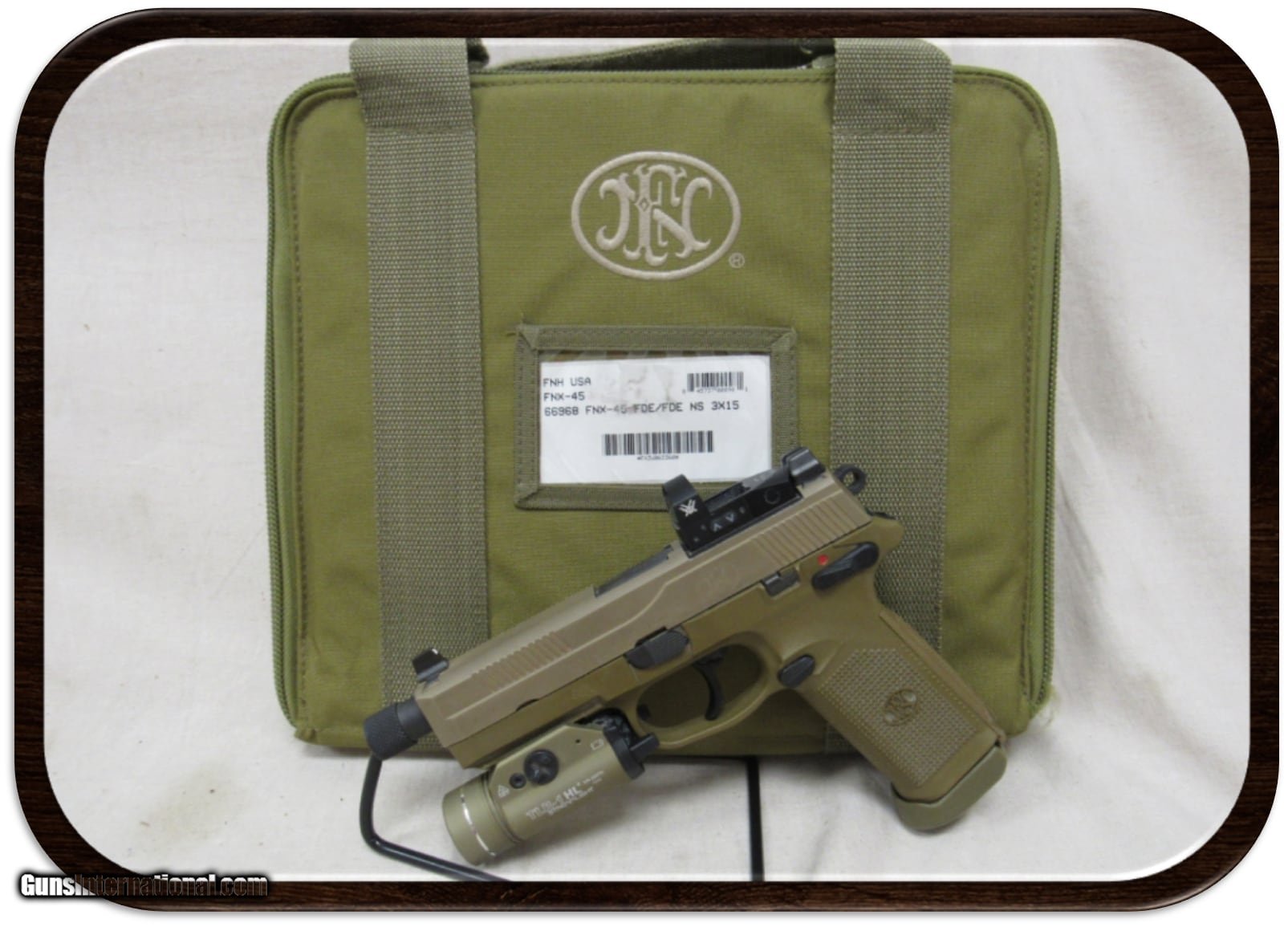 Description: Guns Listing ID: 914153 FN FNX-45 TACTICAL - 45 ACP - 15-ROUNDS - 5.3\" BARREL HAMMER-FIRED DA/SA SEMI-AUTO PISTOL INCLUDES FN SOFTCASE W/ OWNER‚‚S MANUAL + 2 MAGAZINES & ADDITIONAL BACKSTRAPS PREINSTALLED VORTEX 3MOA RED-DOT & STREAMLIGHT TLR-1 HL Developed for the U.S. Joint Combat Pistol Program, this FNH FNX-45 Tactical is a 100% American-made semi-auto handgun and improvement on the FNP-45 Tactical. With unmatched performance, it is chambered in 45 ACP and offers fully ambidextrous controls. The polymer frame utilizes a low-bore axis, which reduces recoil, improves control, and offers natural point-ability, while the stainless steel barrel has a threaded muzzle. An integral rail makes for easy mounting of accessories SOLD Manufacturer: FN Model: FNX-45 TACTICAL Caliber Info: .45 ACP Condition: Used - Non-Certified Barrels: 5.3 BARREL Finish: FDE |