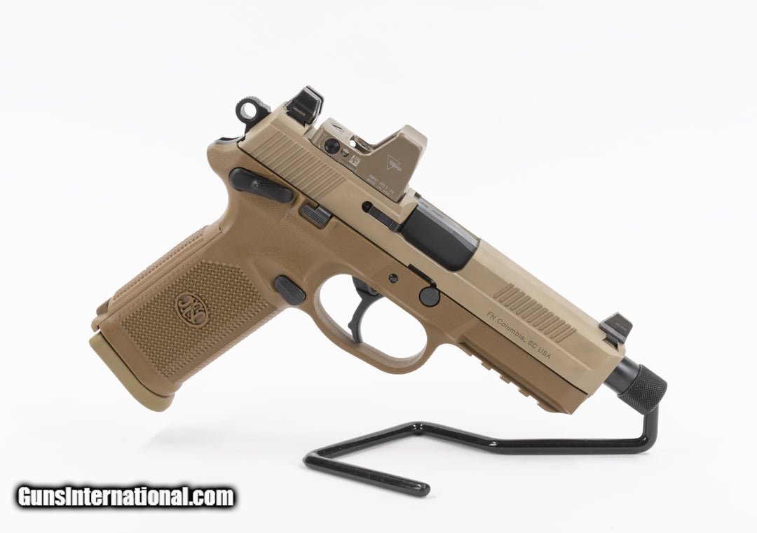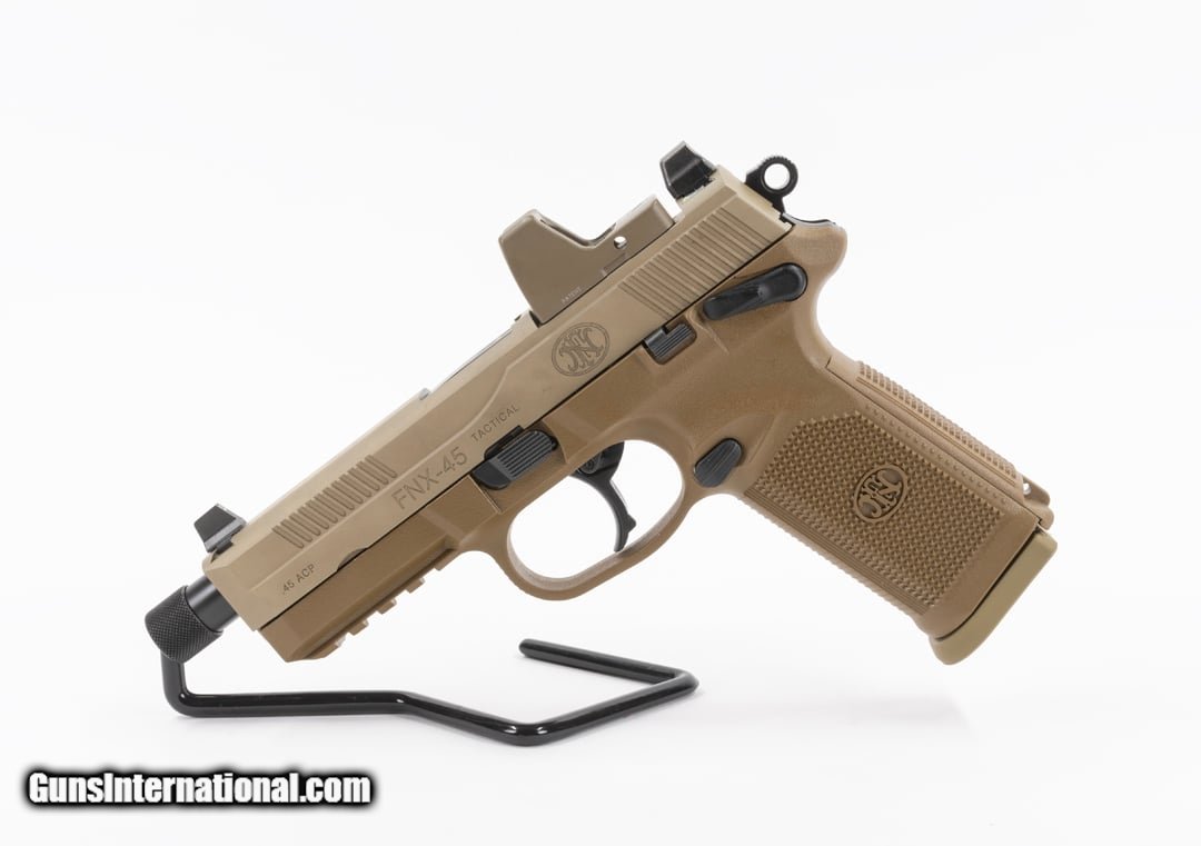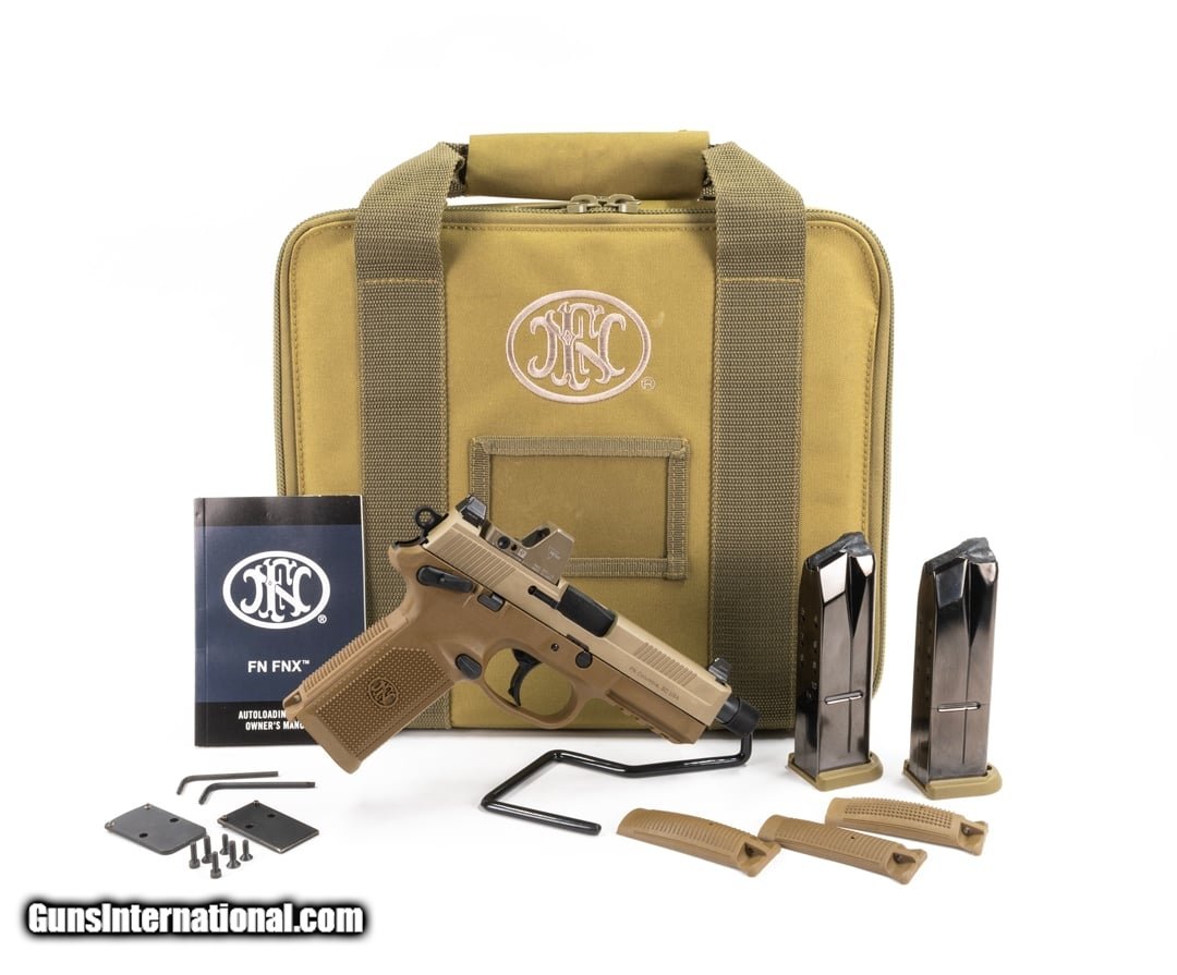 Description: Guns Listing ID: 1371016 Manufacturer: FN Model: FNX-45 Tactical Condition: Excellent Caliber: .45 ACP Action: DA/SA Barrel Length: 5.3\" (1:16\" RH Twist Rate) Overall Length: 8.6\" Capacity: 10+1 Features: Full size pistol, threaded barrel (.578×28 tpi), suppressor height night sights (Co-witness with red dot), fully ambidextrous controls, thumb safety with decocker, 1913 under rail Inventory: Firearm, Trijicon RM02 Red Dot sight, (2) 10-rd magazines, thread protector, (3) extra FDE back straps, (2) extra optics plates & tools included, FN soft carry case, manual, cable lock, trigger lock • Please be aware that we have not test fired this gun. Unless otherwise stated, expect this firearm to fire and function safely. SOLD Manufacturer: FN Model: FNX-45 TACTICAL Caliber Info: .45 ACP Condition: Used - Non-Certified Barrels: 5.3 BARREL Finish: FDE |