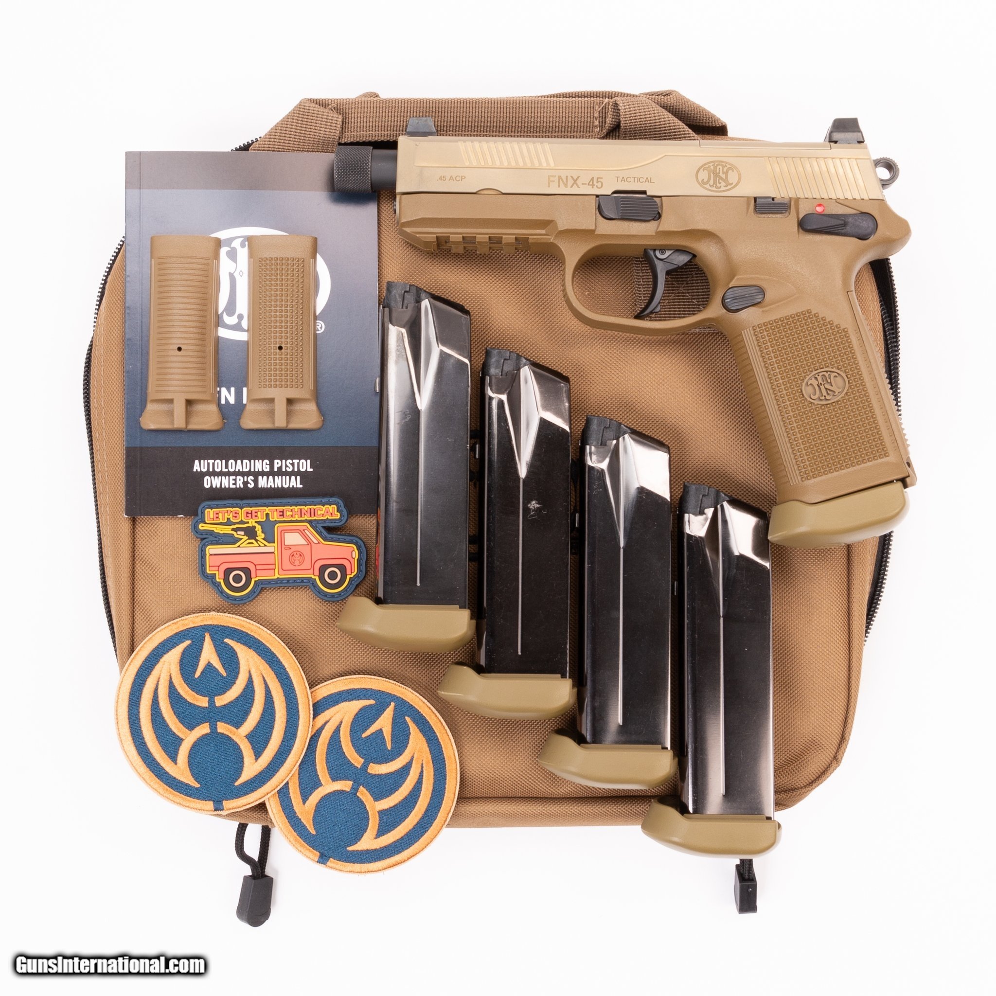 Description: Guns Listing ID: 470579 This FN FNX-45 Tactical features a threaded barrel. It includes the original case, box, and five 15-round magazines. Get the best bang for your buck when you get a Certified Used Firearm . When you see the Certified Used stamp on any of our firearms, you can be confident that you‚‚re getting exactly what you want – a gun only in very good to excellent condition and held to the highest quality standard. All Certified Used Guns come with a ‚‚no questions asked‚‚ return policy . PLUS, ALL CERTIFIED USED GUNS SHIP FR SOLD Manufacturer: FN Model: FNX-45 TACTICAL Caliber Info: .45 ACP Condition: Used - Certified Barrels: 5.30 Action: SEMI AUTOMATIC Finish: FDE Weight: 2 |