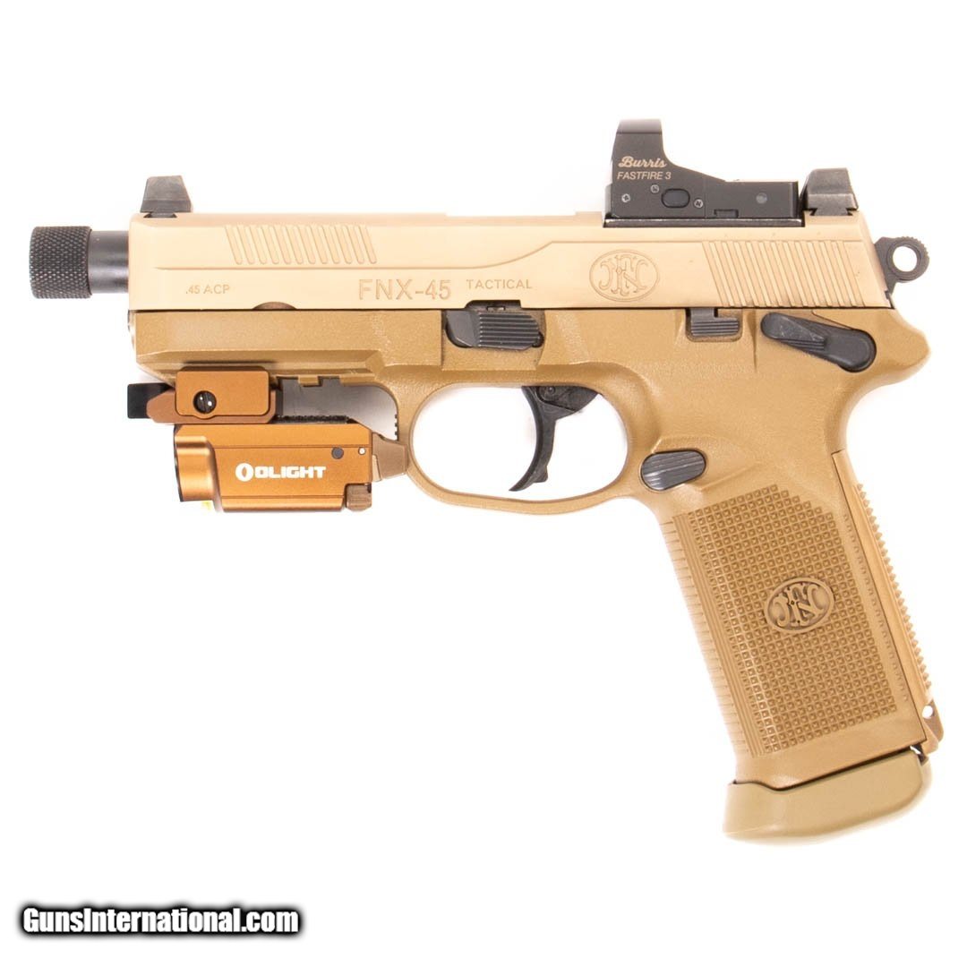 Description: Guns Listing ID: 502860 This FN FNX-45 Tactical is optic ready (with plates) and features an ambidextrous thumb safety and decocker, a threaded barrel with protector, a Burris Fastfire 3 red dot, and an Olight BALDR Mini (with a magnetic charging cable). Purchase includes the original soft case, owner‚‚s manual, and three 15-round magazines. Get the best bang for your buck when you get a Certified Used Firearm . When you see the Certified Used stamp on any of our firearms, you can be confident that you‚‚re getting exactly what you want – a gun only in very good to excellent condition and held to the highest quality standard. All Certified Used Guns come with a ‚‚no questions asked‚‚ return policy . PLUS, ALL CERTIFIED USED GUNS SHIP F SOLD Manufacturer: FN Model: FNX-45 TACTICAL Caliber Info: .45 ACP Condition: Used - Certified Barrels: 5.25 Action: SEMI AUTOMATIC Finish: fde Weight: 1.8 |