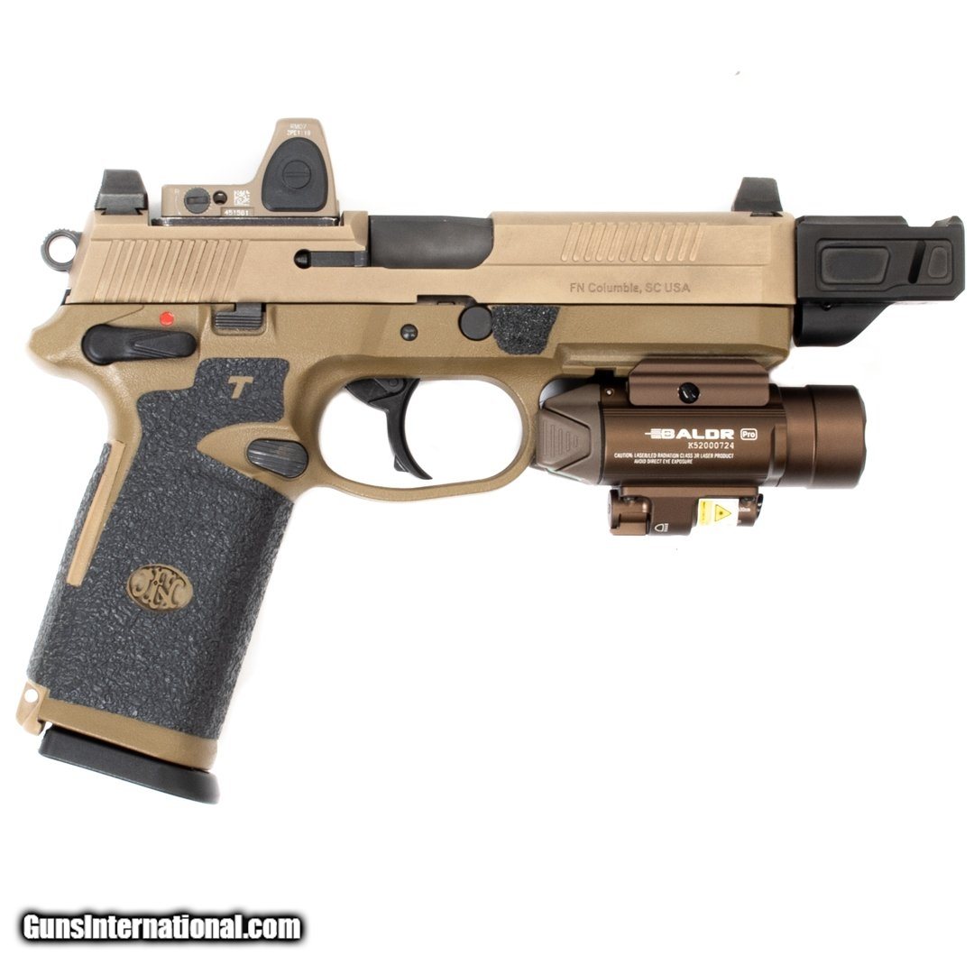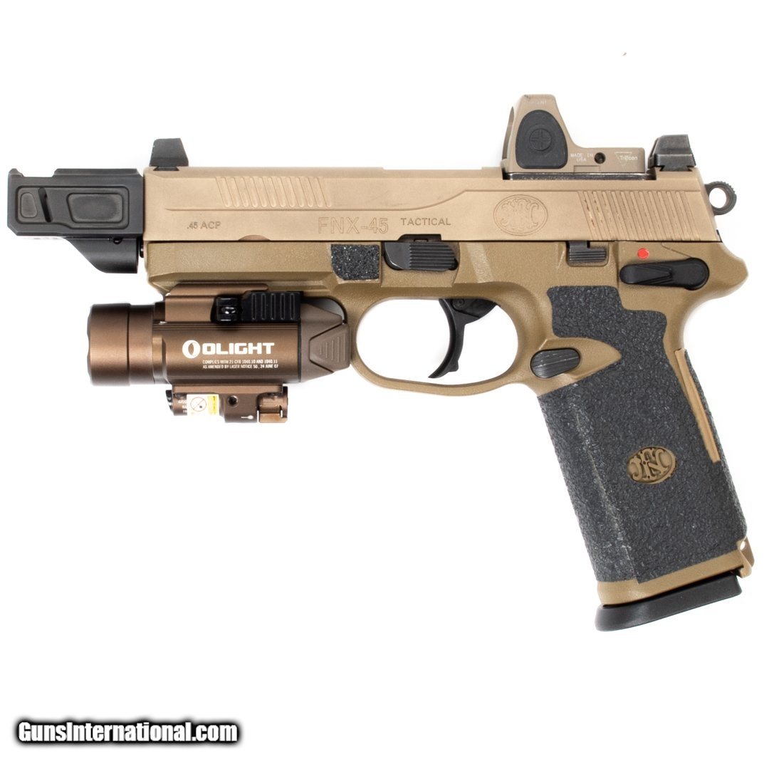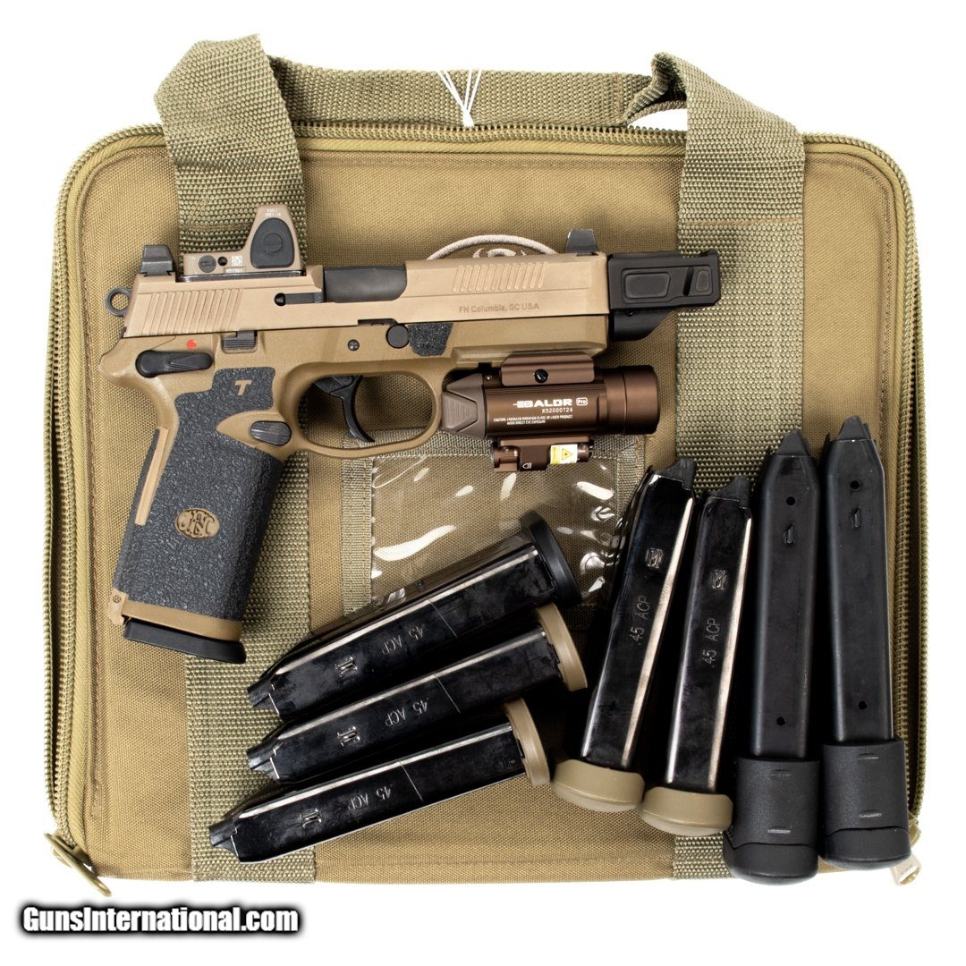 Description: Guns Listing ID: 537045 This FN comes with two extended 20-round magazines, two 15-round magazines, four 10-round magazines, ambidextrous controls, an ambidextrous safety de-cocker, 3-dot sights, a threaded barrel, a compensator and it‚‚s equipped with an Olight Baldor flashlight/green laser combo and a Trijicon RMo7 red dot optic. Get the best bang for your buck when you get a Certified Used Firearm . When you see the Certified Used stamp on any of our firearms, you can be confident that you’re getting exactly what you want – a gun only in very good to excellent condition and held to the highest quality standard. All Certified Used Guns come with a ‘no questions asked’ return policy . PLUS, ALL CERTIFIED USED GUNS SHIP FREE! SOLD Manufacturer: FN Model: FNX-45 TACTICAL Caliber Info: .45 ACP Condition: Used - Certified Barrels: 5.00 BARREL Action: SEMI AUTOMATIC Finish: fde Weight: 2.2 |