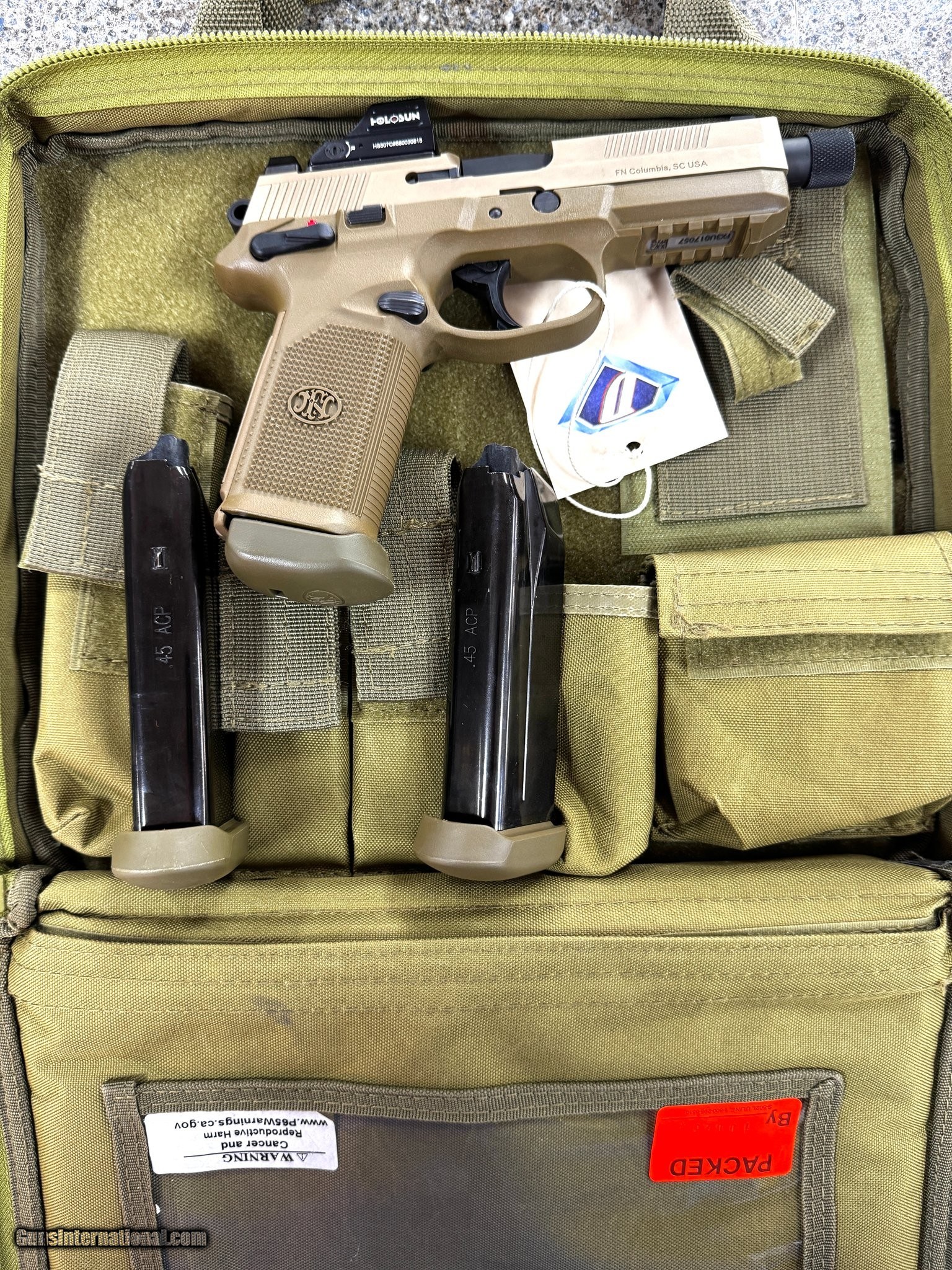 Description: Guns Listing ID: 558359 FNX-45 Tactical in FDE, .45 ACP pistol featuring a factory-threaded barrel, suppressor-height night sights, and optics-ready slide. Outfitted with a Holosun 507C red dot for fast target acquisition. Comes with three magazines. SOLD Manufacturer: FN Model: FNX-45 TACTICAL Caliber Info: .45 ACP Condition: Used - Non-Certified Barrels: 5.3" BARREL Action: SEMI AUTOMATIC Finish: fde |