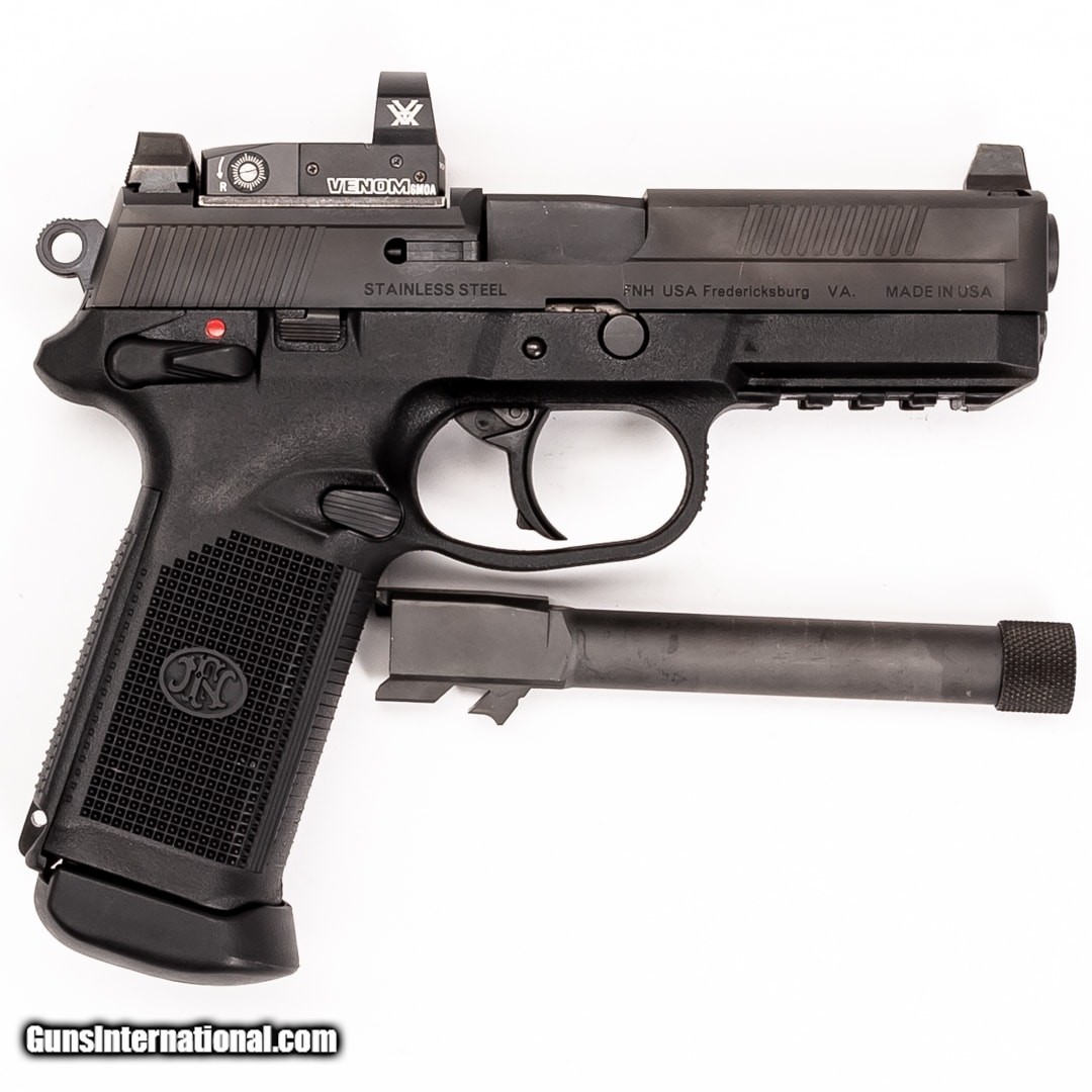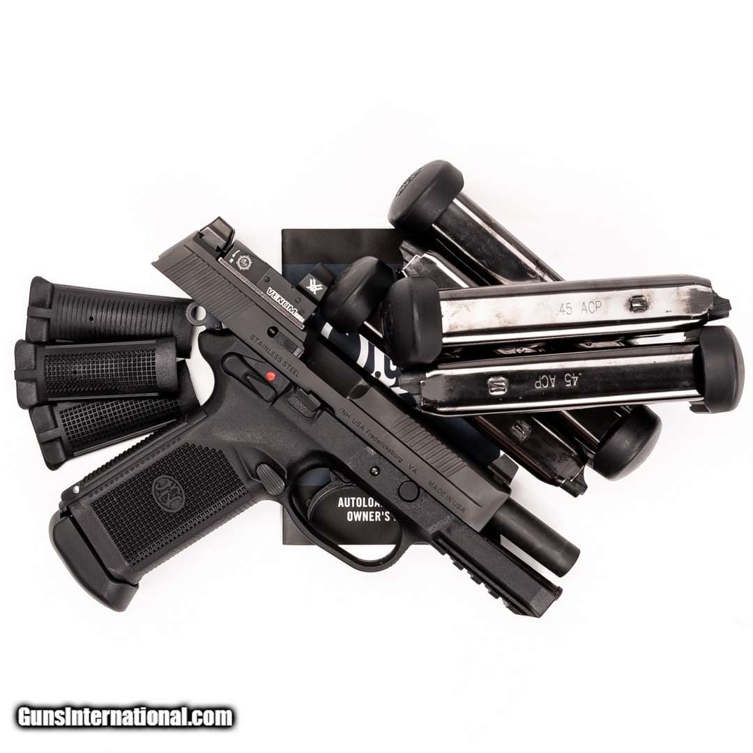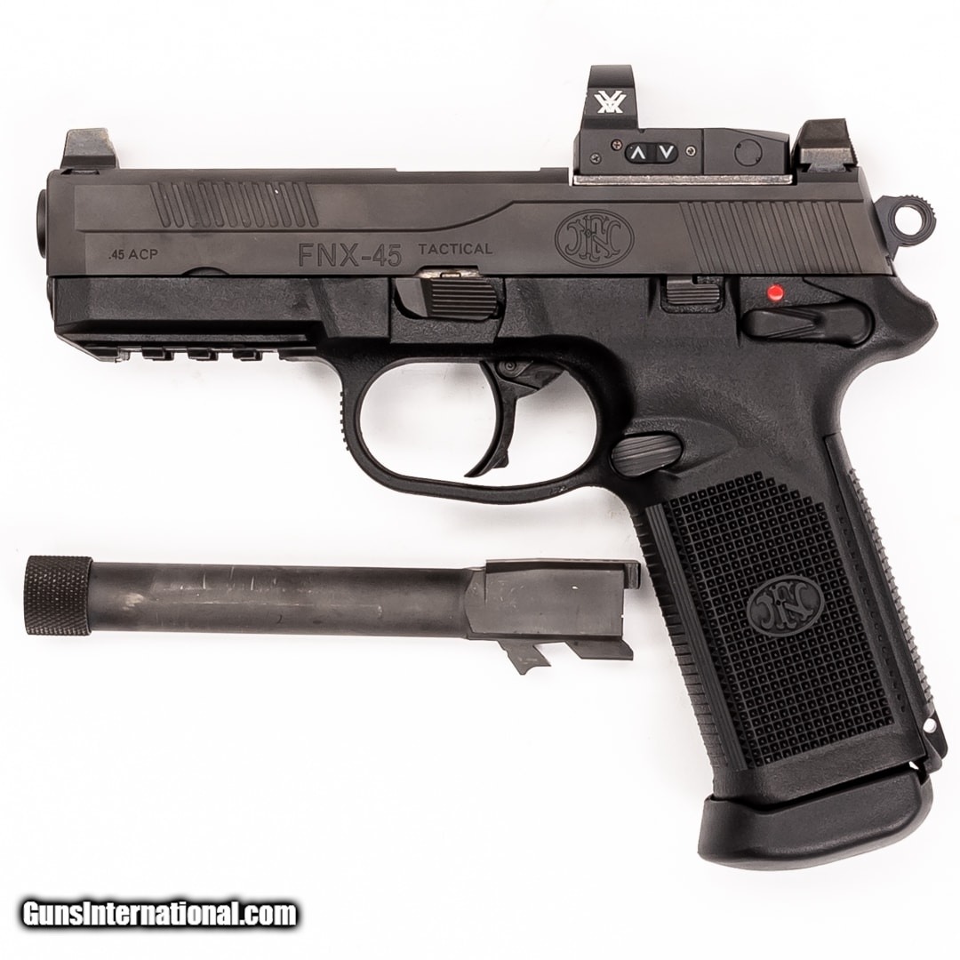 Description: Guns Listing ID: 343865 Developed for the U.S. Joint Combat Pistol Program, this FNH FNX-45 Tactical is a 100% American-made semi-auto handgun and improvement on the FNP-45 Tactical. With unmatched performance, it is chambered in 45 ACP and offers fully ambidextrous controls. The polymer frame utilizes a low-bore axis, which reduces recoil, improves control, and offers natural point-ability. This FNX-45 Tactical has a safety decocker, co-witness height sights, and a Vortex Venom 6 MOA red dot, which needs a battery. It is in very good condition and comes with six 15-round magazines, an extra threaded barrel with protector, four sizes of backstraps, plate kit, and the owner's manual. SOLD Manufacturer: FN Model: FNX-45 TACTICAL Caliber Info: .45 ACP Condition: Used - Certified Barrels: 4.5 BARREL Finish: BLACK |