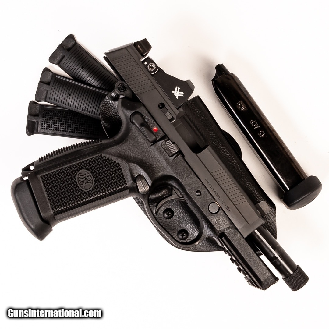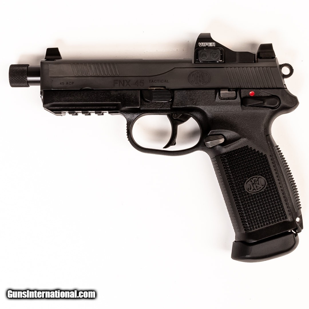 Description: Guns Listing ID: 469170 For sale is this FN FNX-45 Tactical, a semi-automatic handgun chambered in 45 ACP. It was designed for combat operations and will work well for self-defense, home defense, and duty use. This model has co-witness night sights and a Viper red dot. Purchase includes the original case, manual, two 15-round magazines, three extra backstraps, and a right-handed OWB Kydex paddle holster. SOLD Manufacturer: FN Model: FNX-45 TACTICAL Caliber Info: .45 ACP Condition: Used - Certified Barrels: 5.3 BARREL Finish: BLACK |