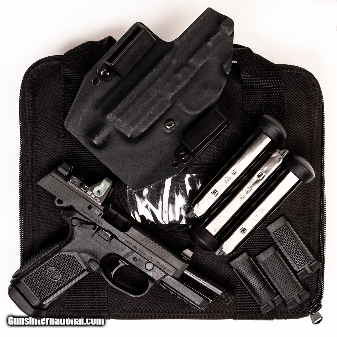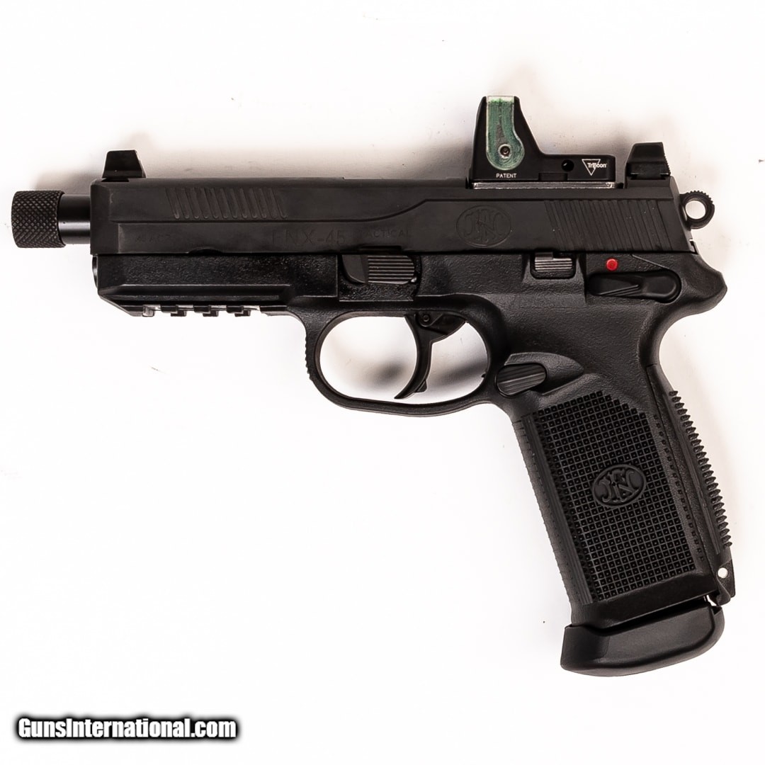 Description: Guns Listing ID: 475463 For sale is this FN FNX-45 Tactical, a semi-automatic handgun chambered in 45 ACP. It was designed for combat operations and will work well for self-defense, home defense, and duty use. This FNX-45 is equipped with night sights, a threaded barrel with protector, and a Trijicon Dual illuminated RMR08. The original case, manual, and four 15-round FN magazines are included. SOLD Manufacturer: FN Model: FNX-45 TACTICAL Caliber Info: .45 ACP Condition: Used - Certified Barrels: 5.3 BARREL Finish: BLACK |