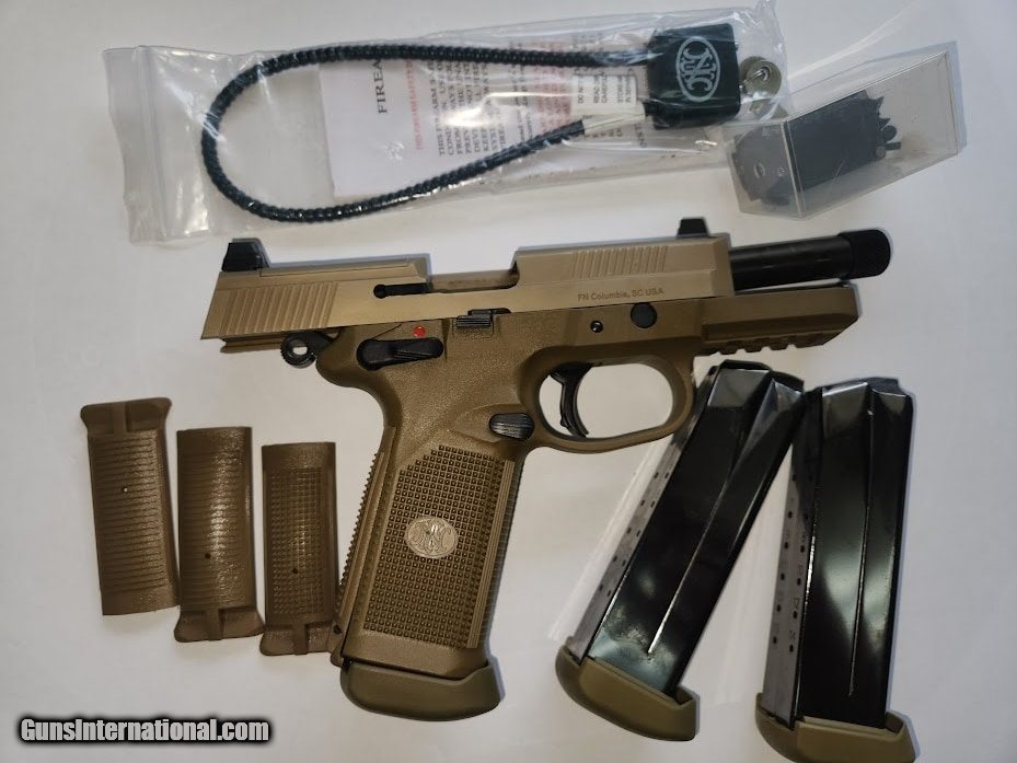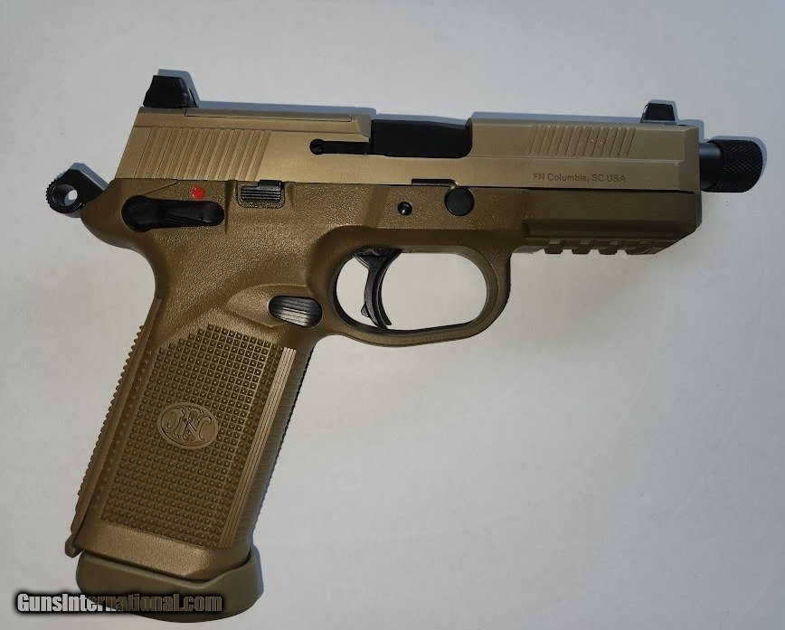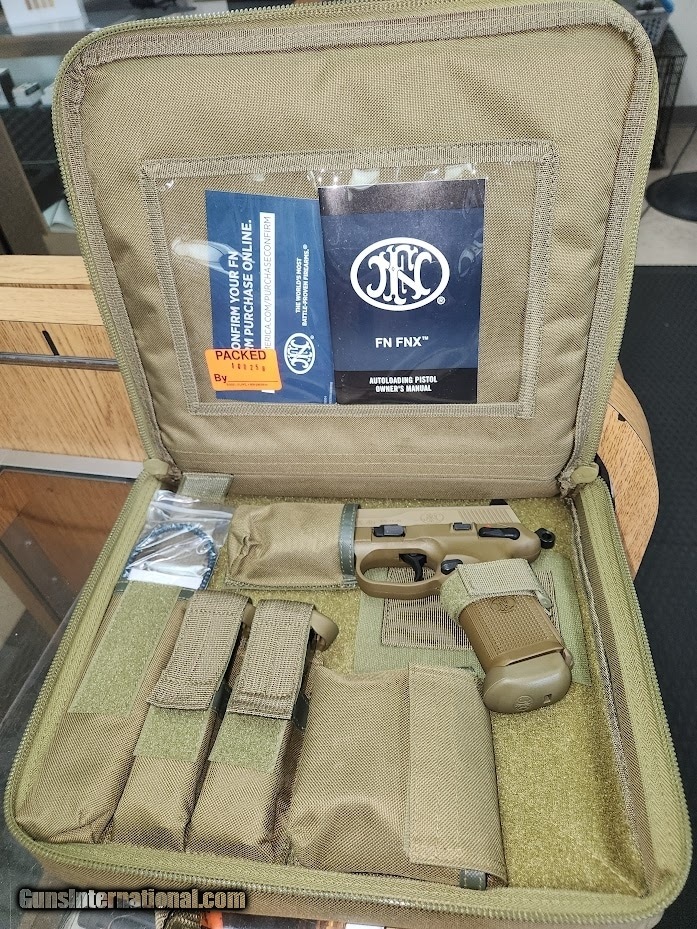 Description: Guns Listing ID: 901957 CALIBER: .45 ACP OPERATION: Double-action/Single-action MAG CAPACITY: 15 Rd. WEIGHT: 33.3 oz. BARREL LENGTH: 5.3? OVERALL LENGTH: 8.6? TWIST RATE: 1:16\" RH HEIGHT: 6.5\" WIDTH: 1.58\" SIGHT RADIUS: 6.4\" PRIMARY FEATURES Raised 3-dot Trijicon green tritium night sights The width of the raised night sights perfectly size up the shoulder width of a target at 25 meters Flat Dark Earth finish on slide and frame SLIDE Stainless steel construction External extractor with loaded chamber indicator Front and rear cocking serrations Slide cut and threaded for optional electronic red-dot sight (not included) Raised night sights for suppressor use BARREL Cold hammer-forged stainless steel Polished chamber and feed ramp Threaded .578×28 tpi with thread protector FRAME Polymer construction with replaceable steel frame/slide rails Four interchangeable backstraps with lanyard eyelets MIL-STD-1913 accessory mounting rail Serrated trigger guard OPERATING CONTROLS Fully-ambidextrous decocking/safety lever, slide stop lever, and magazine release MAGAZINE Polished nickel-coated steel body Low-friction follower Polymer base pad SIGHTS Fixed suppressor height 3-dot Trijicon green tritium night sights Includes two mounting bases for optional red-dot electronic sights SHIPS WITH Three 15-round magazines Fitted, soft Cordura® nylon case Owner’s manual Four interchangeable backstraps Locking device Sight mounting kit with plates and screws SOLD Manufacturer: FN Model: FNX-45 TACTICAL Caliber Info: .45 ACP Condition: Used - Non-Certified Barrels: 5.3 BARREL Finish: TAN |