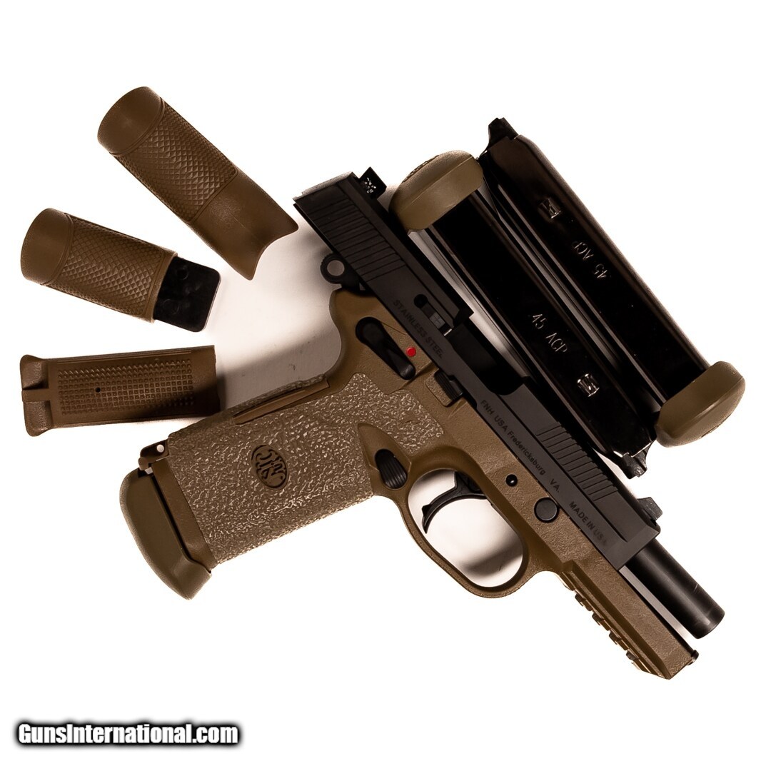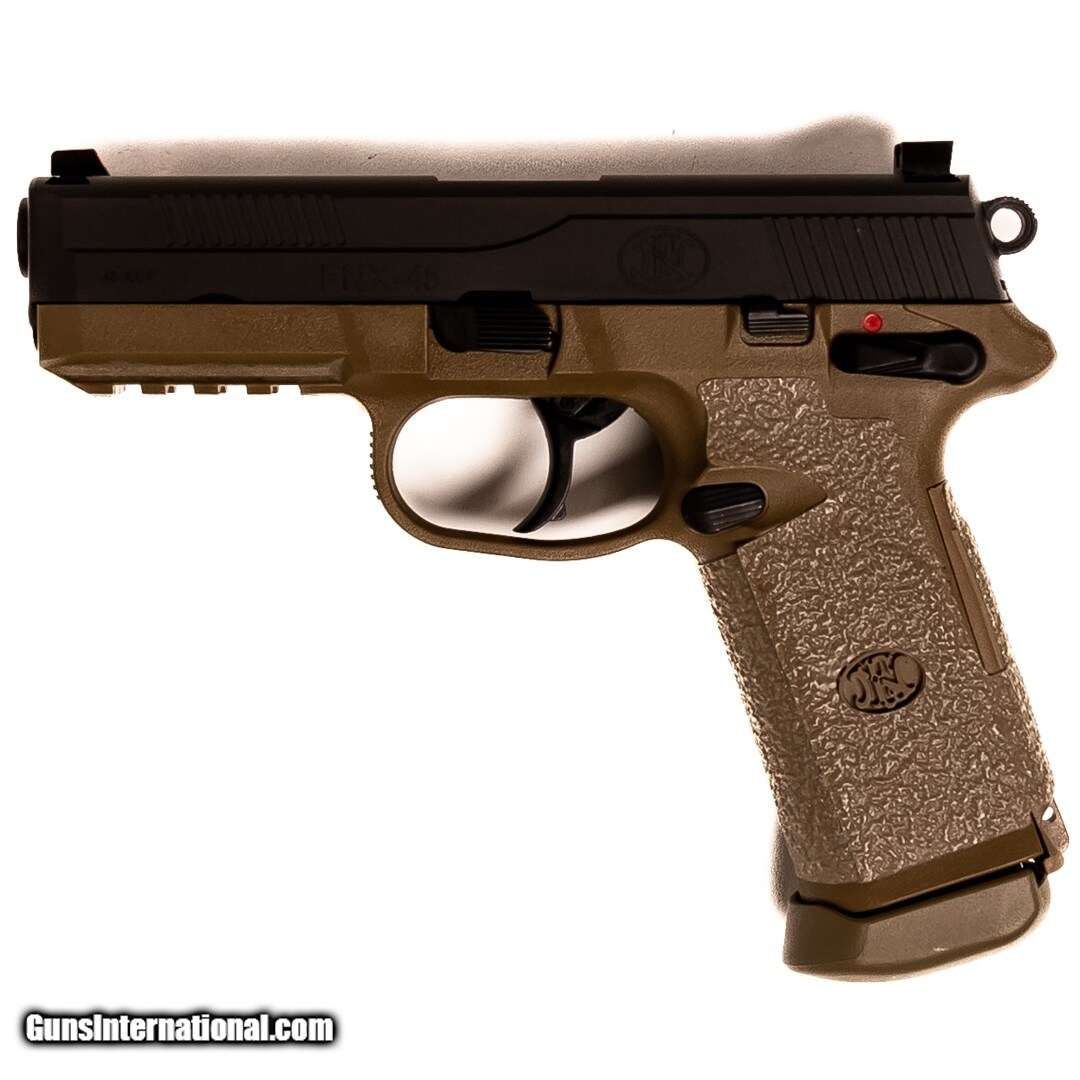 Description: Guns Listing ID: 692817 Battle-proven, tough and versatile, this FNX-45 is a semi-automatic pistol chambered in the venerable 45 ACP. This FNX-45 features Talon grips and Trijicon HD XR night sights. Purchase includes the original case, manual, and three 15-round magazines. Get the best bang for your buck when you get a Certified Used Firearm . When you see the Certified Used stamp on any of our firearms, you can be confident that you’re getting exactly what you want – a gun only in very good to excellent condition and held to the highest quality standard. All Certified Used Guns come with a ‘no questions asked’ return policy . PLUS, ALL CERTIFIED USED GUNS SHIP FREE! SOLD Manufacturer: FN Model: FNX-45 Caliber Info: .45 ACP Condition: Used - Certified Barrels: 4.5 barrel Finish: TWO-TONE |