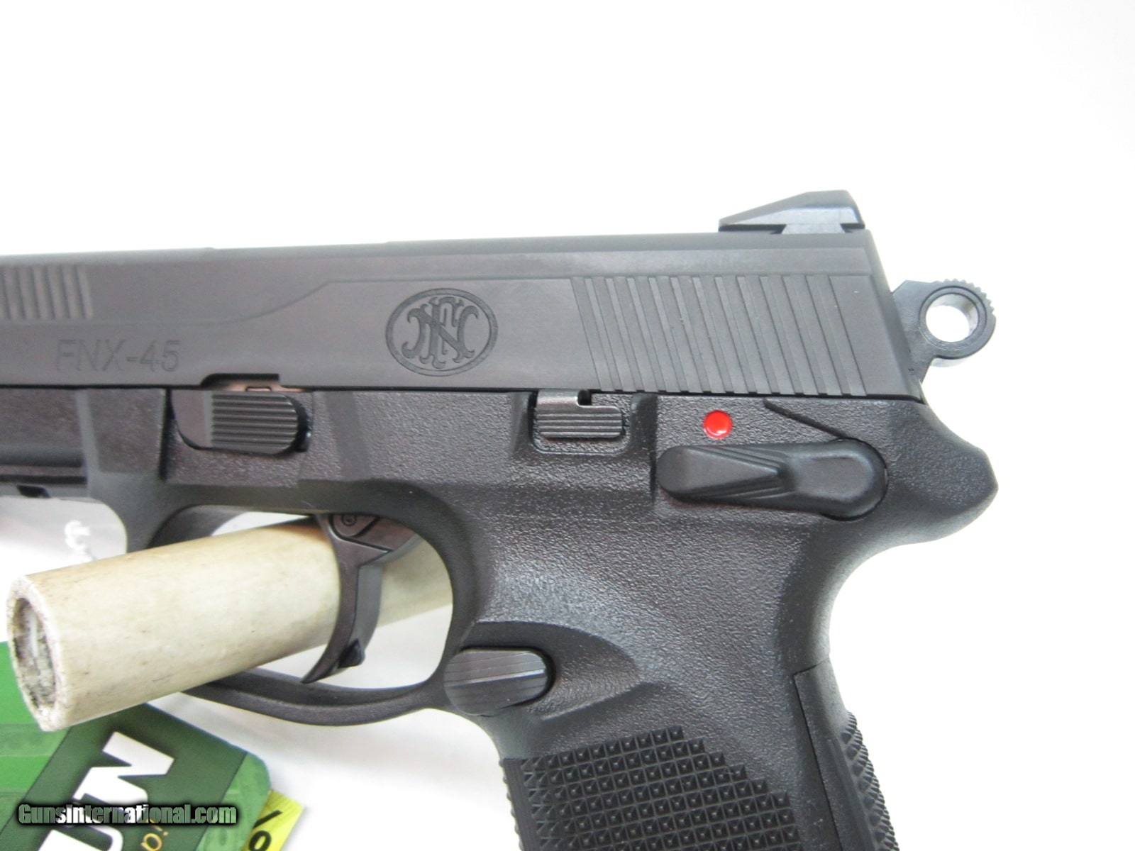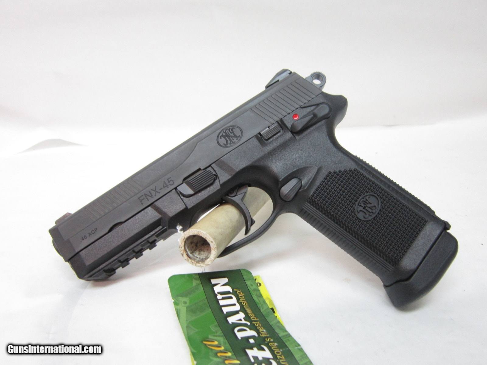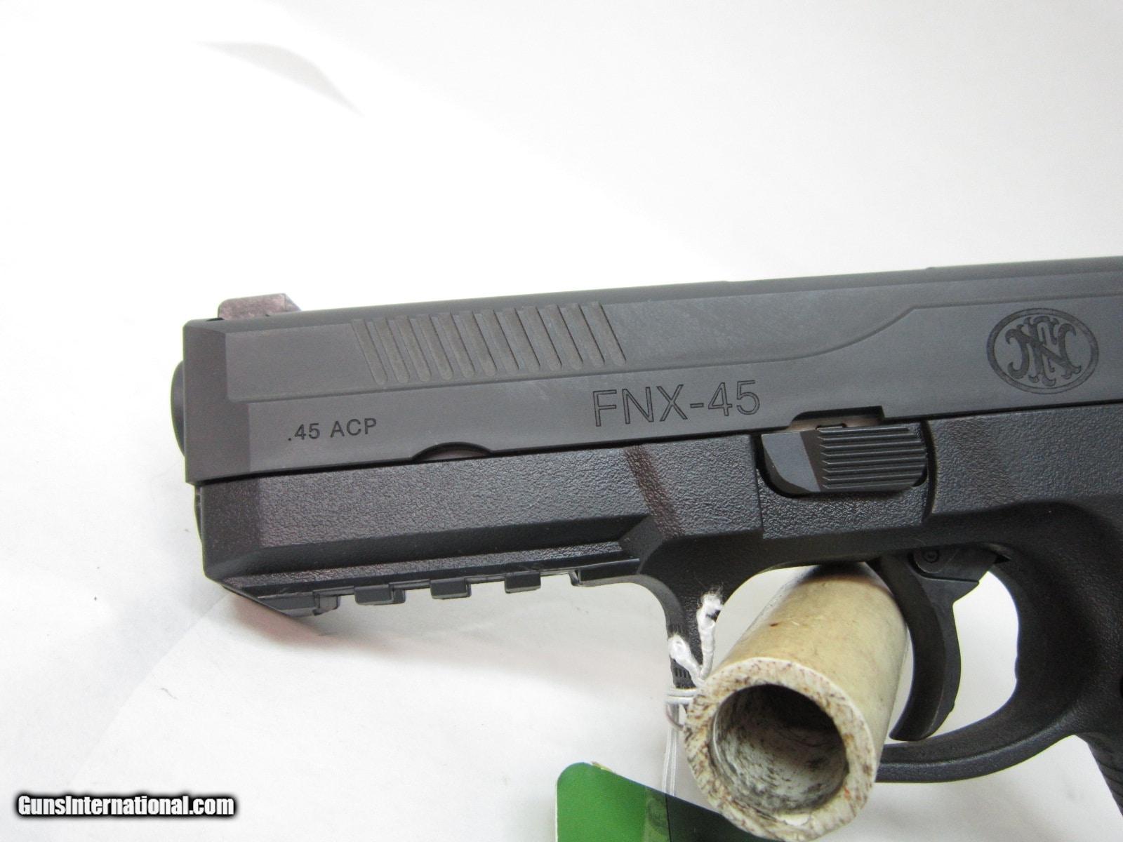 Description: Guns Listing ID: 805235 MAKE: FN FNH MODEL: FNX-45 ACTION: Double action semi auto CALIBER: .45 ACP FINISH: Black TYPE OF STOCK: N/A CONDITION: Very good BARREL LENGTH: 4 1/2\" OVERALL LENGTH: 7 3/4\" PULL LENGHT: N/A SCOPE: N/A SIGHTS: Factory three dot NUMBER OF MAGS: 3 CAPACITY: 15+1 CHOKE TYPE: N/A CASE: Factory box ACCESSORIES: N/A SERIAL #: FX3U176340 ADDITIONAL DESC: A very clean, very good condition duty pistol. Very good bore, chamber, and muzzle crown. The pistol will be shipped with three magazines and the factory box. This is the \"standard model\" pistol and it has NOT been machined for an RMR. Sorry, but we do not have the threaded barrel, ammunition, scope mount, optic, or any other tools or accessories for the pistol. While the pistol has been cleaned, lubed and inspected by our gunsmith, it has not been test fired. WARNING: This product can expose you to the chemical lead, which is known to the State of California to cause cancer and reproductive harm. For more information go to p65warnings.ca.gov (CA Health and Safety Code Section 25249.6). SOLD Manufacturer: FN America Model: FNX 45 Caliber Info: .45 ACP Condition: Used - Non-Certified Barrels: 4.5 BARREL Finish: BLACK |