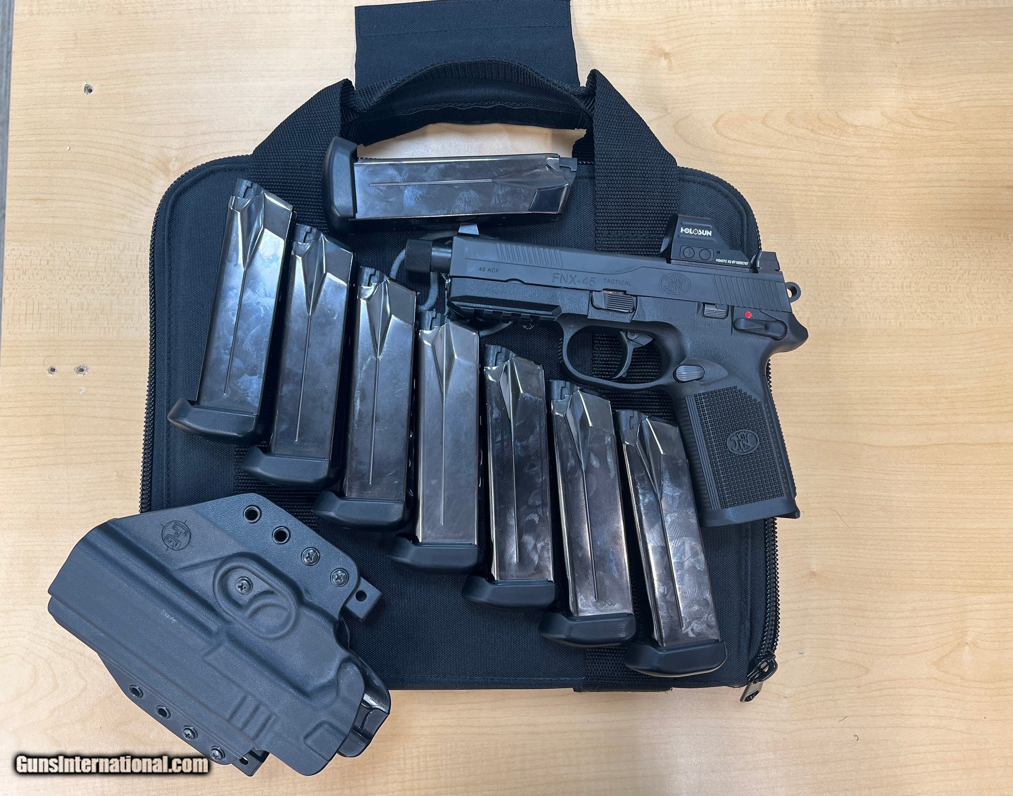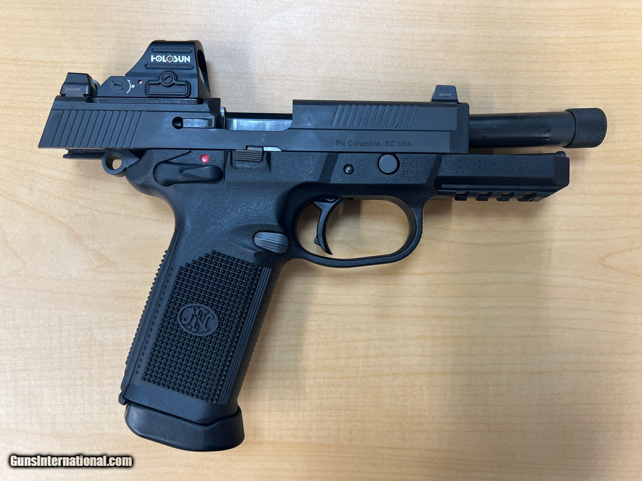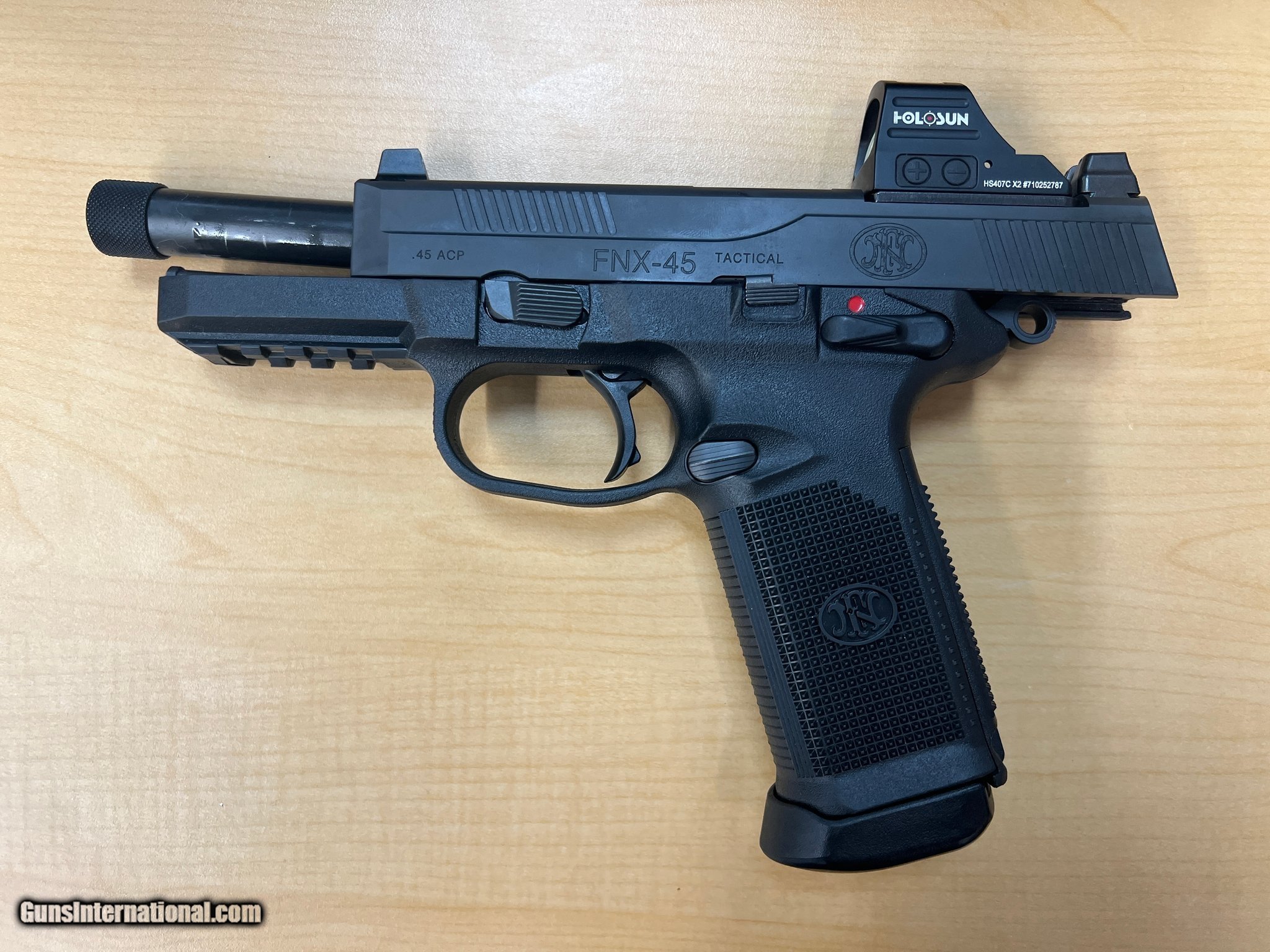 Description: Guns Listing ID: 1368810 This double action full sized firearm has ambidextrous magazine and slide releases, suppressor height night sights, a tactical rail under the 5in threaded barrel and a Holosun 407c red dot. It has eight 15rd magazines and a holster. Factory soft case included. SOLD Manufacturer: FN Model: FNX45 Caliber Info: .45 ACP Condition: Used - Non-Certified Barrels: 5 BARREL Finish: BLACK |