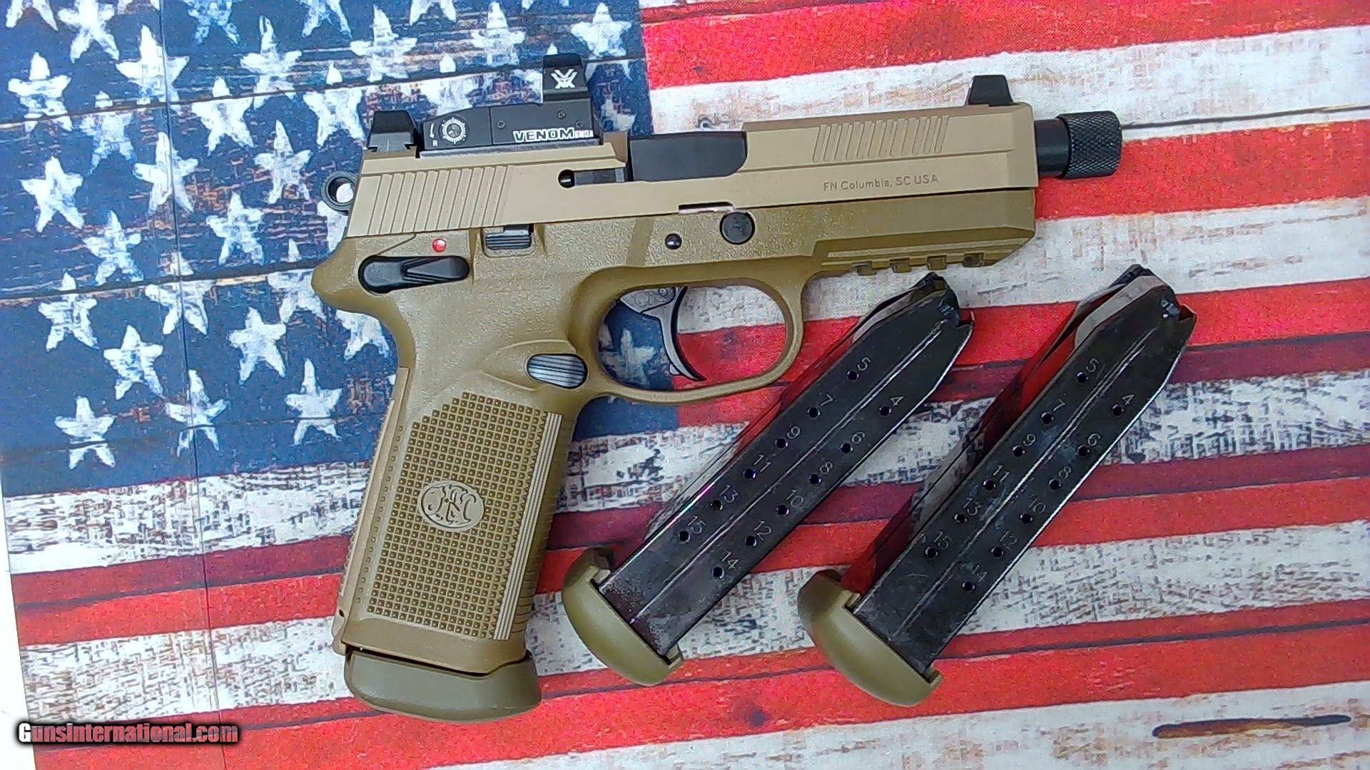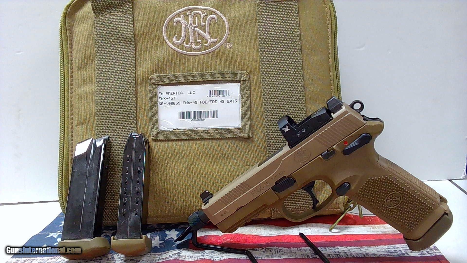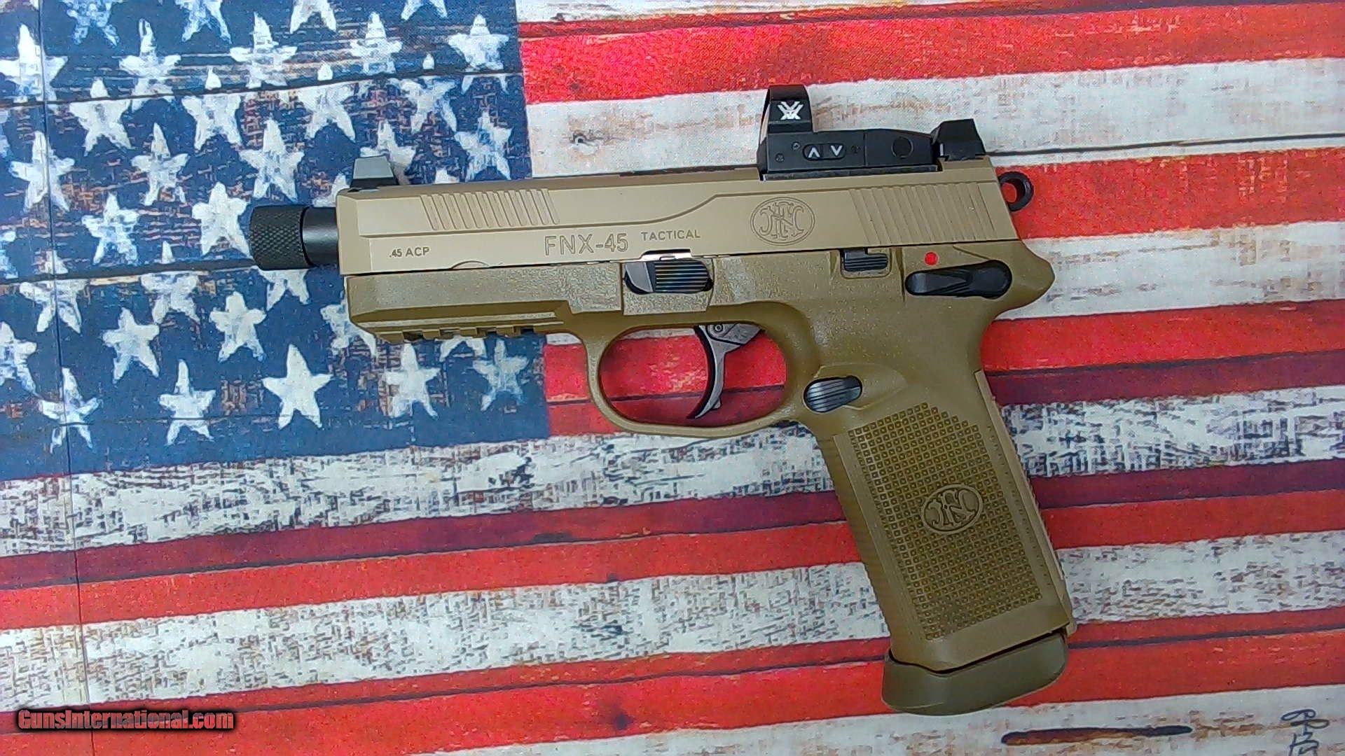 Description: Guns Listing ID: 1378810 ****This item is preowned and in very good condition. Original tactical case and 3-15rd magazines included.**** Like its legendary FN forefathers, this combat handgun was designed to not only survive the battlefield, but to emerge victorious. It is the latest in technological advancements in handgun engineering, offering .45 ACP performance and a host of unique features that no other handgun can match. Its 15-round magazine is precisely engineered to take a dive to the prone position and naturally roll up toward the target. The checkered polymer frame has a low-bore axis for reduced felt recoil, enhanced operator control, and a grip angle that provides unmatched natural point of aim. Four interchangeable backstraps come standard to quickly customize the grip feel. All operating controls are fully ambidextrous for ease of use. The 5.3 cold hammer-forged stainless steel barrel has a threaded muzzle to accept sound suppressors, compensators, and other accessories. The stainless steel slide has high-profile combat night sights. This model comes with the Venom Red Dot to make your AR, pistol or shotgun even more poisonous with the Venom Red Dot sight. A 6 MOA dot promotes rapid target acquisition while providing a precise point of aim getting shots down range and on target fast. MANUFACTURER: FN FAMILY: FNX-45 Series MODEL: FNX-45 Tactical TYPE: Semi-Auto Pistol ACTION: Double / Single Action CALIBER/GAUGE: 45 ACP FINISH: FDE FINISH TYPE: Other Finish FRAME: Polymer Frame STOCK/GRIPS: FDE Polymer BARREL: 5.3\" OVERALL LENGTH: 8.6\" CAPACITY: 15 + 1 # OF MAGAZINES: 2 MAG DESCRIPTION: 15 rd. SIGHTS: Trijicon Fixed 3-Dot SIGHT TYPE: Night Sights THREAD PATTERN: .578x28 SPECIAL: Threaded Barrel Model WEIGHT: 33.3 oz. SHIPPING WEIGHT: 5.3 lbs. SAFETY FEATURES: Ambi Decocking/Safety Lever CHAMBER: 45 ACP CASE: Fitted Soft Cordura Nylon Case Vortex Venom Optic Installed SOLD Manufacturer: FN Model: FNX45 TACTICAL Caliber Info: .45 ACP Condition: Used - Non-Certified Barrels: 5.3 BARREL |