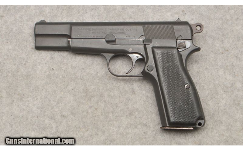 Description: This FN Herstal Browning Model GP-35 High Power military surplus semi auto pistol in 9MM Parabellum is in good condition. This GP-35 High power has been arsenal refurbished to military specs. The black rough satin finish slide and frame are good with various military proof marks. The 4.6" carbon steel barrel is good with sharp clear rifling in its bore. This GP-35 was a military grade pistol from the start, not a pristine gloss blue. This GP-35 also has the thumb indent on the slide, internal extractor and black Bakelite hand grips which dates it to 1958 and prior manufacture. The LH side of the slide is stamped Fabrique Nationale D'Arms De Guerre Herstal Belgique. Nowhere on this gun does it say High Power, but its appearance is typical High Power. This FN Herstal pistol does not come with a box or any other accessories. 9mm Parabellum SOLD Metal Condition: Good Bore Condition: Good Barrels: 4.6" Carbon Steel Triggers: Factory Curved Smooth S/A Stock Dimensions: LOP 3" Height 5" Length 7 3/4 Weight: 32 oz. Sights: Front Fixed Post with Rear Drift Adjustable Notch - Military Service Item Location: Dundee, MI |
