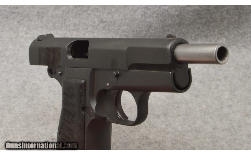 Description: This FN Herstal Browning Model GP-35 High Power military surplus semi auto pistol in 9MM Parabellum is in good condition. This GP-35 High power has been arsenal refurbished to military specs. The black rough satin finish slide and frame are good with various military proof marks. The 4.6" carbon steel barrel is good with sharp clear rifling in its bore. This GP-35 was a military grade pistol from the start, not a pristine gloss blue. This GP-35 also has the thumb indent on the slide, internal extractor and black Bakelite hand grips which dates it to 1958 and prior manufacture. The LH side of the slide is stamped Fabrique Nationale D'Arms De Guerre Herstal Belgique. Nowhere on this gun does it say High Power, but its appearance is typical High Power. This FN Herstal pistol does not come with a box or any other accessories. 9mm Parabellum SOLD Metal Condition: Good Bore Condition: Good Barrels: 4.6" Carbon Steel Triggers: Factory Curved Smooth S/A Stock Dimensions: LOP 3" Height 5" Length 7 3/4 Weight: 32 oz. Sights: Front Fixed Post with Rear Drift Adjustable Notch - Military Service Item Location: Dundee, MI |