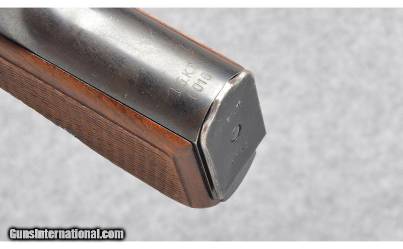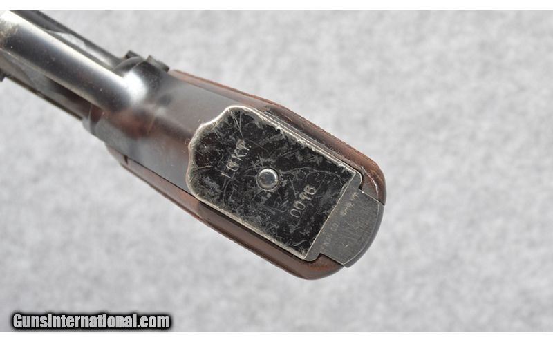 Description: Post War Hi-Power example features ring hammer, thumbprint slide and lacks magazine safety. Front strap and black painted magazine baseplate stamped with police unit numbers "L.G.K.T. 0016". Generous amount of original finish shows slight edge wear and scattered light rubs and scratches. 9mm Luger SOLD Chambers: N/A Metal Condition: Blue Wood Condition: Checkered Walnut Bore Condition: Bright Sharp Barrels: 4 .7 Inch Triggers: Single Action Auto Weight: 2 lb 1 oz Sights: Fixed Sights Chokes: N/A Item Location: Buda, TX |