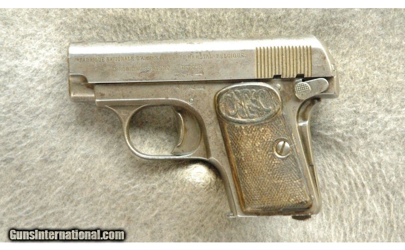 Description: SOLD Caliber Info: .25 Auto Metal Condition: Fair, Finish Wear, Nicks and Scratches, Few Areas of Light Corrsion Wood Condition: Grips are in Fair Condition, Small Nicks and Dents Barrels: 2 Triggers: Single Action with Grip Safety Stock: FN Grips Weight: 16 Ozs Sights: Fixed Sight Channel Extras: With one mag, no box Item Location: La Vista, NE |
